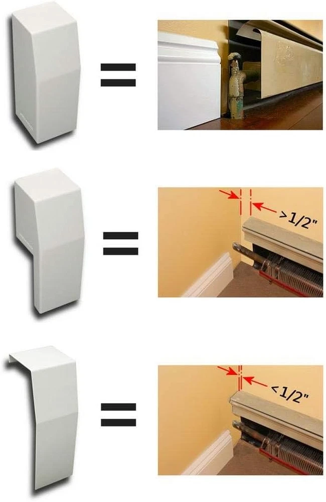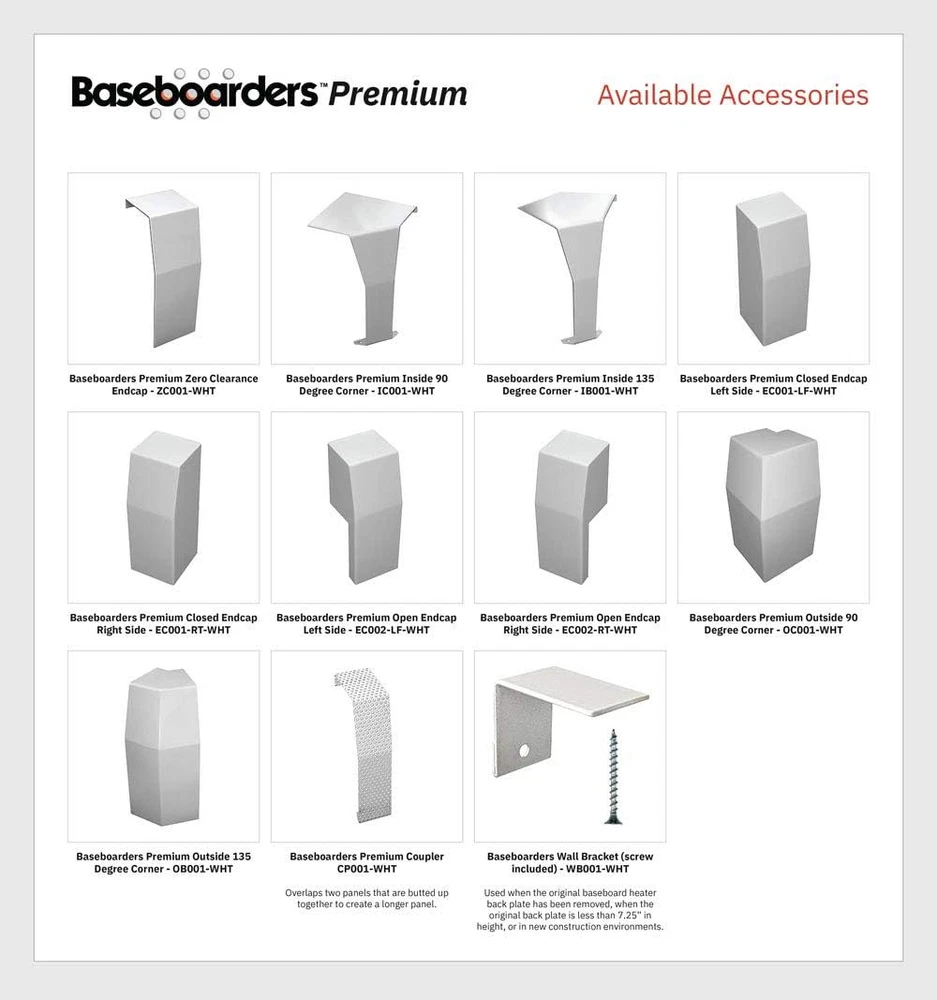 Store New Arrivals Add to Favorite View Feedback Contact Premium Series Left Closed Endcap Accessory - Galvanized Steel Easy Slip-On Baseboard Heater Accessory for Covers [Cover Sold Separately] Description Item model number EC001-LF-WHT Part Number EC001-LF-WHT Power Source corded electric Size Name Accessory Color Left Closed Endcap Material Galvanized Steel Size Accessory 🏠 LEFT CLOSED ENDCAP ACCCESSORY: For use with our premium baseboard heater covers. Perfect for finishing the premium asthetic on the left side of the cover. Comes as part of the L&R Bundle Kit. 🏠 PREMIUM SERIES IS PERFECT IN BATHROOMS: The premium series comes with a against rust, and is perfect in humid rooms like bathrooms. The Premium Series provides a clean and modern aesthetic at the right price. 🏠 PREMIUM COVERS AND ACCESSORIES: Baseboarders Premium Series covers and all accessories are only compatible with our own branded Premium Series products. By using only our branded products we ensure the best fit, and safety 🏠 HIGH QUALITY GALVANIZED STEEL: All Baseboarders products use galvanized steel with a powder coated semi-gloss white finish. Panels are fabricated with 22 gauge galvanized steel and end caps with 18 gauge galvanized steel. Premium panel holes are 1/8 inch in diameter to allow proper airflow 🏠 EASY INSTALLATION: Our easy slip-on installation covers work for both hydronic and electric baseboard heaters. Electric baseboard heaters tend to operate at higher surface temperaturs so the surface may be hot to the touch when in use. Product Description Breathe New Life Into Your Old, Dented and Rusted Baseboard Heaters With Our Simple, Easy-to-Install Baseboarders Premium Series Steel Covers Amazingly Durable Each Baseboarders Premium panel and accessory is made of hiqh quality steel , is professionally powder-coated and is warrantied not to rust . Designed with Safety In Mind Single piece panel construction ensures proper airflow around the heating element while prohibiting direct access to it, making it safer for children and pets . Easy Slip-on Installation Installation is an easy DIY project, requiring no tools or hired help. Simply remove the existing baseboard heater endcaps and front cover panel, snap your new Baseboarders Endcaps onto your Baseboarders panel, position the Baseboarders assembly onto the original back plate & push down firmly into place, that's it β€” you're done! Baseboarders Premium Series Provides a Clean and Modern Aesthetic - Our Most Versatile and Popular Product Line Baseboarders Premium Series...Designed for Form and Function 2', 3', 4', 5', 6' & 7' standard panel lengths ( 6.75'' H x 3'' D) Made with high quality rust resistant galvanized steel Powder coated semi-gloss white finish Panels can be custom cut for shorter lengths with tin snips The Premium Series offers the most flexibility and will solve most installation challenges. It is available in every common panel length and every accessory you may need. Baseboarders Premium provides a clean, modern aesthetic at the right value. Accessories include open Endcaps, Zero Clearance Endcaps, Inside Corners, and Outside Corners. Look For These Baseboarders Premium Series Accessories Premium Open Left and RightEndcap (EC002-LF-WHT, EC002-RT-WHT) Premium Closed Right and Left Endcap (EC001-RT-WHT, EC001-LF-WHT) Premium Coupler (CP001-WHT) Premium Zero Clearance Endcap (ZC001-WHT) Premium Inside and Outside 90 Corner (IC001-WH, OC001-WHT) Premium Inside and Outside 135 Corner (IB001-WHT, OB001-WHT) Wall Brackets (WB001-WHT) Note: Only Baseboarders brand Premium accessories fit Premium panels. Retrofitting Guide to Ensure Proper Fit / Measuring for Length and Layout STEP 1: Remove one endcap and the front panel. Measure between the floor and the top of the heater. Objective: 7.5" or greater If less than 7.5" use the Wall Brackets (WB001) for mounting. This will bring the height up by a minimum of 1.25". STEP 2: Measure from the bottom of the heating element to the top of the heater. Objective: Between 5β€³ and 6.75β€³ If less than 5β€³ use the Wall Brackets (WB001) for mounting. If the distance is greater than 6.75β€³, the Premium TALL profile should be used. STEP 3: Measure from the outside face of the finned tube heating element to the back plate. Objective: Less than 3.25β€³ If larger 4β€³ x 4β€³ or 4β€³ x 6β€³ commercial style element is in place, a wood molding will solve the depth issue. STEP 4: Measure for length and layout There is no need for fractional or perfect measurements. Each endcap can offer up to 1.75" for a total of 3.5" when using an endcap at both ends of the panel. Standard straight lengths are measured from end to end using the original back plate. If a straight section is missing the back plate, measure from one extreme end of desired coverage to the other extreme end of coverage. Then subtract 1β€³. This is the ideal panel length. Baseboard heaters longer than 6β€² will require the use of multiple panels and couplers to register the ends together. Example: 8β€² = Two 4β€² panels and a Baseboarders Basic Coupler to connect them. If Inside Corners are required, panel lengths can be determined by: a. Removing endcaps, b. Measuring side 1 from pipe to corner, c. Subtract 3'' for depth of the adjacent cover, d. Repeat with side 2. ABOUT US We offer the best prices around on high quality products. Our E-store includes media such as books, movies, music and games while offering electronics, toys, sporting apparel, clothing, tools, general home, garden items and more. SHIPPING We are always working hard to ensure your package arrives as soon as possible. Please understand that some factors like weather, high postal traffic, and the performance of shipping companies are outside of our control. We offer free shipping to the lower 48 states and ship within 2 business days of payment, usually sooner. We do not accept P.O. Boxes. Please provide a phy