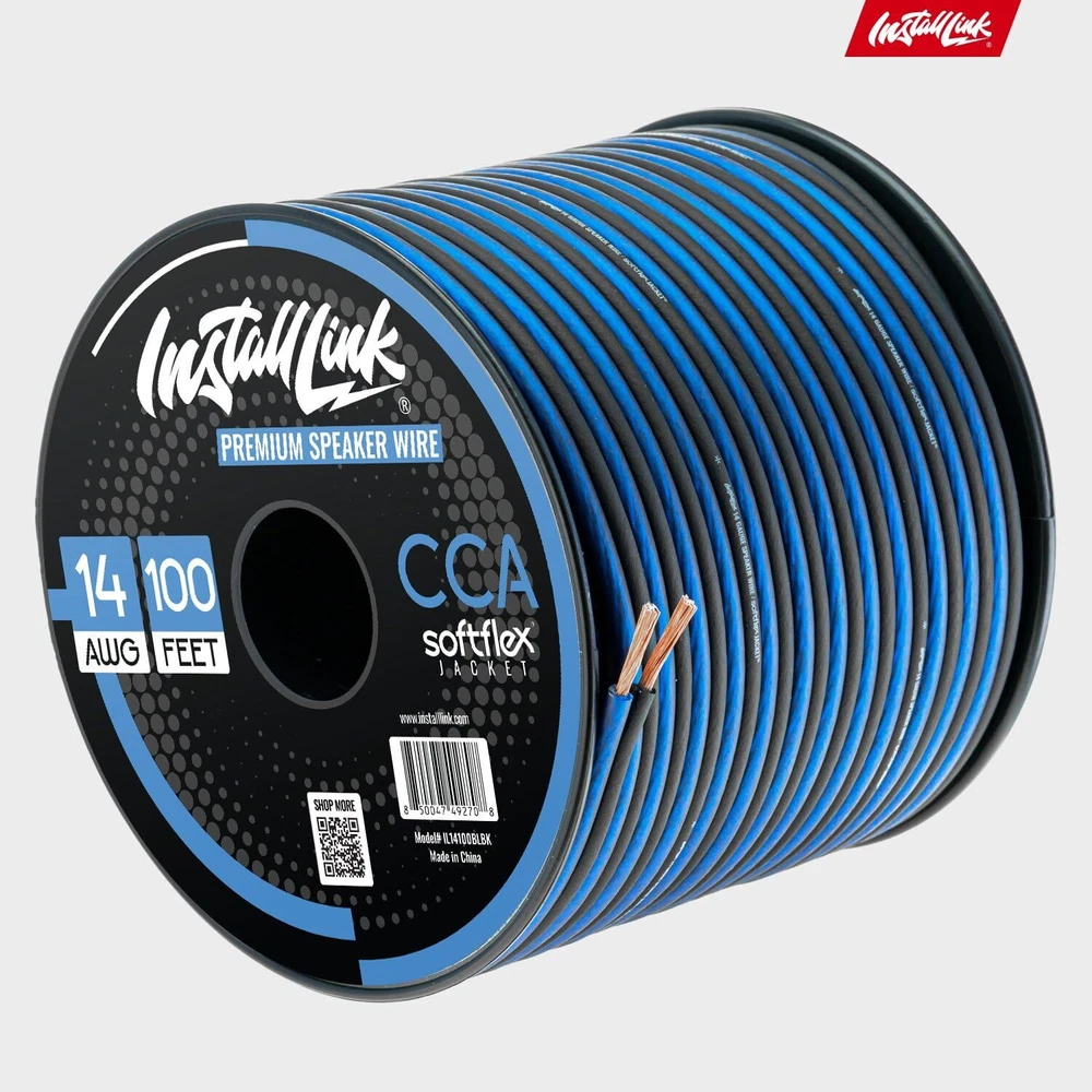 PREMIUM SPEAKER WIRE [ Frosted Blue/Black | 100-feet (30.5m) | 14 Gauge ] - Featuring a double conductor, this stranded wire is constructed from high-grade copper and aluminum. It is perfect for achieving outstanding audio performance, exceptional flexibility, easy stripping and great polarity identification. COPPER-CLAD ALUMINUM (CCA) - Made with an aluminum core and coated with a layer of copper, this cost effective speaker wire provides great conductivity with minimal signal loss. PERFECT FOR - Designed to provide adequate performance for any home theater system, car audio speakers or professional studio. It's a great choice for both DIY enthusiasts and professionals. SIMPLE INSTALLATION - Use this wire to easily connect your home theater or car audio speakers to any A/V receiver or amplifier. SOFTFLEX JACKET - Our wire is shielded with a soft and flexible jacket, which not only provides a great appearance, but also ensures maximum durability and easy installation.