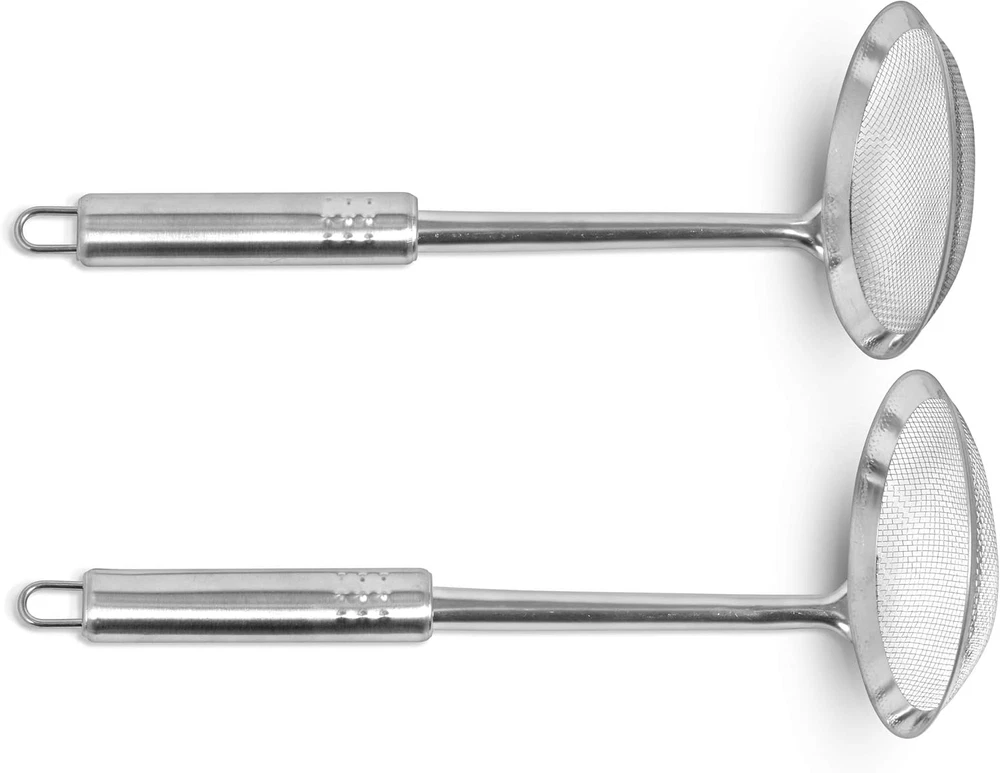 NO MORE FOAM & SCUM: The Simpli-Magic Stainless Steel Cooking Utensils 2-Pack Strainer Ladle Set features a fat skimmer designed to efficiently separate floating fat, grease, foam, or scum from your favorite broths, soups, and stews. Crafted from food-grade stainless steel, the ergonomic handle ensures a comfortable grip for quick and effective skimming. INNOVATIVE DESIGN: With a fine mesh skimmer that securely attaches to the handle, this utensil is engineered to capture even the smallest fat particles. The heat-resistant round handle includes a convenient hole for easy storage, making it an essential tool in any kitchen. VERSATILE USAGE: These strainer ladles are perfect for a variety of kitchen tasks, such as skimming grease from soups, stocks, and gravies; scooping up bits of panko breadcrumbs during deep frying; de-greasing breakfast sausages after cooking; and retrieving vegetables from boiling water without the need for a colander. EASY TO CLEAN: The Simpli-Magic Strainer Ladle Set is dishwasher safe, allowing for effortless cleaning. Simply wash with warm water and soap for quick reuse, making it a practical addition to your culinary toolkit. VALUE PACK: This 2-pack set is ideal for those outfitting their kitchen with essential cooking tools, ensuring you have everything needed to keep your home chef satisfied and efficient in meal preparation. Elevate your cooking experience with the Simpli-Magic Stainless Steel Cooking Utensils. Designed with high-quality materials and offered in bulk packs, these utensils provide exceptional value for your kitchen needs. Explore our brand store to discover our complete range of kitchen products that enhance your culinary adventures.