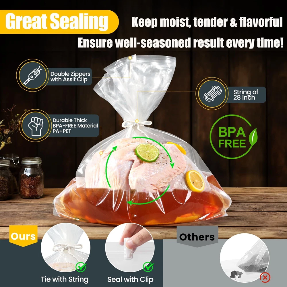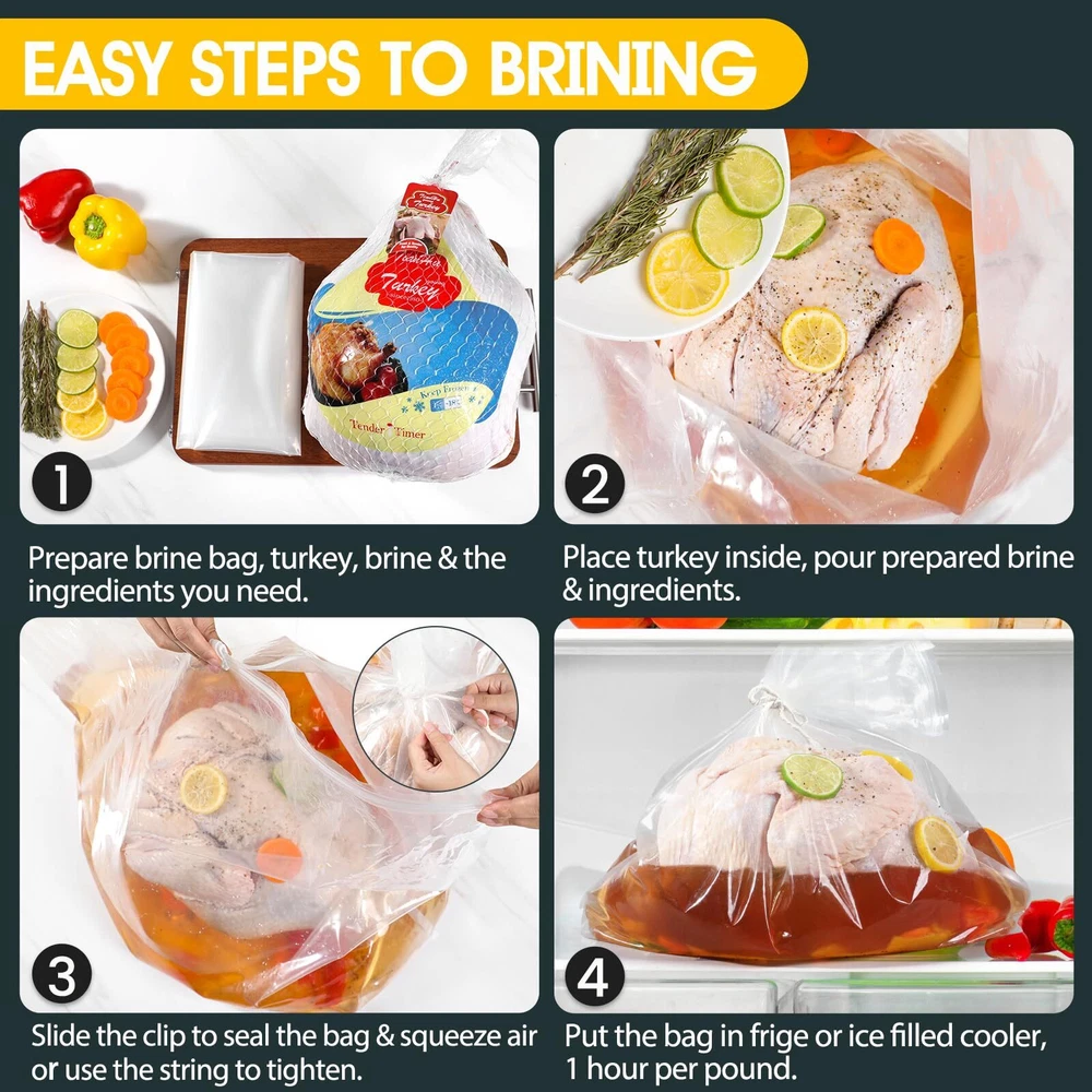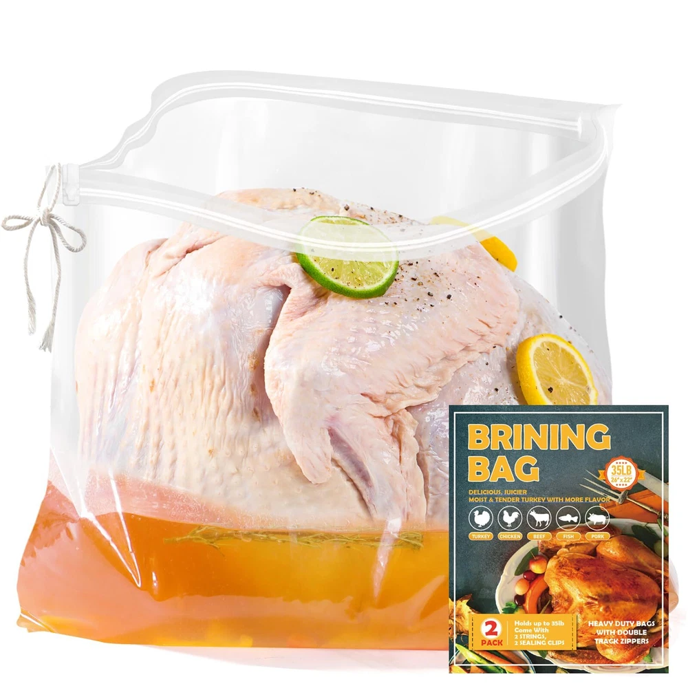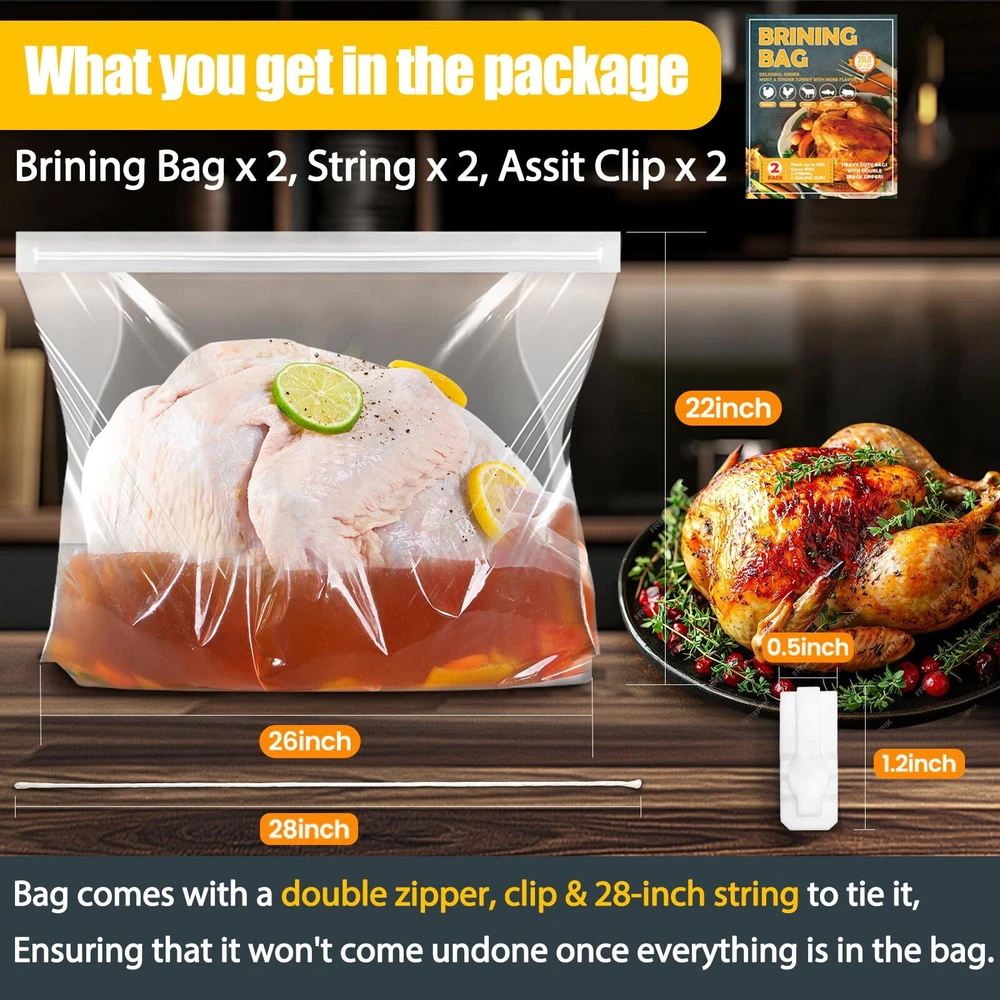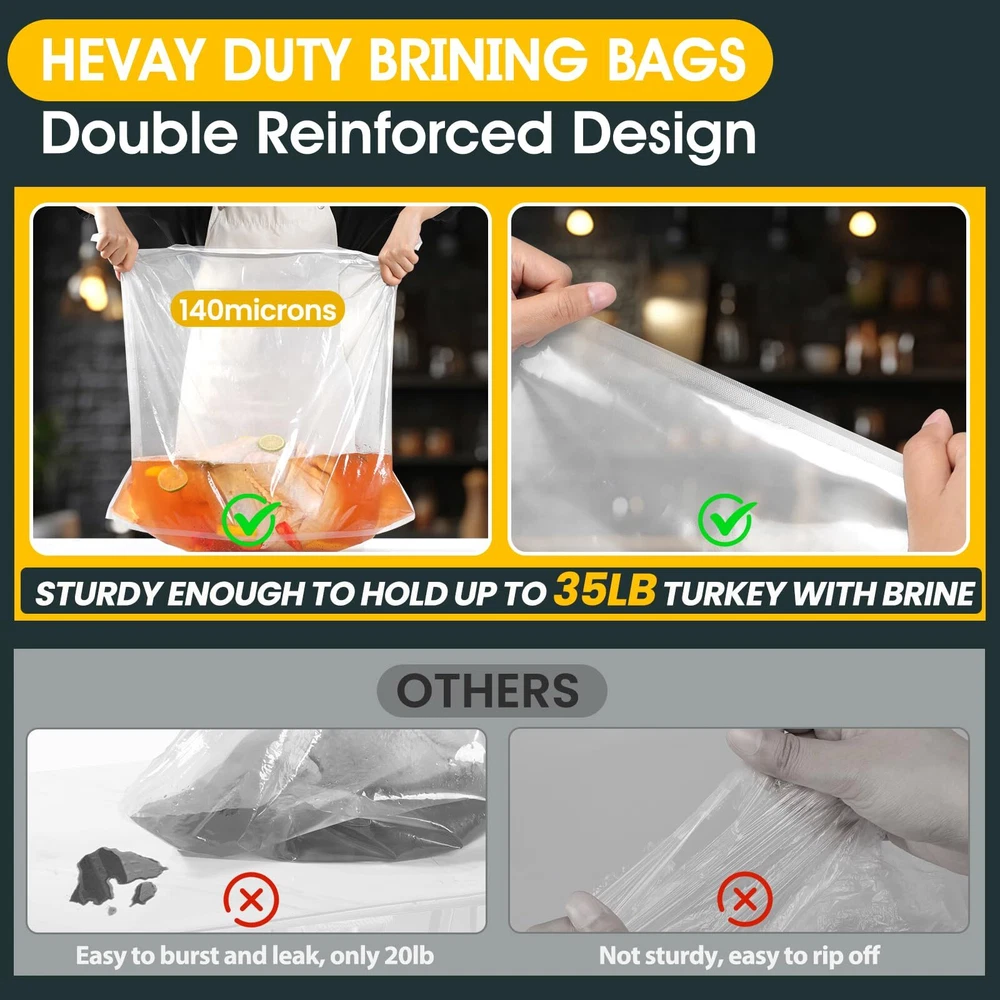 LEAK-PROOF SEAL: Still struggling to brine a delicious turkey? SCHVUBENR turkey brine bags feature a reinforced double-zipper closure for a secure, leak-proof seal. With 2 cotton strings and 2 sealing clips included, you can confidently brine your turkey without spills or messes. HEAVY-DUTY & DURABLE: Made from high-quality, BPA-free materials PA+PET, our brining bags are designed for durability. At 140 microns thick, our sturdy bags can handle large turkeys and brine solutions without tearing or leaking, offering a dependable brining experience. EXTRA LARGE CAPACITY: With dimensions of 26" x 22", our extra-large turkey brine bags can fit/hold turkey up to 35~40 pounds. The spacious, gusseted bottom ensures stability and ample room for both turkey and brine, perfect for Thanksgiving or holiday feasts! EASY TO USE & MESS-FREE: Simply place your turkey in the bag, add brine, squeeze out the air, and seal with the provided strings or clips. Then store in the fridge for a clean, hassle-free brining process without mess! MULTIPURPOSE USE: Ideal for more than just turkey, our brine bags are great for marinating and brining a variety of meats like chicken, pork, and beef. They ensure flavorful, well-seasoned results every time. Note: These are for brining only, not cooking. Contact us within 24 hours if you need assistance.