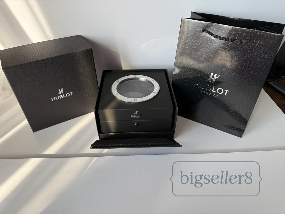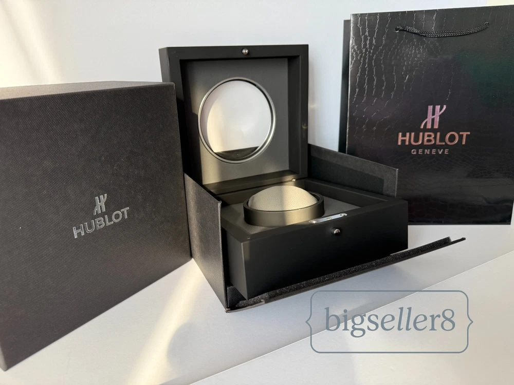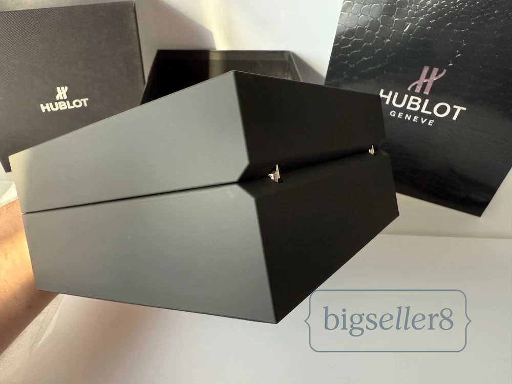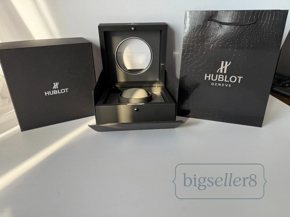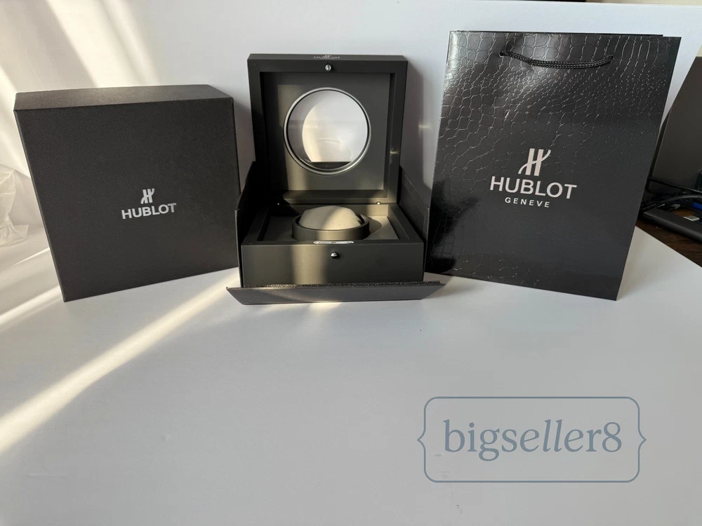 Hublot Watch Box with Shopping Bag – Like New Condition This listing is for an original Hublot watch box set , including the watch presentation box and Hublot shopping bag . Condition: Like new, shows no signs of use Includes: outer box, inner watch box, display cushion, and shopping bag Clean interior and exterior High-quality materials and solid construction Designed for Hublot watches and suitable for standard Hublot case sizes with original straps. ⚠️ Important: This listing is for the Hublot watch box and packaging only . No watch is included in this sale. Perfect for collectors, storage, display, or as a replacement box. Item will be securely packed for safe shipping. Feel free to message me with any questions.