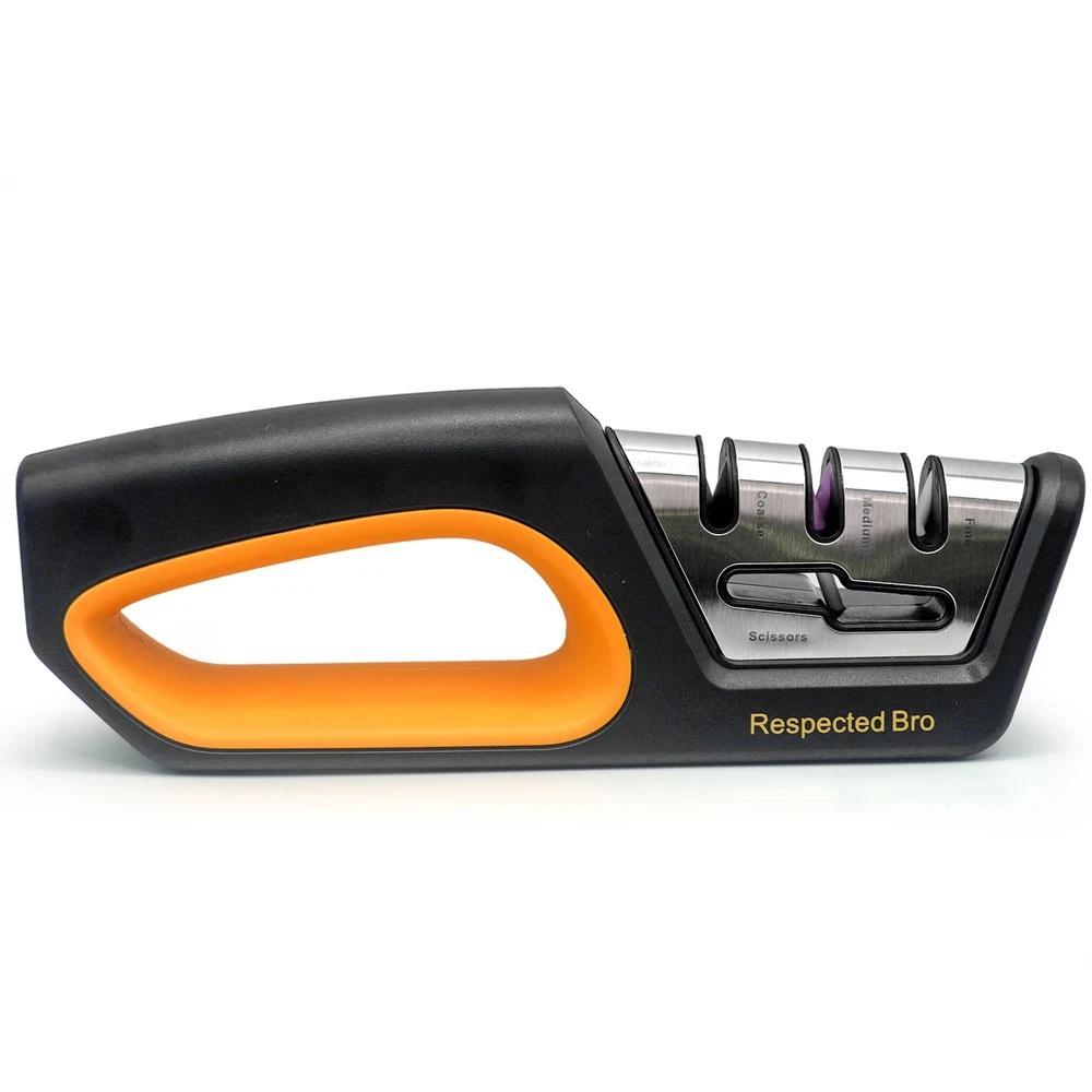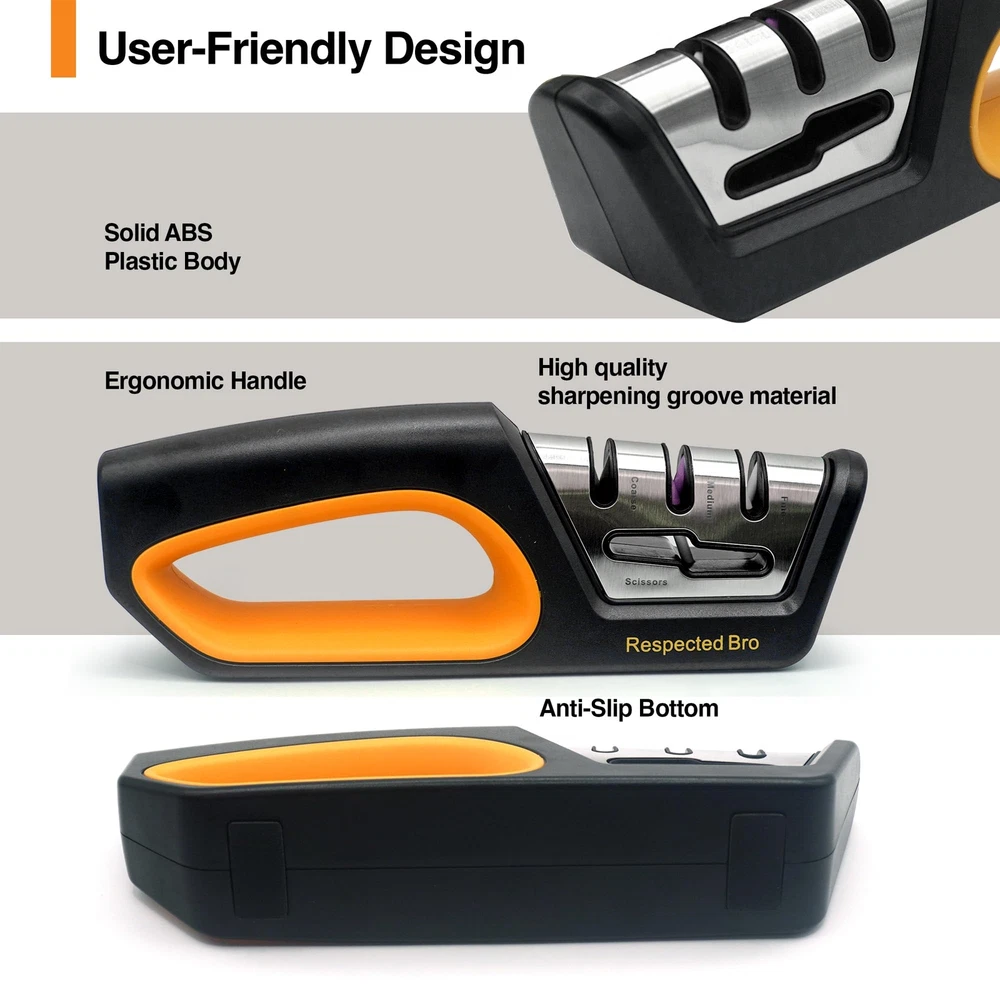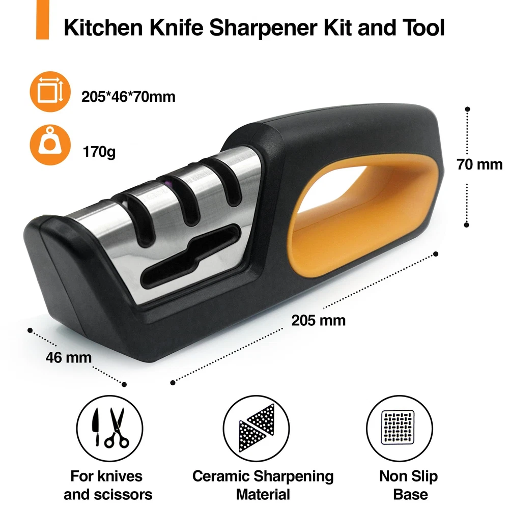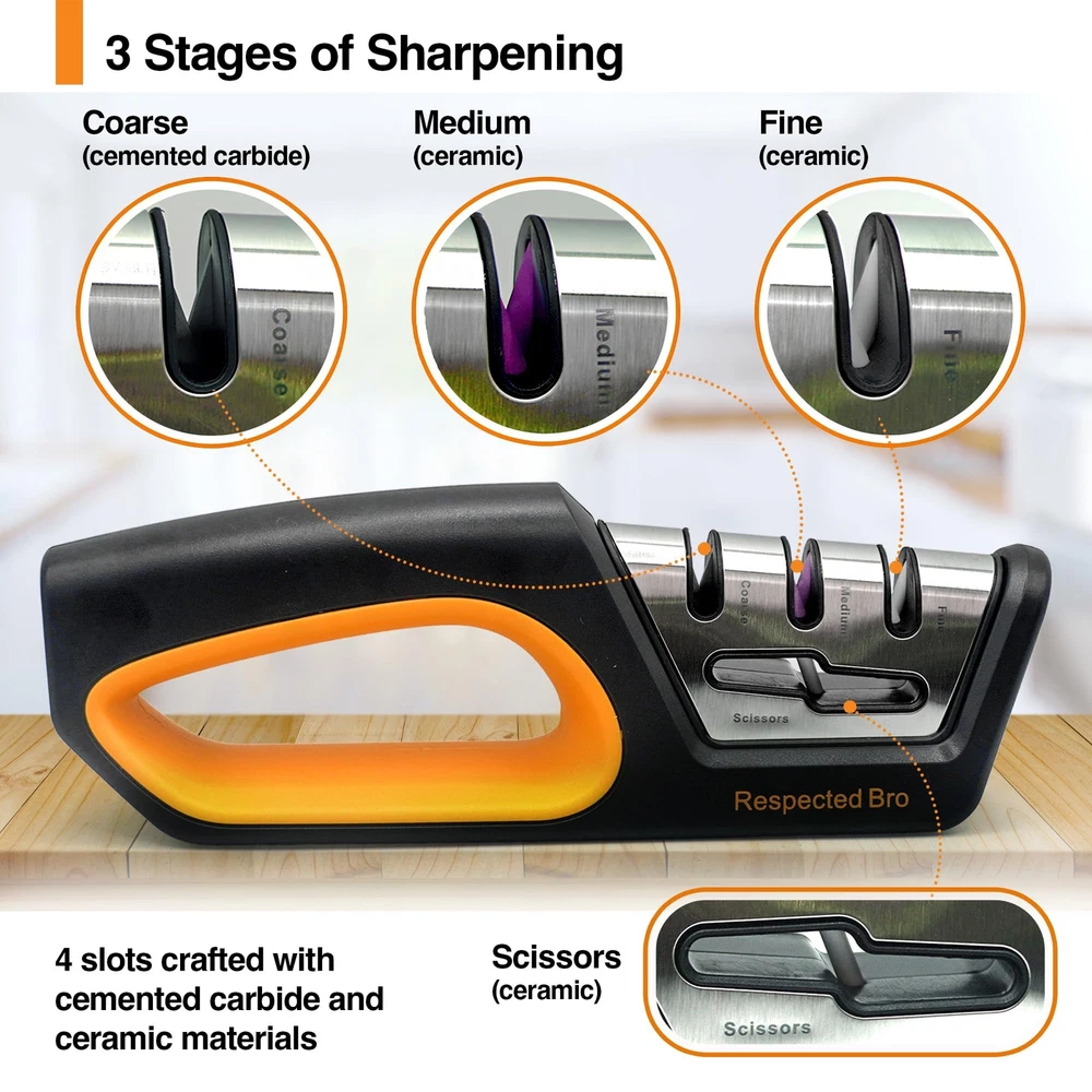 Experience the ultimate precision with our top-rated, multifunctional knife sharpener, the epitome of cutting-edge technology in blade care. This professional-grade tool is crafted for both amateurs and chefs, ensuring your knives are always at peak performance. Features of Our Knife Sharpener: Pro Knife Sharpener System: Equipped with a robust 4-in-1 kitchen knife sharpener, this tool includes three stages for coarse, medium, and fine honing, matched with a ceramic steel slot for final polishing, ensuring a razor-sharp edge. Manual and Easy Handling: Designed with a manual handle, this sharpener offers full control during the sharpening process, suitable for kitchen, outdoor, and industrial use. Versatility: This all-in-one sharpener isn't just for kitchen knives. It includes a dedicated scissor slot and is capable of handling various types of blades, making it an indispensable tool for every household. Compact and Portable Design: Our small, handheld sharpener is easy to store and perfect for both home kitchens and outdoor adventures. It fits easily into any drawer or backpack. Advanced Materials and Design: Constructed with durable stainless steel and enhanced with a smart, ergonomic handle that ensures safe and comfortable use. The sharpener’s body comes in a vibrant yellow for easy identification in your tool kit. Extra Fine Sharpening: Ideal for precision tasks, our sharpener includes an extra fine slot to touch up already sharp knives or for delicate sharpening of high-quality blades. Professional Grade for Every Chef: Whether you're a culinary expert or a home cooking enthusiast, our sharpener meets professional standards, providing a consistently perfect edge every time. Global and Priority Chef Recommended: Recognized worldwide and recommended by priority chefs, our sharpener stands out as a global leader in knife care. Innovative Knife Sharpener Kit: Includes a comprehensive tool kit for pocket knives, ensuring every adventurer or home cook can maintain their blades effortlessly. Safety Features: The design includes a secure handle and a non-slip base, preventing any accidents during the sharpening process, making it safe for every user. With this knife sharpener, maintaining the sharpest, most efficient blades is not just possible, it’s simple and accessible. It's the only tool you'll need to ensure the longevity and performance of all your cutting implements, securing its place as the best knife sharpener in the world. TRANSFORM BLADES INSTANTLY - Our dual-stage design effortlessly transforms dull blades to culinary precision in seconds. Discover the ultimate knife sharpener, perfect for chefs and outdoor enthusiasts alike. This professional, portable sharpener works for kitchen, pocket, and Swiss army knives. Effortlessly sharp, every time. EASY HANDLING, SAFE SHARPENING - Features an ergonomic grip and anti-slip base for secure, simple knife sharpening—no expertise needed. Optimize blade precision with our knife sharpener set—ideal for camping, kitchen, and outdoor use. Easy, effective, versatile SAVE SPACE, SHARPEN MORE - Compact size tucks neatly into any drawer, ready to revitalize your cutlery at a moment’s notice.Achieve razor-sharp precision with our pro knife sharpener kit—ideal for chefs, hunters, and fishermen. Top-rated, versatile. MASTER VERSATILE SHARPENING - Tackle everything from chef's knives to paring knives with one versatile tool, enhancing your kitchen's efficiency. Top-notch knife sharpener for chefs, hunters, and home use—portable, precise, durable. Perfect edge every time. SMART, BUDGET-FRIENDLY CHOICE - Revive your old knives to brand-new sharpness, bypassing the need for costly replacements and keeping your budget intact. Swift, compact knife sharpener tool for kitchens and hunting—perfect for pocket knives. Sharpens swiftly and smoothly.