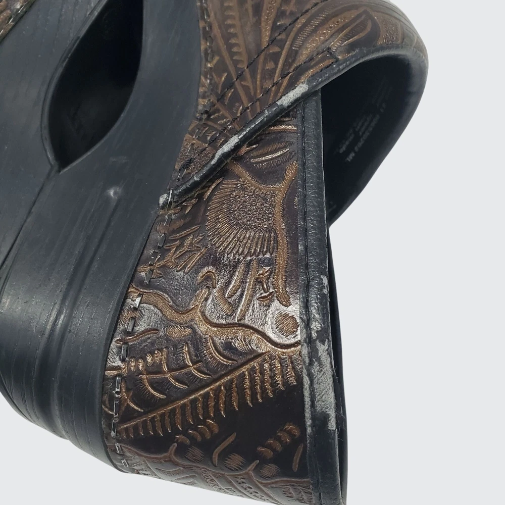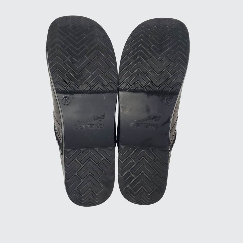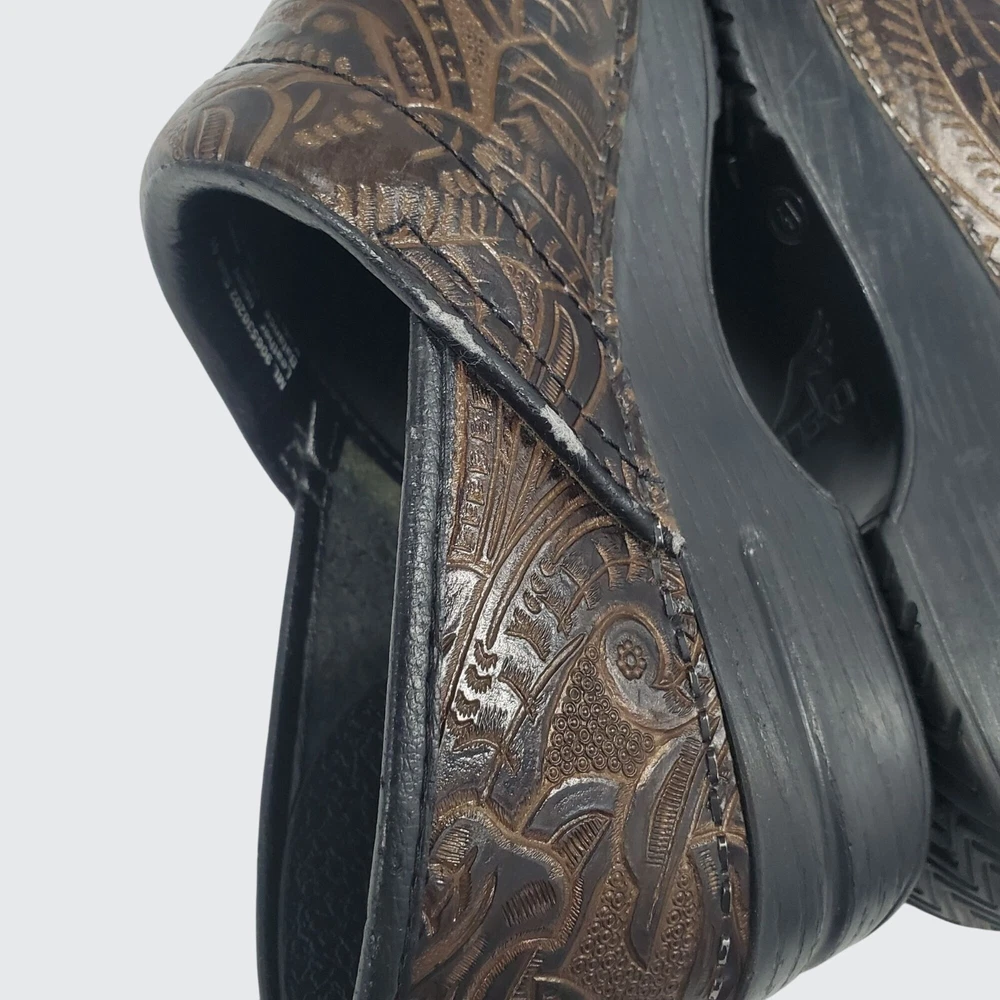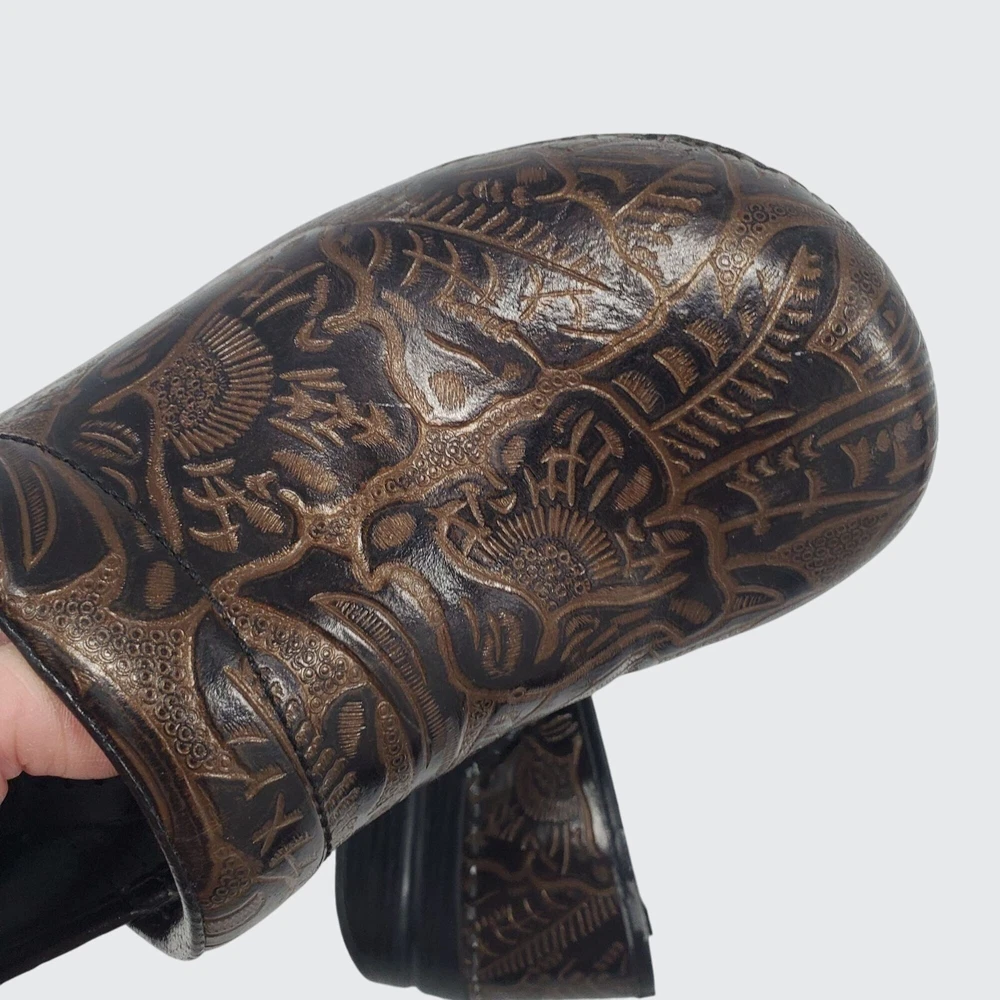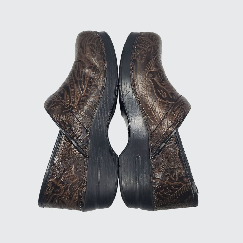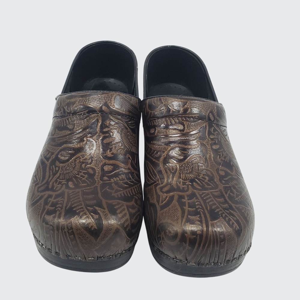 These Dansko clogs offer a blend of comfort and style with embossed leather detailing. Designed for durability and support, they are ideal for professionals needing long-lasting comfort during extended wear. The intricate design adds a unique touch to any professional attire. • Embossed leather detailing • Slip-on design • Supportive footbed • Rubber sole for traction • Professional look Size 41(US 10.5-11) Features: • Clog Size: Womens 41 Condition: Pre-Owned Good Excellent preowned condition from a pet and smoke free home. All shoes are cleaned and sanitized prior to selling. Please refer to pictures for condition. Wear noted on rim material of shoe. All offers considered!