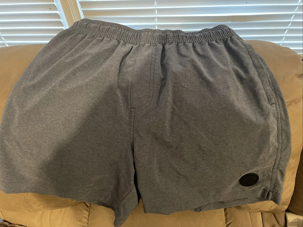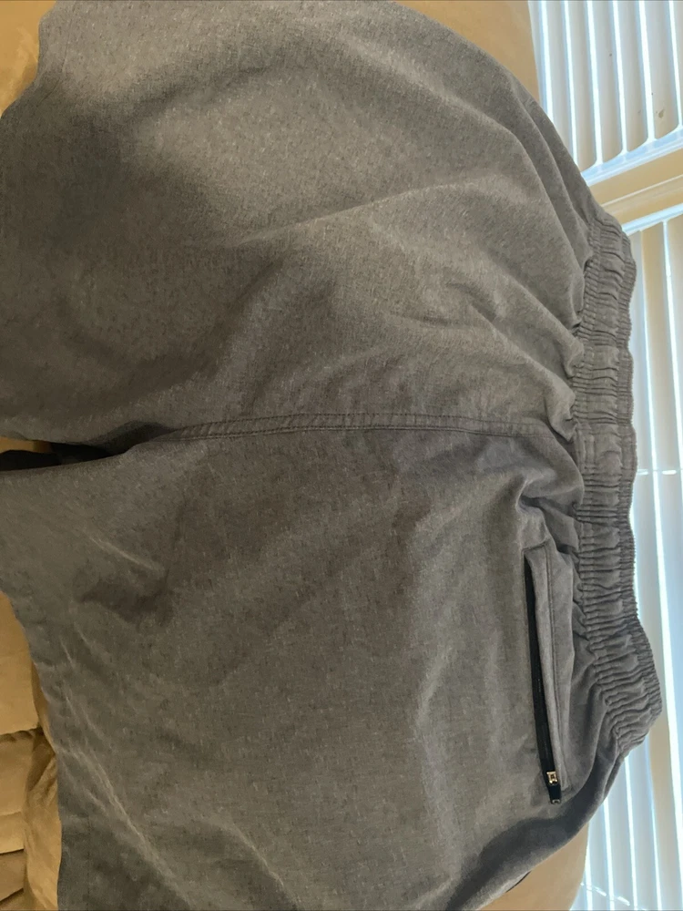 Preowned. Elastic waist with drawstring. Drawstring is a bit twisted but still functional (see pic). 5.5” inseam. They are bluish gray in color. Comes from smoke free, pet friendly (cat) home. Please pay close attention to all pictures as they are part of the description. Sold as you see pictured. No returns or refunds. 86% polyester, 14% elasthanne.