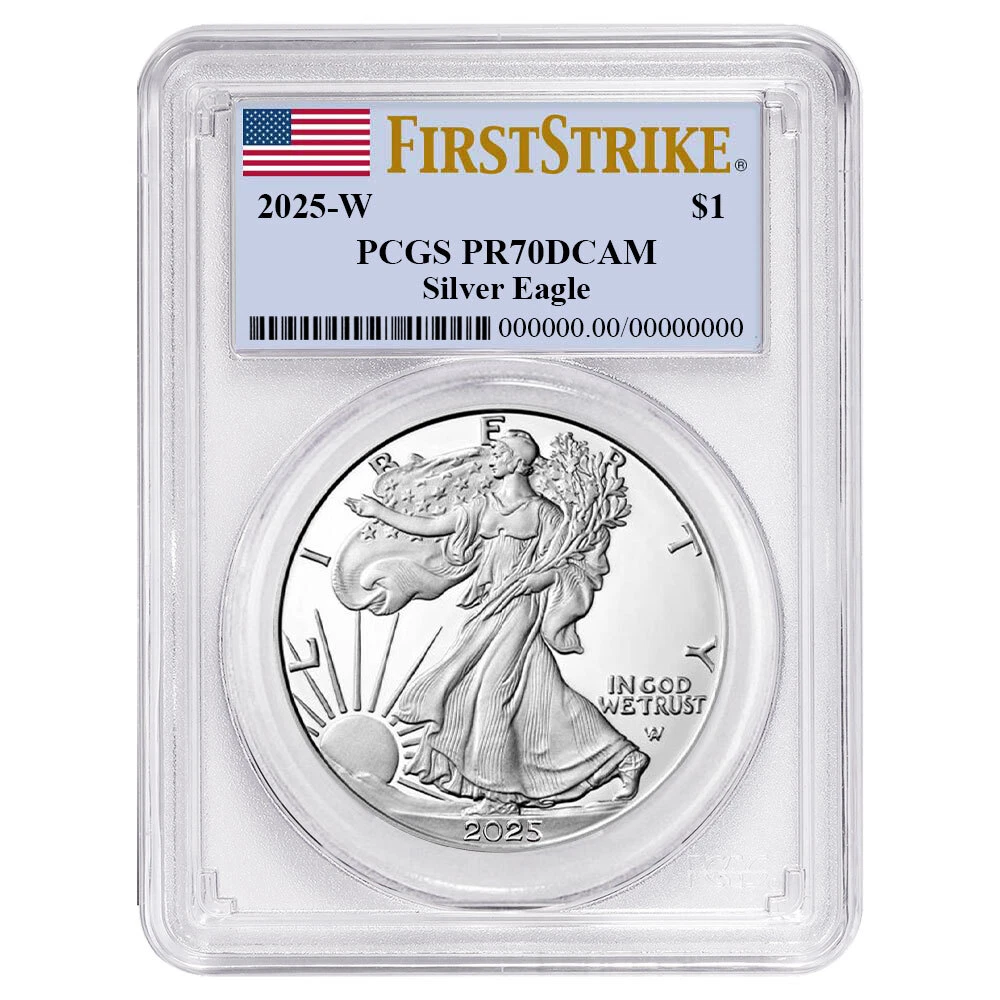 Free Shipping On All Orders Menu gold US Gold American Eagles American Buffalos Pre-33 Gold Gold Bars 1 oz Gold Bars Fractional Gold Bars Gold Rounds World Gold Coins Queen's Beast Series Canadian Maple Leafs S. African Krugerrands British Britannias Chinese Pandas Austrian Philharmonics silver US Silver American Eagles America The Beautiful 90% Silver 40% Silver Silver Rounds Silver Bars 1 oz Silver Bars 5 oz Silver Bars 10 oz Silver Bars Kilo oz Silver Bars 100 oz Silver Bars Silver Shot World Silver Queen's Beast Series Canadian Maple Leafs S. African Krugerrands British Britannias Chinese Pandas Austrian Philharmonics Mexican Libertads Australian Kangaroo's other Platinum Palladium Ancient Coins Error Coins Proof Sets Mint Sets Supplies and Publications auctions Store Categories Bullion Silver Eagles Gold Eagles Gold Buffalo Platinum Eagles First Spouse Gold Modern Commemoratives Ultra High Relief Pre-1933 U.S. Gold World Coins Error Coins Proof & Mint Sets Early U.S. Coinage Pre-33 U.S. Gold Morgan & Peace Silver $1 Dollars $1 Half Dollar 50c Quarters 25c Dime 10c Nickel 5c Small Cent 1c Supplies & Publications Original Government Packaging Ancient Coins No Reserve Auctions Other Store newsletter Add our store to your Favorites to receive our email newsletters about new items & special promotions. Sign up Presale - 2025-W Proof $1 American Silver Eagle PCGS PR70DCAM FS Flag Label Product Description Presale Item (Estimated Ship Date 2/07/2025) Please note if your order includes a presale item, the order will be delayed until the presale item becomes available for shipping. The American Silver Eagle is considered one of the most popular coins worldwide. The creation of these iconic 1 Troy oz of .999 fine silver coins was authorized through the Liberty Coin Act of 1985, and production began in 1986. In 2021, a redesign was introduced by the U.S. Mint. The original obverse design, based on Adolph A. Weinman’s 1916 “Walking Liberty” Half Dollar, has been updated with the help of modern technology. Now a closer reflection of Weinman’s original design, the obverse includes the addition of his traditional artist’s mark on the coin itself. The reverse of Silver Eagle also received an updated form created by one of the U.S. Mints Artistic Infusion Program Designers, Emily Damstra. Now known as “Eagle Landing,” the image depicts an eagle approaching a landing, carrying an oak branch to add to its nest. Coin Features: 1 Troy oz .999 Silver Proof Coin minted at the West Point Mint bears the “W” mint mark Shipped in protective packaging Shop confidently, knowing that when you make a purchase, you are buying the best. Each coin has been carefully assessed by the Professional Coin Grading Service (PCGS) and is certified to be in near-perfect condition. To protect their condition, these items are shipped in their original PCGS certification slabs. Coins arrive in protective slabs courtesy of the PCGS Free Shipping on all orders The coin pictured is only a representation of the coin you will receive, not the exact coin (serial numbers will vary) If you have any questions or concerns, please do not hesitate to contact us. Our dedicated Customer Service team will be happy to assist you M-F from 9 am to 5 pm EST. Shipping Payment Returns About Us Shipping We offer free shipping on all of our listings! All items must be shipped directly to your registered eBay address, no exceptions. We will not ship it to an alternative or forwarding address. All of our packages are fully insured. Orders over $750.00 require Signature Confirmation. No insurance claim will be processed if the United States Postal Service or any other carrier designates the package as delivered via tracking number, regardless of circumstance. In general, we ship items using USPS First Class Mail or FedEx Ground. Other methods may be used depending on circumstance. eBay will post an estimated shipping time as soon as shipping information is uploaded to an order. This time frame is only an estimate, not a guarantee. Please be sure to verify that your order is correct prior to submitting payment. Once an order is placed it can only be canceled not adjusted. Orders are processed quickly and once they are moved to our shipping department an order can no longer be canceled, it would have to be returned (all returns are subject to restocking fees). Disclaimer: Once the item has left our facilities, it is under the control of the third party shipping service. We always do our best to provide our customers with speedy service; however some things are out of our control. There is always the possibility for a delay due to these third party services or the possibility of a product becoming damaged or lost in transit. The simple fact is, all of the above-described scenarios are unacceptable to us and we will never put this burden on our customers. If anything happens to a product in transit, we will always be willing to replace the product. Customer satisfaction is our number one priority and we do whatever we can to accommodate you. Pinehurst Coins will not accept purchases for any item that is mispriced due to technical issues, regardless if those issues are caused by eBay's system or our own. All mispriced orders will be canceled and your money will be completely refunded immediately. Payment For large orders with customers that we do not have a previously established business relationship, a wire may be necessary. This will be determined at the discretion of Pinehurst Coins. Payment is due at the time of checkout, no exceptions. We do not offer discounts unless it is otherwise posted on our listing. Some listing will provide you with a bulk purchase discount. Please see individual listings for details. Placing an order locks in your price. We do not offer price adjustments on our items. Both the precious metals and numismatic markets can be volatile and change on a regular basis. Placing your order locks in your price and this p