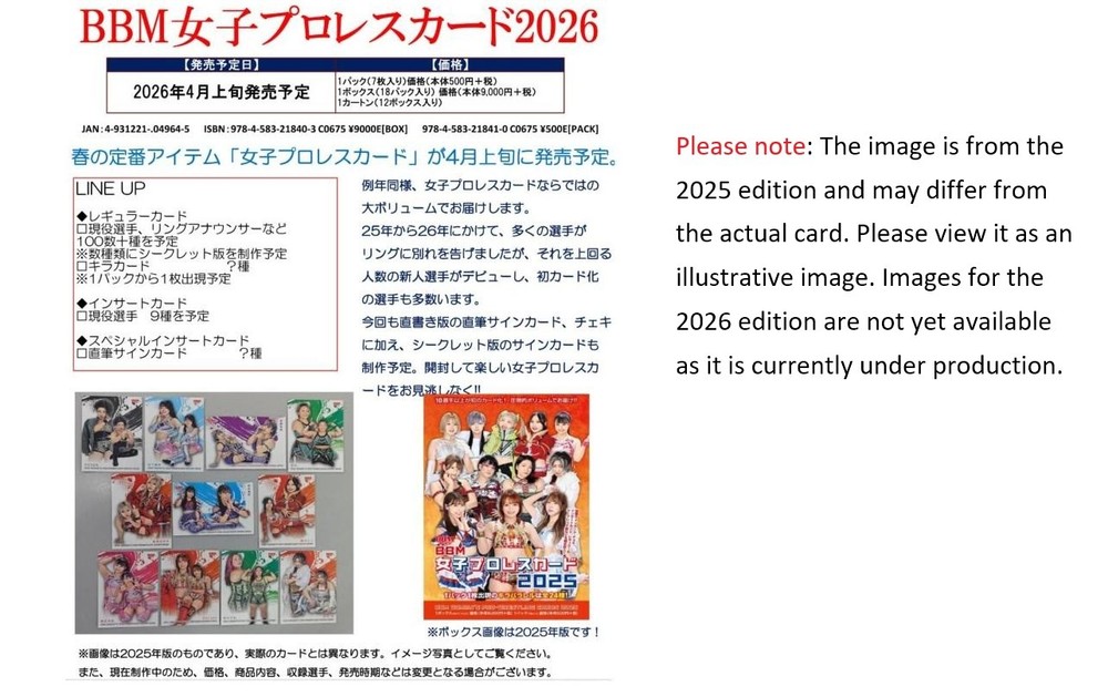 Presale BBM 2026 Women's Pro Wrestling Cards Factory Sealed Box Japan via FedEx Product Overview The BBM 2026 Women's Pro Wrestling Cards Factory Sealed Box is a highly anticipated collectible set scheduled for release in May 2026. This trading card box features a comprehensive lineup of current and debuting women's pro wrestling athletes from Japan, including regular cards, special inserts, and rare autograph and secret signature cards. Perfect for fans and collectors looking to celebrate the dynamic world of women's pro wrestling. Features / Specifications One box contains 18 packs; each pack includes 7 cards. Includes over 100 regular cards featuring active wrestlers and ring announcers. Special insert cards with 9 types of current wrestlers. Autographed cards with direct signatures and secret signature variants. Cheki-style photo cards included as special inserts. Japanese card size and language. Produced by BBM, a trusted brand in sports trading cards. Shipping Ships from Japan. United States: DDP (Delivered Duty Paid) — import duties and taxes are included. Other countries: DDU (Delivered Duty Unpaid) — any import duties or taxes are the buyer's responsibility. Shipping Time This is a pre-sale item. It will be shipped within 1 business day after the product is released and in stock. Important Stock Notice Our listed stock quantity does not reflect the manufacturer's inventory. If the item becomes unavailable, we may need to cancel your order. We sincerely apologize for the inconvenience and thank you for your understanding.