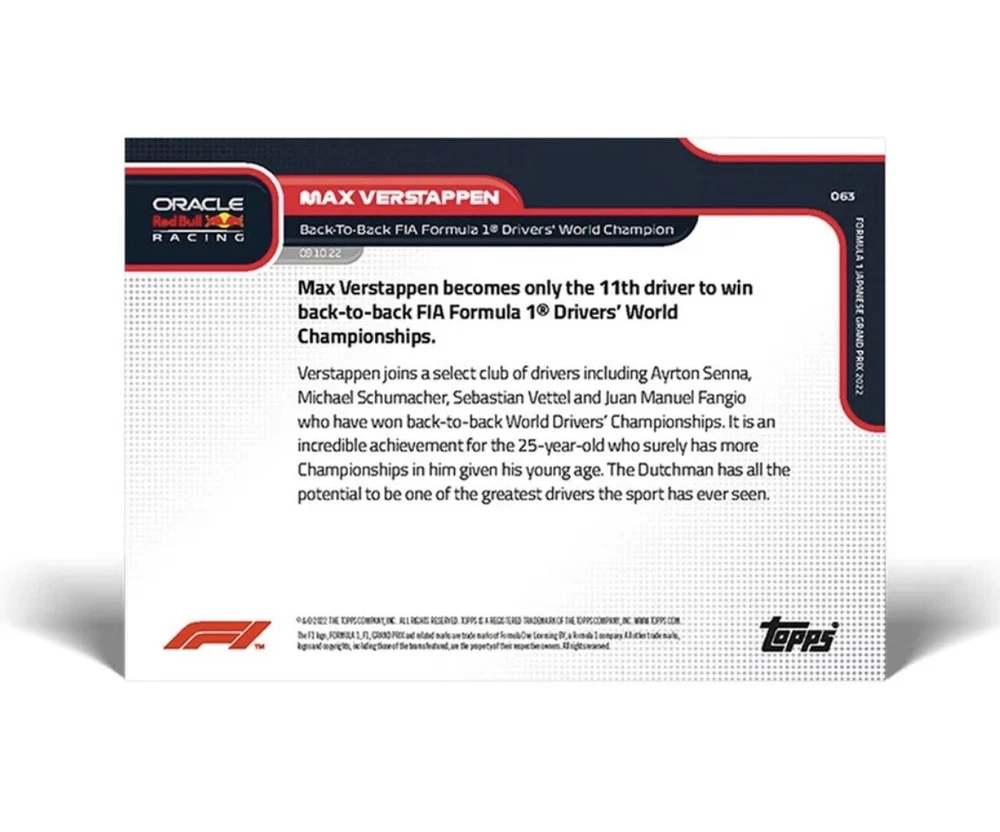 Presale TOPPS NOW F1 Back-To-Back World Champion Max Verstappen #63 Card will be placed in a penny sleeve & top loader. Ships immediately upon delivery (late November/early Dec).