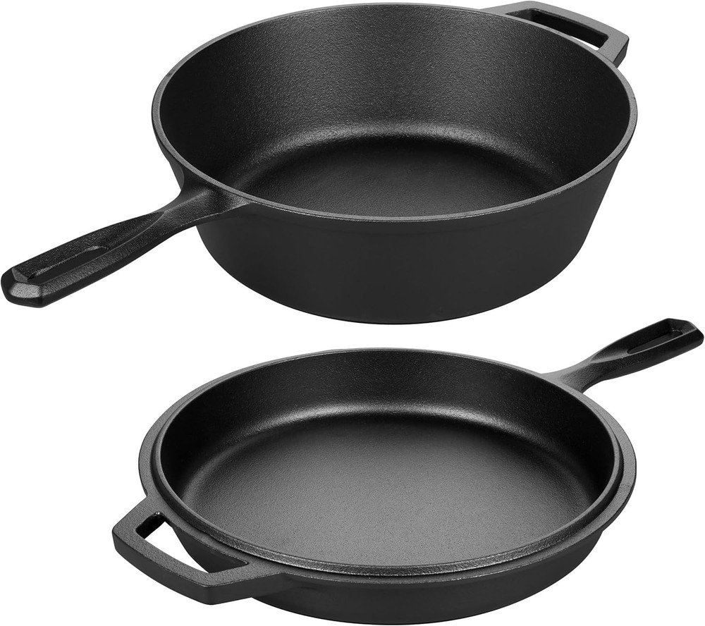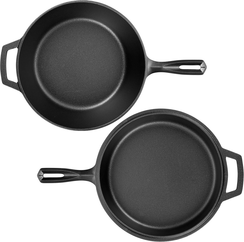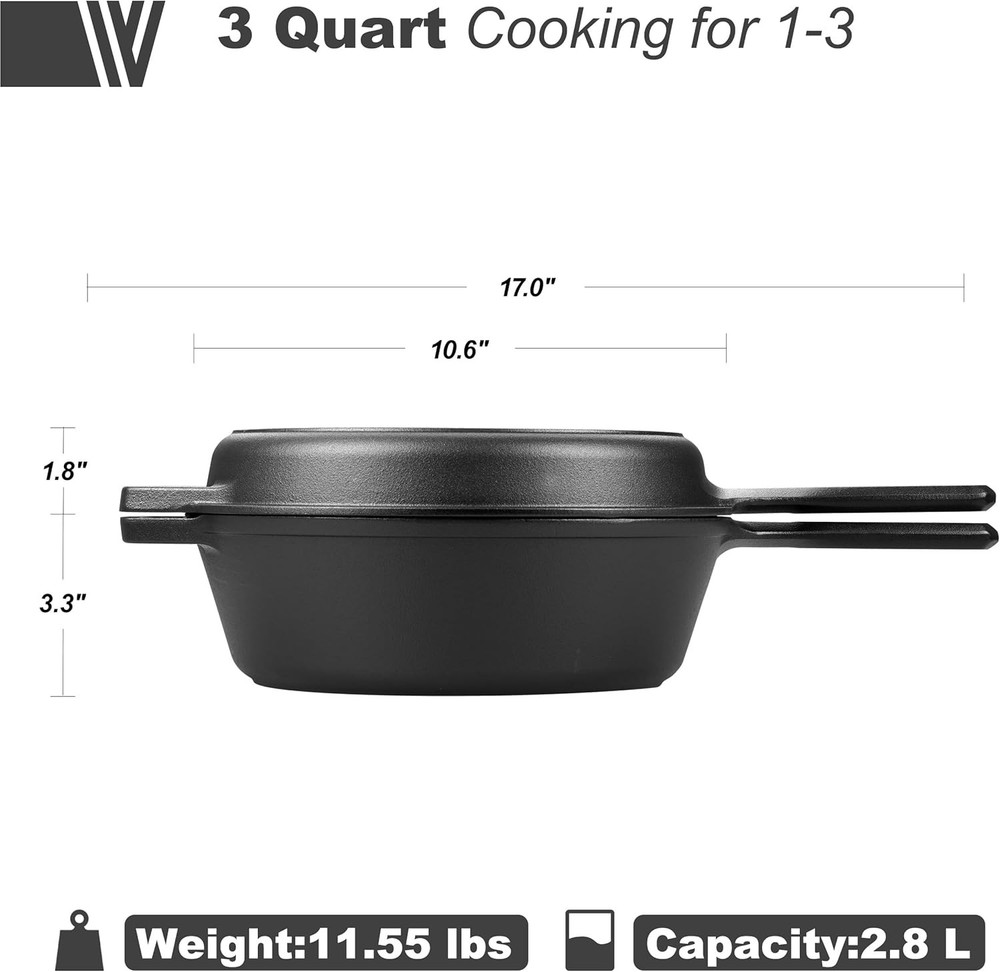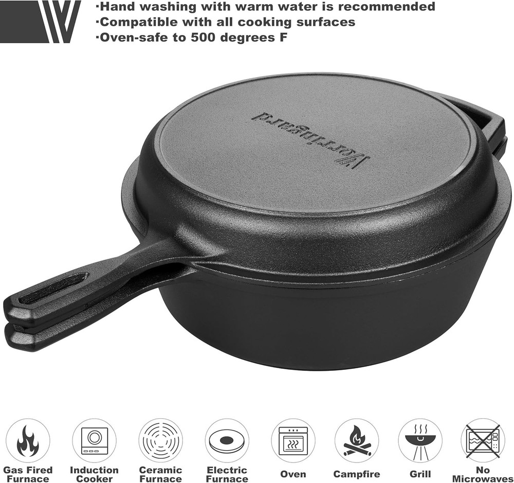 Pre-seasoned Cast Iron Double Dutch Oven Pot with Skillet Lid, for Black Product Details Material: Cast Iron Brand: VORRINGARD Capacity: 2.8 Quarts Color: Black Finish Type: Pre-seasoned Shape: Round Product Care Instructions: Oven Safe, Grill Safe, Stove Safe, Hand Wash Only With Lid: Yes Is Oven Safe: Yes Lid Material: Cast Iron Is Dishwasher Safe: No Temperature Rating: 500 Degrees Fahrenheit Product Dimensions: 17"W x 5.1"H Manufacturer: VORRINGARD Item Weight: 12.38 pounds Country of Origin: China Item model number: V-047 VERSATILE USE: The shallow skillet can be used as a lid and the deeper pan is perfect for stews, soups, bread or roasting a wide range of recipes. Perfect for cooking, serving moves from refrigerator to stove top or oven to the table COMPATIBLE WITH ALL COOK TOPS: Dutch ovens can be used on gas, electric, ceramic and induction cook tops, Oven safe to 500 degrees F HIGH QUALITY: Heavy- duty cast iron retains heat well and distributes it evenly when cooking and also reduces the amount of energy needed for cooking THOUGHTFUL PRESENT: it is a perfect chose for the birthday, housewarmings and weddings PRODUCT DIMENSIONS: 17x5.1 inches Vorringard is the processional cast iron cookware brand, with top quality material and the most advanced DISA machinery casting production line from Denmark, which can guaranteed our high quality product. Our goal is bring every family affordable cast iron cookware with high quality. Ergonomic looped handles are comfortable; Thickened and flat bottom high- temperature resistant and even heat distribution, Cast iron cookware distributes and retains heat evenly, suitable for most cook tops: on the stove, on the grill, or over a campfire. It can be used as a deep skillet or dutch oven and the lid converts to a shallow skillet or griddle, helping you save your space. How to pre-seasoned: Wash with a warm soapy water and a nylon scrub brush is recommended, avoid metal utensils; Dry promptly and thoroughly with a lint-free cloth or paper towel, preferably while the cookware is still warm; Rub a very light layer of cooking oil or seasoning spray onto the surface of your cookware, then season it in the oven; Hanging or storing in a dry and ventilated environment.