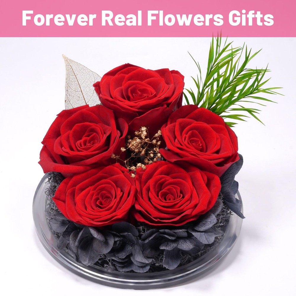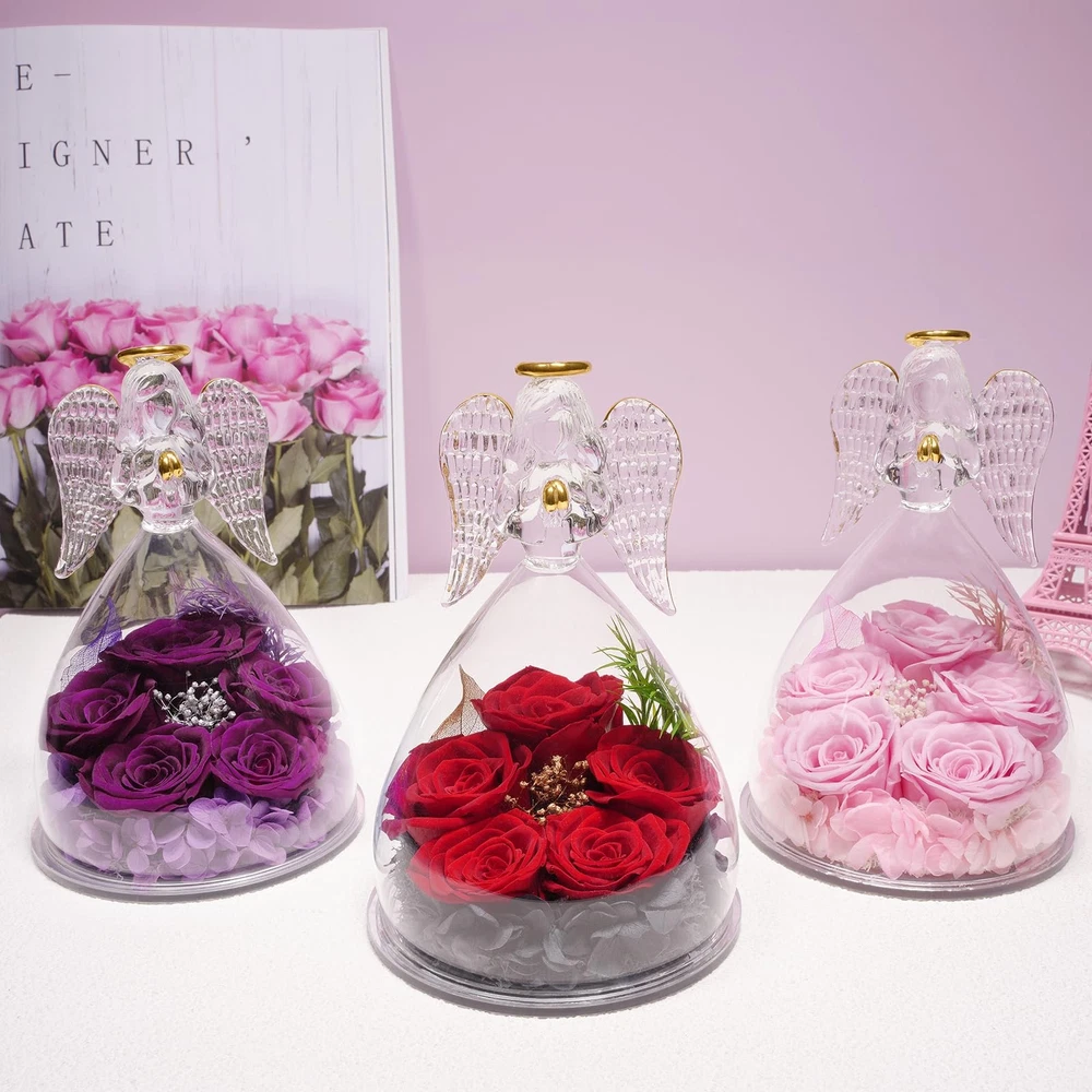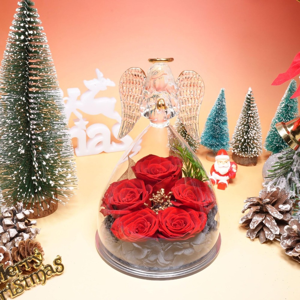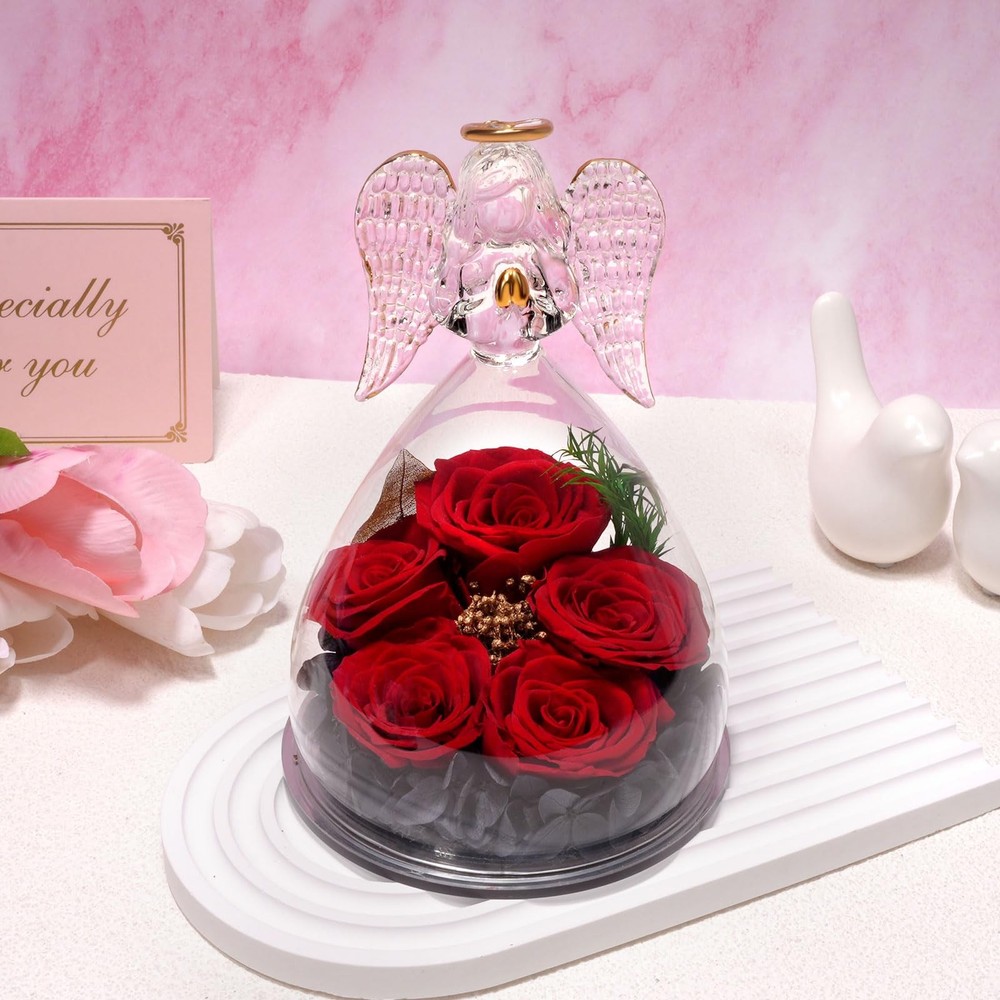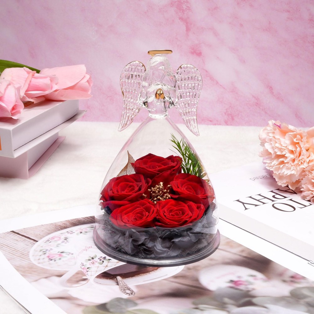 Five Real Rose and Best Wishes gifts: Forever real rose in large glass angel figurines gifts for women Guardian angels symbolize protection that follows you around and represent good wishes and blessings, the preserved roses symbolize pure and forever love. Get this glass angel with eternal rose gifts for women mom grandma wife friend sister to show your unique love.The angels rose gifts box is a perfect angel gifts for women on Birthday, Mother’s day, Valentine’s day, Thanksgiving, Anniversary, get it now to declare your forever pure love and best wishes to the important person in your life. Specification: Material:Flower: Purely hand glued Preserved real rose Shell: High borosilicate Angels figurine glass Size: 10.5*10.5*16cm (4.13*4.13*6.3inches) Please Note: All the preserved fresh flower series are handmade, no flowers are exactly the same in the world, which means your unique love, so the rose may not as exactly same as the picture. Package included: 1*Angel Figurine Rose 1*Gift Box for protection 1*Greeting Card ANGEL ROSE GIFTS FOR WOMEN: Five real roses in glass angel figurines gift for women. Angels guardian symbolize protection like a shadow and represent good wishes and blessings, preserved roses flowers symbolize eternal love. Our angel roses combine angels and roses very skillfully. Get this angel figurines with eternal rose gifts for women to show your unique love REAL ROSE ANGEL GIFTS: angel roses are made with 100% natural real roses and angels figurines made of high quality borosilicate heat resistant glass. Every angel guardian glass cover is handmade, with a lifelike angel shape on it, and the glass cover is crystal clear, so you can clearly see the texture of the rose petals and appreciate its beauty. Angel gifts for mom christmas gifts, grandma birthday gifts, anniversary gifts for wife SOPHISTICATED HOME DECOR:The preserved rose flower angel figurines gift is made with a unique preservation process to maintain the original beauty of angel roses, which can be kept for 3-5 years. You can place the angel roses in your bedroom, office, living room, vanity desk and any other shady place without watering and sunlight. It's a great home decoration which can make the special person feel happy SUITABLE FOR VARIOUS OCCASIONS:Our handmade glass angel statue of eternal roses are the pretty gift for that special someone. It's perfect gifts for Birthday, Christmas, Valentine's Day, Mother's Day, Wedding Anniversary, Thanksgiving, Party, Children's Day, Halloween, Easter, Teacher's Day, Graduation, Retirement. Sympathy gifts, Religious gift, Holiday gifts, Housewarming are good choice. Christmas gifts for mom, mom birthday gifts from daughter son, mother’s day present for mom, Forever rose flowers gifts for her mother grandma parent children sister wife friends teacher coworker PACKAGE AND NOTES : Our package contains a glass angel figurines eternal flower, a fine greeting cards(You can write your blessings and love), a exquisite gift box. Product size: 3.54 inches*3.54 inches*6.1 inches. Rose flowers for delivery prime. Our angel roses are sealed to preserve the lasting beauty of the preserved rose flowers, and each product is handmade that slightly different, highlighting the unque love of you. If there are any problem, please contact us
