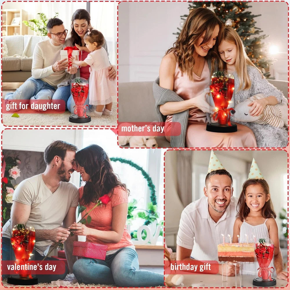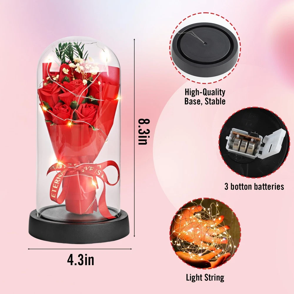 Preserved Flowers in Glass,Forever Long-Lasting Flowers in Glass Dome,Artificial LED Rose Flowers in Glass,Gifts for Mother’s Day, Valentine’s Day, Birthday, Christmas Decorations, Rose Red Product Details Brand: PURE NEST Plant or Animal Product Type: Flower Color: Red Material: Glass Product Dimensions: 4.5"D x 4.5"W x 8.6"H Brand: PURE NEST Plant or Animal Product Type: Flower Color: Red Material: Glass Product Dimensions: 4.5"D x 4.5"W x 8.6"H Recommended Uses For Product: Decoration Specific Uses For Product: Home Decor Package Information: Terrarium Occasion: Valentine's Day Number of Items: 1 Base Diameter: 4.5 Inches Manufacturer: PURE NEST Item Weight: 12.3 ounces Item model number: P-0929 Date First Available: September 29, 2024 Eternal beauty and love:The red Rose Eternal Flower symbolizes eternal love and beauty. Its special workmanship ensures that the flowers will not wither or fade, making them a gift that can be treasured for a long time, conveying deep affection for the loved one. Ideal for many occasions:Whether it's a birthday, anniversary, Thanksgiving, Christmas or Valentine's Day, Red Roses for Life express your love and care for that special someone. This bouquet is not only perfect for romantic moments, but also perfect for giving to the important women in your life. Unique decor and ambiance:This bouquet comes with delicate LED lights that create a soft glow and add to the romantic atmosphere. It is the right size to be used as a tabletop decoration or the focal point of an event, bringing warmth and emotion to any occasion. Exquisite craftsmanship:Each bouquet of Eternal Red Roses is carefully hand-crafted. The glass dome sits elegantly on a black base, not only protecting the flowers, but also adding to the overall beauty and elegance, making it the perfect choice for home decor. Unique decoration:Our glass-domed roses are the perfect home decor gem for candlelit dinners, wedding celebrations and special occasions. As a gift, it contains eternal love, giving people in the important moments with a unique moving and profound meaning. This warm and charming gift will surely become a beautiful memory in the heart of women forever, as if time also stops for it. Preserved Flowers In Glass. Specification: Name:Preserved Flowers In Glass Warm Note: If products have any quality problem, Please contact us at any time. Refund or Replacement for any quality problem.