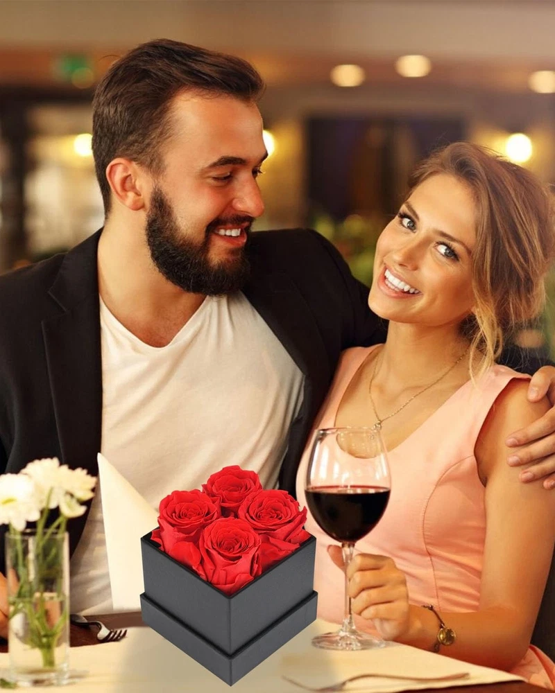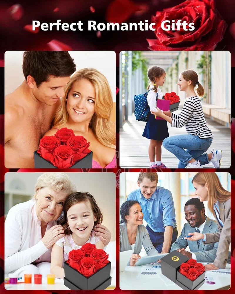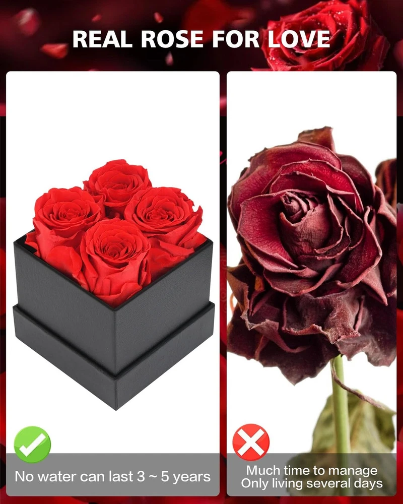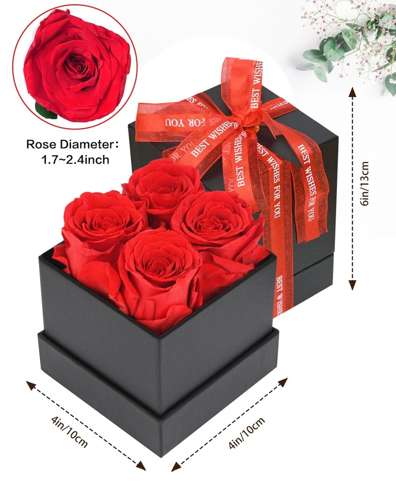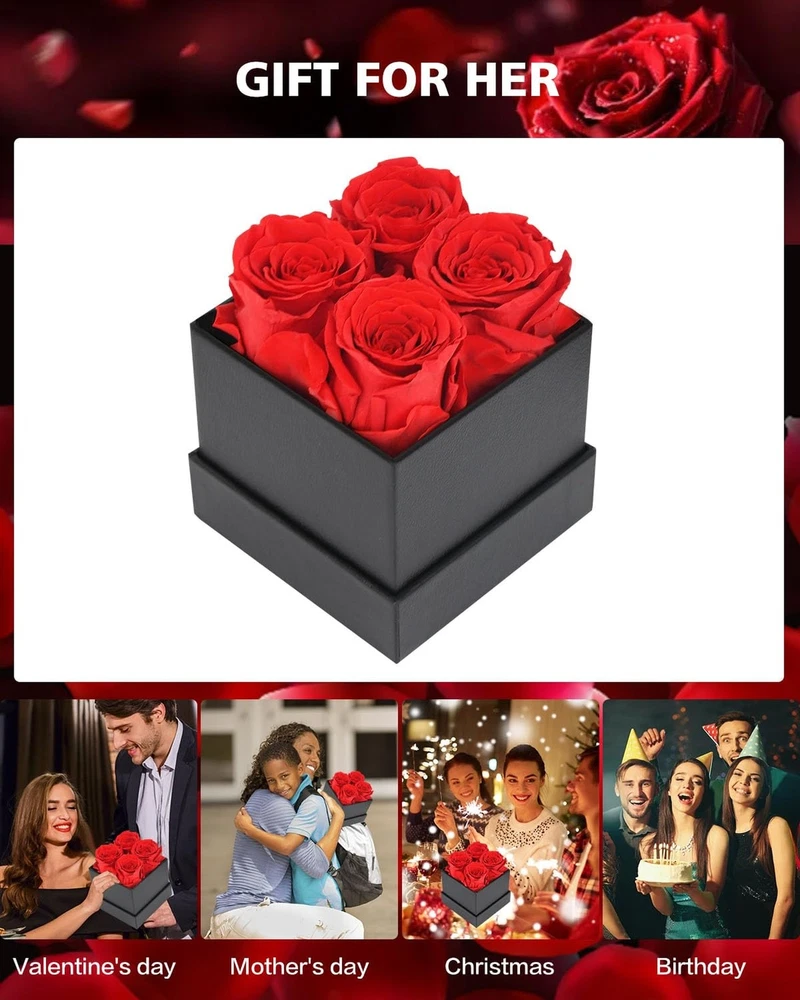 Preserved Flowers in a Box Gifts for Women: Forever Rose for Christmas Valentines Day Mom Grandma Wife Product Details Package Dimensions: 6.26 x 4.41 x 4.41 inches Item Weight: 11.7 ounces Country of Origin: China Item model number: 4PCS-Red Batteries required: No 4-Piece Forever Flowers in a Box: Creates romantic women gifts during family dinner, party, etc. Great Gifts for Women making her day sweet love. Give her a surprise, make her happy and create much romantics Long-Lasting Roses: Preserved flower forever love is a symbol of eternal love which is made of fresh rose, can perfectly and eternally stay fresh for up to 5 years. Perfect home room gifts or create romantic gifts for her, rose gifts of appreciation,best wishes,love and romantic Rose Flowers for Her: Flowers rose for delivery prime, giving her surprise as soon as possible from husband, beautiful way to represent positive Gifts for Women: Flower gift could be keep longer as mom grandma girlfriend daughter gifts for wedding valentine's day birthday mothers day xmas anniversary engagement christmas gifts thanksgiving gifts marriage proposals new year's day graduation or other holiday day gift ideas Valentines Day Gifts for Her: Pick up this rose gift for women to express your forever love, appreciation and true respect, a symbol of you are the one, special, unique, beautiful romantic way to appreciation and true love
