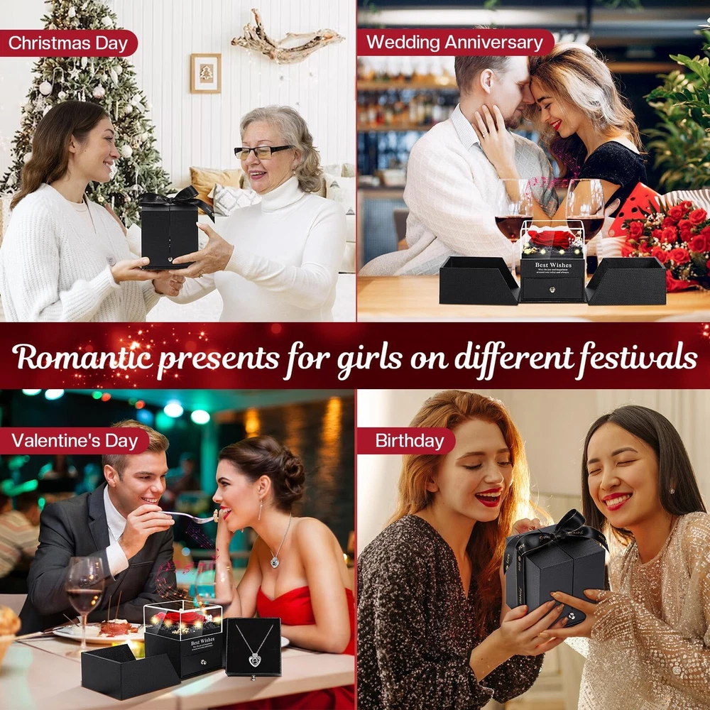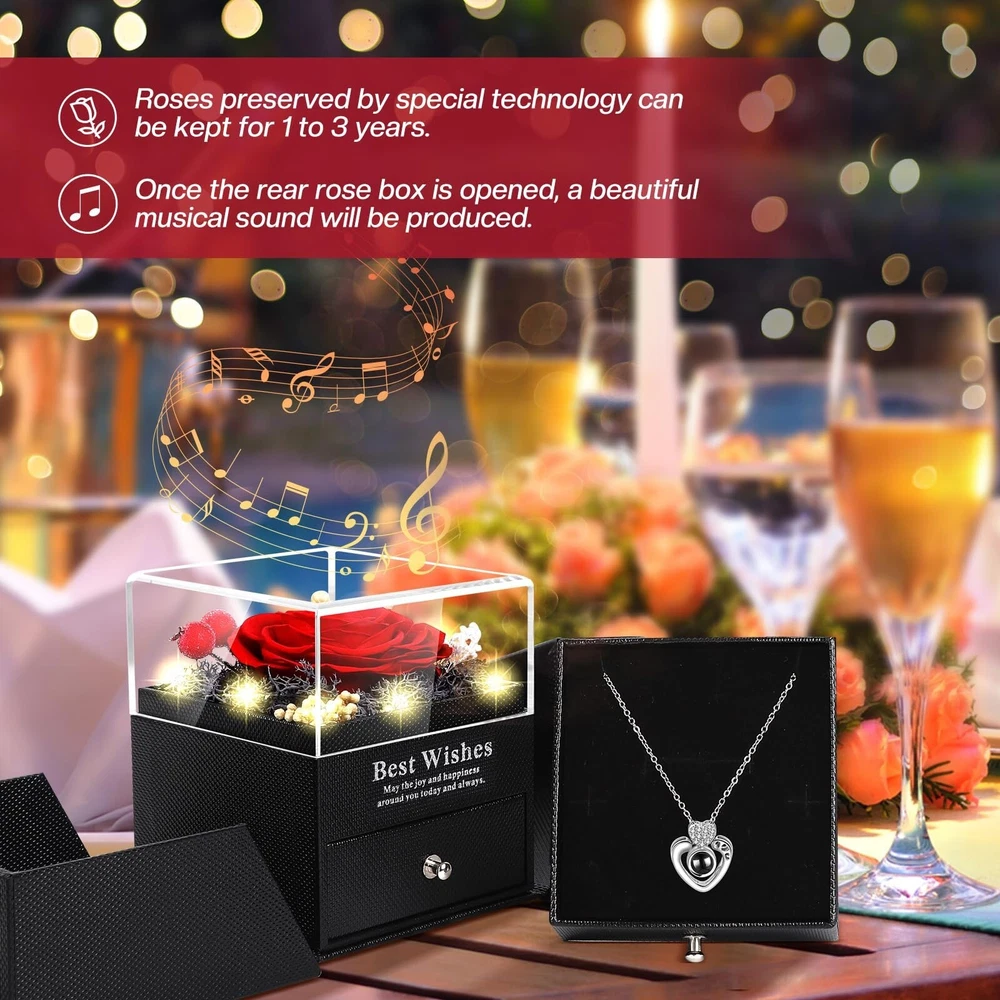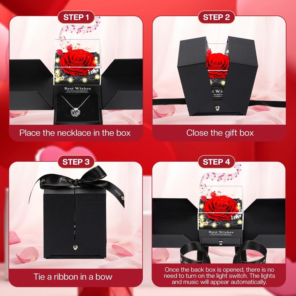 Preserved Real Rose Gift Box with Necklace, Eternal Flowers Rose Birthday Gifts Music Box for Her Mom Wife Grandma Girlfriend on Valentines Mothers Day Christmas Anniversary (Red) Product Details Color: Red Brand: NERCHVO MPN: XJYYH-Red UPC: Does not apply EAN: Does not apply Package Dimensions: 5.12 x 4.8 x 4.65 inches Item Weight: 1.04 pounds Manufacturer: NERCHVO Country of Origin: China Item model number: XJYYH-Red Batteries required: No Eternal Love Preserved Real Rose: Experience the beauty of our Eternal rose, crafted from 100% natural roses through a meticulous handmade process. This stunning flower can be preserved for 3-5 years without any watering or maintenance, making it a perfect symbol of eternal love. Ideal for anniversaries, birthdays, and special occasions, it's a timeless gift for your loved ones Heartfelt Gift with Necklace: Surprise her with a unique double heart-shaped necklace engraved with "I Love You" in 100 languages. This romantic piece is nestled at the bottom of the rose box, serving as a heartfelt token of your affection. The intertwined hearts symbolize unbreakable bonds, making it an exclusive gift for her Birthday Gifts for Women: This beautifully packaged set includes 1 Preserved Rose and 1 Double Heart Necklace, making it a thoughtful present for birthdays, Mother's Day, Valentine's Day, and anniversaries. Whether for your girlfriend, wife, mother, daughter, or grandma, this gift is sure to delight and convey your love Magical Light & Music Experience: Enhance the romantic gesture with our exquisite music box. When opened, integrated lights illuminate the stunning rose while soothing music plays, creating a magical atmosphere. With an automatic timer, the lights gently fade after five minutes, ensuring a captivating moment without manual intervention All-Inclusive Gift Set: Each package comes beautifully wrapped and includes everything you need: 1 Preserved Eternal Rose, 1 Gift Box, 1 Double Heart Necklace, 1 Gift Bag, and 1 Greeting Card. This luxurious gift set is ready to impress, making it easy to show your love and appreciation on any occasion