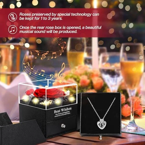 Return Policy Fast Delivery Trusted seller Preserved Real Rose Gift Box with Necklace, Eternal Flowers Rose Birthday Gifts Music Box for Her Mom Wife Grandma Girlfriend on Valentines Mothers Day Christmas Anniversary (Red) Product Description Eternal Love Preserved Real Rose: Experience the beauty of our Eternal rose, crafted from 100% natural roses through a meticulous handmade process. This stunning flower can be preserved for 3-5 years without any watering or maintenance, making it a perfect symbol of eternal love. Ideal for anniversaries, birthdays, and special occasions, it's a timeless gift for your loved ones Heartfelt Gift with Necklace: Surprise her with a unique double heart-shaped necklace engraved with "I Love You" in 100 languages. This romantic piece is nestled at the bottom of the rose box, serving as a heartfelt token of your affection. The intertwined hearts symbolize unbreakable bonds, making it an exclusive gift for her Birthday Gifts for Women: This beautifully packaged set includes 1 Preserved Rose and 1 Double Heart Necklace, making it a thoughtful present for birthdays, Mother's Day, Valentine's Day, and anniversaries. Whether for your girlfriend, wife, mother, daughter, or grandma, this gift is sure to delight and convey your love Magical Light & Music Experience: Enhance the romantic gesture with our exquisite music box. When opened, integrated lights illuminate the stunning rose while soothing music plays, creating a magical atmosp. With an automatic timer, the lights gently fade after five minutes, ensuring a captivating moment without manual intervention All-Inclusive Gift Set: Each package comes beautifully wrapped and includes everything you need: 1 Preserved Eternal Rose, 1 Gift Box, 1 Double Heart Necklace, 1 Gift Bag, and 1 Greeting Card. This luxurious gift set is ready to impress, making it easy to show your love and appreciation on any occasion Shipping Returns Payment Shipping Shipping is FREE to all addresses other than APO/PO boxes in the lower 48 states. All our stock ships from US-based warehouses. Shipped via USPS or UPS (depending on location and package weight) Unless stated otherwise, all orders will ship within 24-72 hours of your payment being processed. Check our feedback to see the great reviews of FAST shipping we offer. Returns Seller does not accept returns Payment We currently accept payment via eBay managed payments only. Once payment is cleared, we will dispatch your shipment within 1-3 business days. Please refer to the "Shipping" tab for more information regarding shipping speed to your destination.