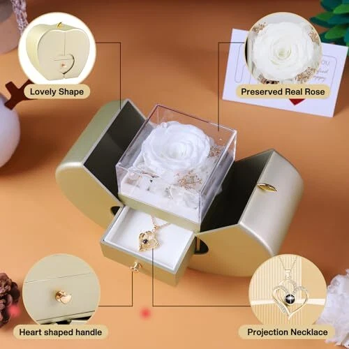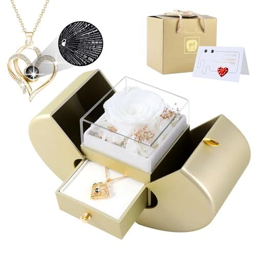 Return Policy Fast Delivery Trusted seller Preserved Rose Beige gold Box with I Love You Necklace 100 Languages, Gifts For Her Mom Wife Women Sister Grandma Girlfriend,Gifts Ideas For Valentines Day Christmas Birthday Mothers Day Anniversary Product Description ?【What you get】The red rose necklace set includes a jewelry necklace with 100 languages I LOVE YOU,a gift box of rose,and a gift card (You can fill in by yourself ). ?【Cute Preserved Rose】What could be more attractive to women than these two things? This is a exquisite gift with unique design, meaning unique love.The preserved flower never withers means eternal love.It is the best Christmas Gifts to your lover, eternal flower, forever love, can be stored for 3-5 years without watering and management. ?【I LOVE YOU in100 Ways】I LOVE YOU necklace in 100 languages is a perfect gift for girlfren,mom,grandma and sisiter,and it means t are 100 love ways. As an exquisite luxury gift, it can also store other jewelry or rings. ?【Great Gift Ideas】Cute Gifts for Wife, Mom,Girlfriend, Fiancée, Daughter, Grandma ,Sister,as Christmas, Mother's Day, Valentine's Day, Thanksgiving, Wedding, Anniversary, Birthday or other Holiday Gifts for Women. ?【How to See the I Love You in 100 Languages】In a well-lit environment , bring the stone in the middle of the necklace close to your eyes .Or go to a dark area with little to no light , turn on the camera function of the phone and point the camera at the stone .You will see 100 languages on the screen. ?【Package & Service】Rose flower and Heart necklace in the exquisite gift box, Comes with a gift card (You can fill in by yourself ) and necklace instructions.The necklace is in the plastic bag in the drawer of the jewelry box. You need to adjust the necklace and put it in the drawer. Shipping Returns Payment Shipping Shipping is FREE to all addresses other than APO/PO boxes in the lower 48 states. All our stock ships from US-based warehouses. Shipped via USPS or UPS (depending on location and package weight) Unless stated otherwise, all orders will ship within 24-72 hours of your payment being processed. Check our feedback to see the great reviews of FAST shipping we offer. Returns Seller does not accept returns Payment We currently accept payment via eBay managed payments only. Once payment is cleared, we will dispatch your shipment within 1-3 business days. Please refer to the "Shipping" tab for more information regarding shipping speed to your destination.