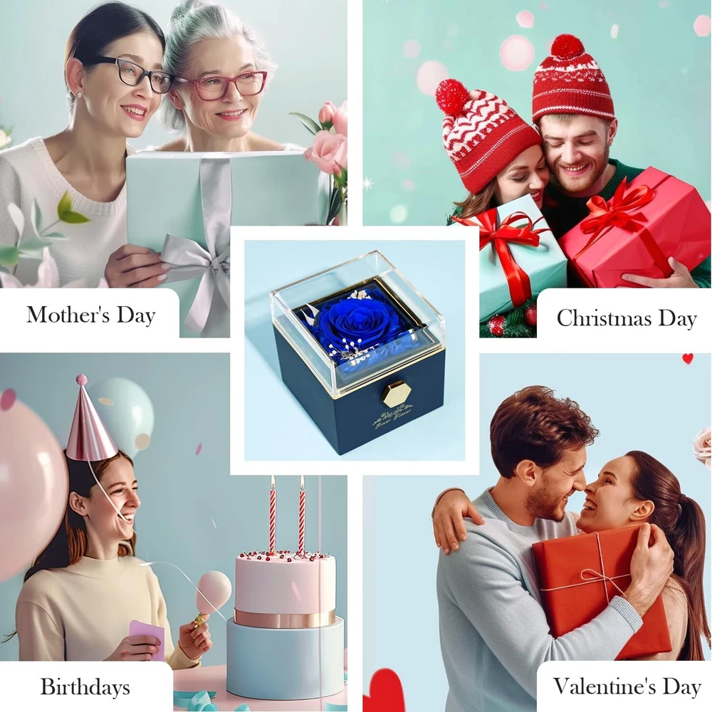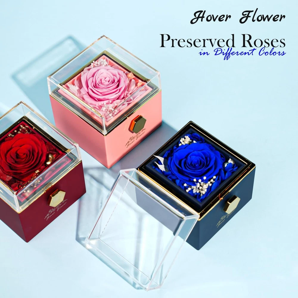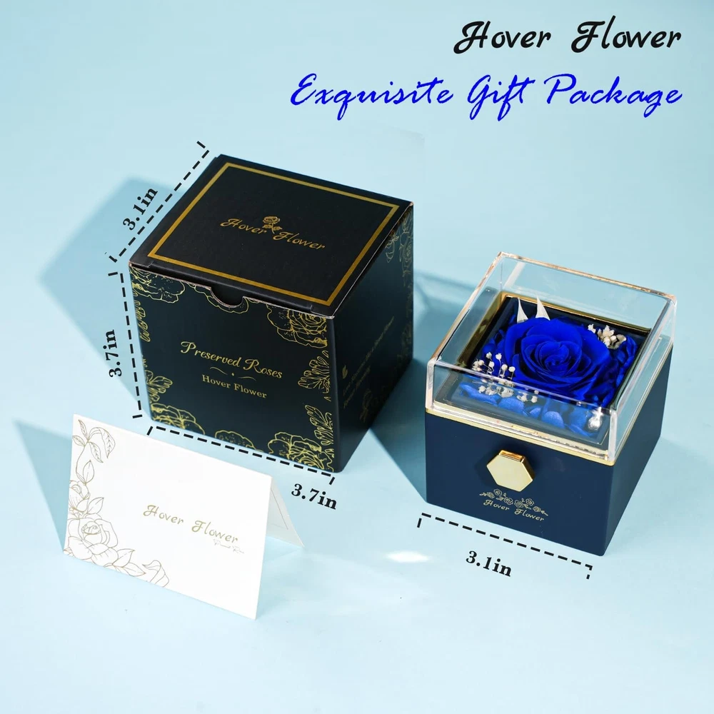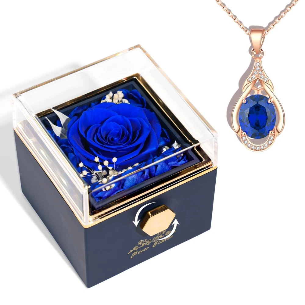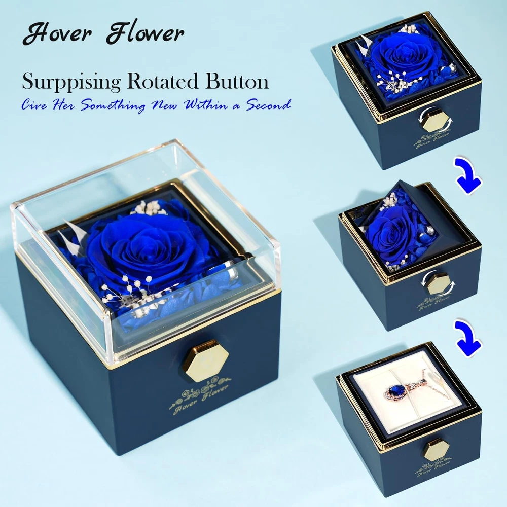 Preserved Rose-Eternal Flowers Jewelry Box, rotatable Preserved Flowers Gift Box with Necklace, Rose Jewelry Box for Her Mom Grandma Wife Girlfriend on Mother's Day Valentine's Day (Blue) Product Details Product Dimensions: 3.14 x 3.14 x 3.14 inches Item Weight: 5.6 ounces Manufacturer: Hover Flower Batteries required: No Import: Imported Eternal Roses, Forever LoveThe Preserved Roses collection has the motto of "Love That Never Ends", and the large everlasting roses are placed in a clear glass cover so that you can enjoy their beauty and freshness without having to open them. Perfect Gift for WomenThis Forever Rose Necklace Gift Box is made with exquisite craftsmanship and a unique design to symbolize your deep feelings. Give this romantic rose necklace gift box to your loved one and spend a wonderful day together. It is suitable for a wedding anniversary, Valentine's Day, Mother's Day, mom's birthday, and Christmas, hurry up to order a gift for her. Hand-MadeEternal Rose Gift Box is made of natural fresh roses. After dehydration and drying, hand assembling, and other multiple processes, each one is unique, the Preserved rose box does not need watering, sunlight, or pollen allergies, and can be kept for 3-5 years when placed in a cool and ventilated place What You GetThe Preserved Rose Box with rotating design. The rotating rose box hides romance and mystery, the moment she turns the eternal rose box into a beautiful crystal necklace, in addition, we come with a delicate card, where you can write down what you want to say to her, the included gift box you don't need to buy anything else. High-Quality ServiceThis Forever Rose Jewelry Box can not only be used as a gift but also can be used as an interior decoration to add color to the room, if you have any questions, please feel free to contact our customer service team, we will do our best to make you satisfied!