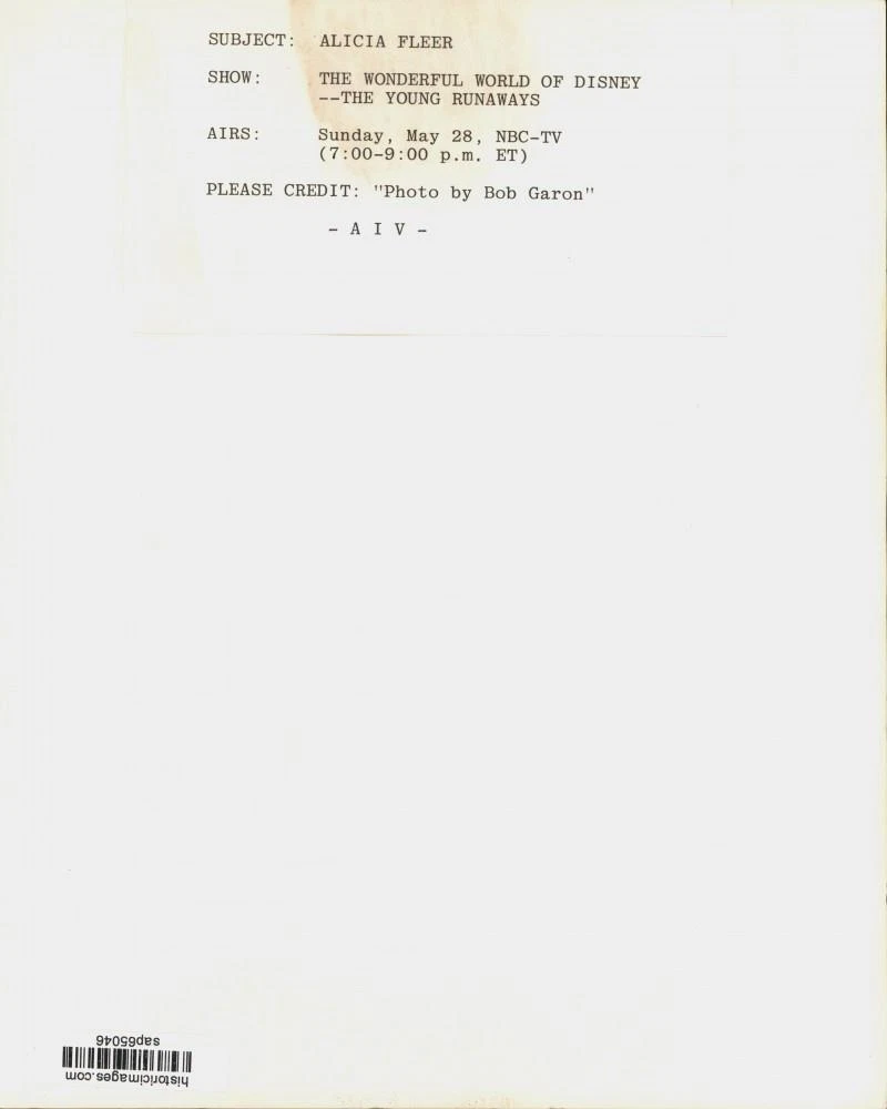ebay template Note: Please study the images carefully to determine the condition of this vintage photograph, as it may not be in perfect condition. It may contain wrinkles, cracks, and possibly even tears due to its age and how it was handled before it got to us. A scanner may interpret colors and contrast differently than human eyes will, so it is possible that the actual photograph may be slightly darker or lighter in person. This vintage photograph is offered for sale as a collectible item and conveys no transfer of copyright. Press Photo Actress Alicia Fleer in Disney's "The Young Runaways" on NBC-TV This is an original press photo. Subject: Alicia Fleer - Show: The Wonderful World of Disney - The Young Runaways - Airs: Sunday, May 28, NBC-TV (7:00-9:00 p.m. ET) Photo measures 8 x 10inches. Photo is dated --NONE. PHOTO FRONT PHOTO BACK Historic Images Part Number: sap65046 FAQs Q: Can I just download a digital version instead? A: No, we sell only vintage originals and do not make or distribute any copies, including digital ones. Q: Do you combine shipping and invoices? A: Multiple photos won on the same seller ID combine automatically through the eBay checkout process. If you encounter problems with this, send us a message via eBay messaging and we will send you an invoice. Due to eBay limitations, we cannot combine items won on our different seller IDs for a single shipping charge. Q: How quickly do you ship the items once paid? A: We ship within one business day after your payment clears. If you do not receive an "order shipped" email from us by the close of the second business day from submitting payment, please e-mail us via eBay messaging. Q: How do you make sure my photograph arrives safely? A: We package each order between two cross-corrugated pieces of cardboard to ensure that the package is as difficult to bend as possible. We then wrap each order in a plastic sheet to help protect against moisture. We want you to rest assured that we take every precaution to ensure that the photograph you receive will be in the same condition in your care as it was in ours. Q: Will the "Historic Images" watermark be on my photo when I receive it? A: No. This is a digital watermark we use to protect our images. It is not printed on the photo. Q: What are your office hours? A: eBay for us is a business, and a very fun one to be in! We are open M-F 9 to 5 (CST). Therefore, we do not return e-mails and phone calls over the weekend. We observe the following holidays: New Years Day, Memorial Day, Fourth of July, Labor Day, Thanksgiving and the day after Thanksgiving, Christmas Eve and Christmas Day. Q: Where did all these vintage photos come from? A: These original vintage photographs are from various news service and newspaper photo archives from locations around the country including: Boston, Detroit, Tampa, Chicago, Denver, Seattle, New Orleans, Milwaukee, Portland, Spokane, and more. We do not copy or reproduce any photographs -- every item is a unique vintage piece that was housed in a news archive. Q: Can I use this photograph in my book/blog/website? A: The short answer is no. There is no transfer of copyright for republication or reproduction with these photographs when you purchase them, and only photographs taken before 1923 are currently automatically in the public domain. Permission from the copyright holder, which usually can be identified from the back of each photo, must be sought to republish or reproduce the image for any purpose. Q: Do you relist items (in case I miss an auction ending)? A: Auction items that receive no bids are relisted in our store (historicimages-store on eBay) as a fixed-price item and at a higher price than the starting auction price. Q: Do you leave feedback? A: Yes, we always leave feedback for buyers. Our software monitors when our buyers leave us feedback, then notifies us that we can leave feedback for the buyer. Rest assured, if you leave feedback, we will do the same! Check out our family of eBay IDs: historicimages01 Sports Photos historicimages02 Entertainment Photos historicimages03 Americana Photos historicimages04 International & War Photos historicimages05 Transportation Photos historicimages06 Photos of All Subjects historicimages07 Entertainment Photos historicimages08 Newsworthy Photos historicimages09 Entertainment Photos historicimages10 Sports Photos historicimages-store Our largest fixed-price selection historicimages-gallery Hand-picked photos Saturday night auctions About Us Historic Images was formed in September 2009, with a handful of scanners working out of a basement to digitize newspaper photo archives. We have since moved out of the basement, and we can now archive thousands of photos per day. Our company has worked with magazines and newspapers from Detroit, Boston, Denver, Seattle, Tampa, Chicago, and New Orleans, just to name a few. We are constantly adding to our inventory, and have assembled an archive of millions of photos to date. As our company evolved, we began our eBay business, which brings thousands of fresh auctions per week to the world's largest online auction marketplace. Our custom software systems and team of great employees allow us to efficiently scan and sell large photo archives online. At the very core of our company's DNA is a strong commitment to customer satisfaction and strict integrity for our product. Our promise to you is that we will do everything in our power to provide you a great buying experience. Copyright 2009 - Present, Historic Images, Inc. Sell Smarter with Kyozou. Inventory and Ecommerce Management