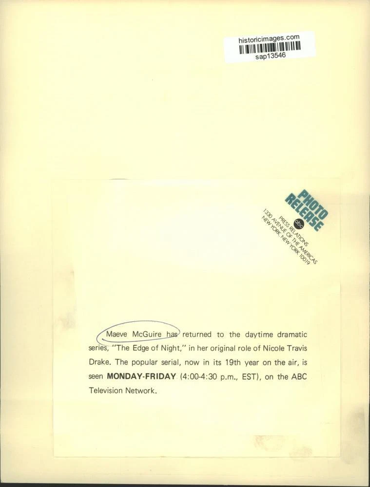 ebay template Note: Please study the images carefully to determine the condition of this vintage photograph, as it may not be in perfect condition. It may contain wrinkles, cracks, and possibly even tears due to its age and how it was handled before it got to us. A scanner may interpret colors and contrast differently than human eyes will, so it is possible that the actual photograph may be slightly darker or lighter in person. This vintage photograph is offered for sale as a collectible item and conveys no transfer of copyright. Press Photo Actress Maeve McGuire in "The Edge of Night" on ABC Television This is an original press photo. Maeve McGuire has returned to the daytime dramatic series, "The Edge of Night," in her original role of Nicole Travis Drake. The popular serial, now in its 19th year on the air, is seen on the ABC Television Network. Photo measures 7 x 9.25 inches. Photo is dated --None. PHOTO FRONT PHOTO BACK Historic Images Part Number: sap13546 Sell Smarter with Kyozou. Inventory and Ecommerce Management
