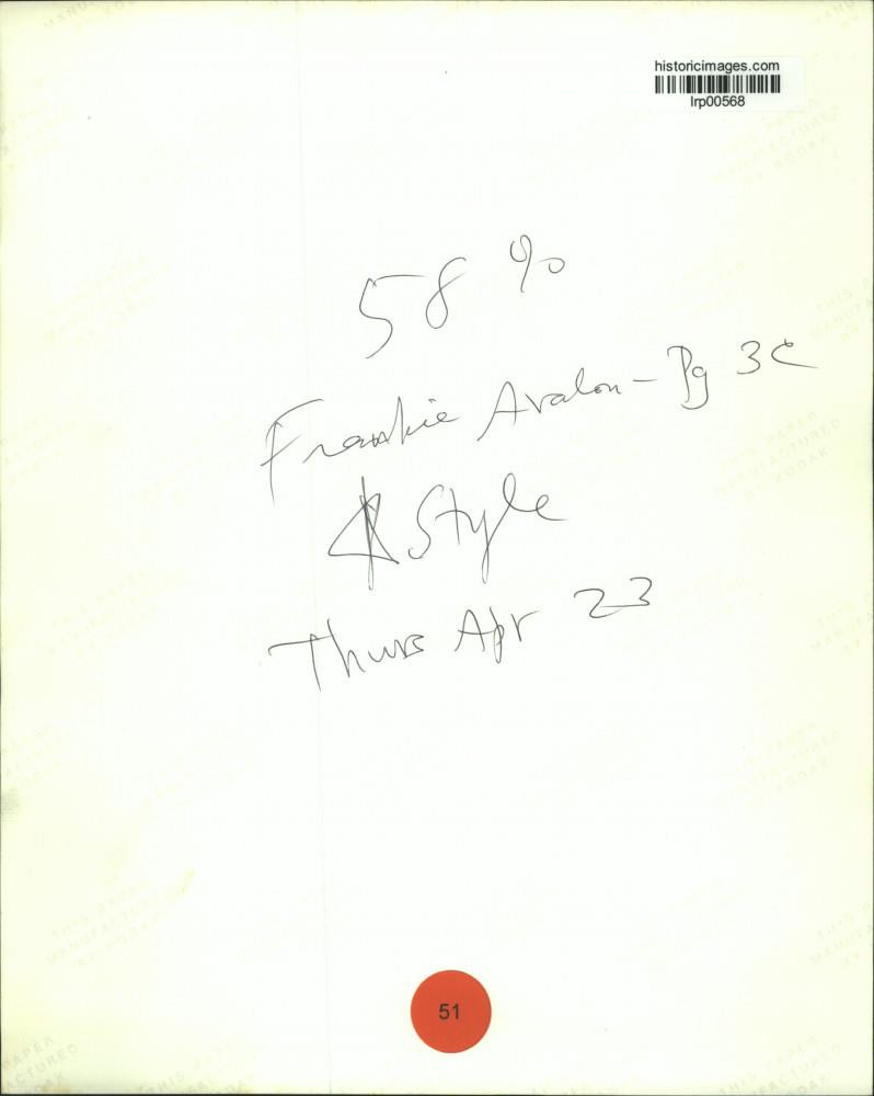 ebay template Note: Please study the images carefully to determine the condition of this vintage photograph, as it may not be in perfect condition. It may contain wrinkles, cracks, and possibly even tears due to its age and how it was handled before it got to us. A scanner may interpret colors and contrast differently than human eyes will, so it is possible that the actual photograph may be slightly darker or lighter in person. This vintage photograph is offered for sale as a collectible item and conveys no transfer of copyright. Press Photo Frankie Avalon, actor - lrp00568 This is an original press photo. Frankie Avalon, actor Photo measures 8 x 10.25inches. Photo is dated --none. PHOTO FRONT PHOTO BACK Historic Images Part Number: lrp00568 FAQs Q: Can I just download a digital version instead? A: No, we sell only vintage originals and do not make or distribute any copies, including digital ones. Q: Do you combine shipping and invoices? A: Multiple photos won on the same seller ID combine automatically through the eBay checkout process. If you encounter problems with this, send us a message via eBay messaging and we will send you an invoice. Due to eBay limitations, we cannot combine items won on our different seller IDs for a single shipping charge. Q: How quickly do you ship the items once paid? A: We ship within one business day after your payment clears. If you do not receive an "order shipped" email from us by the close of the second business day from submitting payment, please e-mail us via eBay messaging. Q: How do you make sure my photograph arrives safely? A: We package each order between two cross-corrugated pieces of cardboard to ensure that the package is as difficult to bend as possible. We then wrap each order in a plastic sheet to help protect against moisture. We want you to rest assured that we take every precaution to ensure that the photograph you receive will be in the same condition in your care as it was in ours. Q: Will the "Historic Images" watermark be on my photo when I receive it? A: No. This is a digital watermark we use to protect our images. It is not printed on the photo. Q: What are your office hours? A: eBay for us is a business, and a very fun one to be in! We are open M-F 9 to 5 (CST). Therefore, we do not return e-mails and phone calls over the weekend. We observe the following holidays: New Years Day, Memorial Day, Fourth of July, Labor Day, Thanksgiving and the day after Thanksgiving, Christmas Eve and Christmas Day. Q: Where did all these vintage photos come from? A: These original vintage photographs are from various news service and newspaper photo archives from locations around the country including: Boston, Detroit, Tampa, Chicago, Denver, Seattle, New Orleans, Milwaukee, Portland, Spokane, and more. We do not copy or reproduce any photographs -- every item is a unique vintage piece that was housed in a news archive. Q: Can I use this photograph in my book/blog/website? A: The short answer is no. There is no transfer of copyright for republication or reproduction with these photographs when you purchase them, and only photographs taken before 1923 are currently automatically in the public domain. Permission from the copyright holder, which usually can be identified from the back of each photo, must be sought to republish or reproduce the image for any purpose. Q: Do you relist items (in case I miss an auction ending)? A: Auction items that receive no bids are relisted in our store (historicimages-store on eBay) as a fixed-price item and at a higher price than the starting auction price. Q: Do you leave feedback? A: Yes, we always leave feedback for buyers. Our software monitors when our buyers leave us feedback, then notifies us that we can leave feedback for the buyer. Rest assured, if you leave feedback, we will do the same! Check out our family of eBay IDs: historicimages01 Sports Photos historicimages02 Entertainment Photos historicimages03 Americana Photos historicimages04 International & War Photos historicimages05 Transportation Photos historicimages06 Photos of All Subjects historicimages07 Entertainment Photos historicimages08 Newsworthy Photos historicimages09 Entertainment Photos historicimages10 Sports Photos historicimages-store Our largest fixed-price selection historicimages-gallery Hand-picked photos Saturday night auctions About Us Historic Images was formed in September 2009, with a handful of scanners working out of a basement to digitize newspaper photo archives. We have since moved out of the basement, and we can now archive thousands of photos per day. Our company has worked with magazines and newspapers from Detroit, Boston, Denver, Seattle, Tampa, Chicago, and New Orleans, just to name a few. We are constantly adding to our inventory, and have assembled an archive of millions of photos to date. As our company evolved, we began our eBay business, which brings thousands of fresh auctions per week to the world's largest online auction marketplace. Our custom software systems and team of great employees allow us to efficiently scan and sell large photo archives online. At the very core of our company's DNA is a strong commitment to customer satisfaction and strict integrity for our product. Our promise to you is that we will do everything in our power to provide you a great buying experience. Copyright 2009 - Present, Historic Images, Inc. Sell Smarter with Kyozou. Inventory and Ecommerce Management