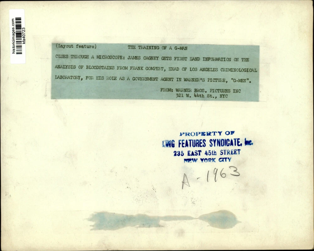 ebay template Note: Please study the images carefully to determine the condition of this vintage photograph, as it may not be in perfect condition. It may contain wrinkles, cracks, and possibly even tears due to its age and how it was handled before it got to us. A scanner may interpret colors and contrast differently than human eyes will, so it is possible that the actual photograph may be slightly darker or lighter in person. This vintage photograph is offered for sale as a collectible item and conveys no transfer of copyright. Press Photo James Cagney uses microscope to train with Frank Gompert for "G-Men" The Training of A G-Man --- Clues Through a Microscope: James Cagney gets firsthand information on the analysis of bloodstains from Frank Gompert, head of the Los Angeles Criminological Laboratory, for his role as a government agent in Warner's Picture, "G-Men." Photo measures 10 x 8 inches. Photo Is dated -- none. PHOTO FRONT PHOTO BACK Historic Images Part Number: kfa40723 Sell Smarter with Kyozou. Inventory and Ecommerce Management