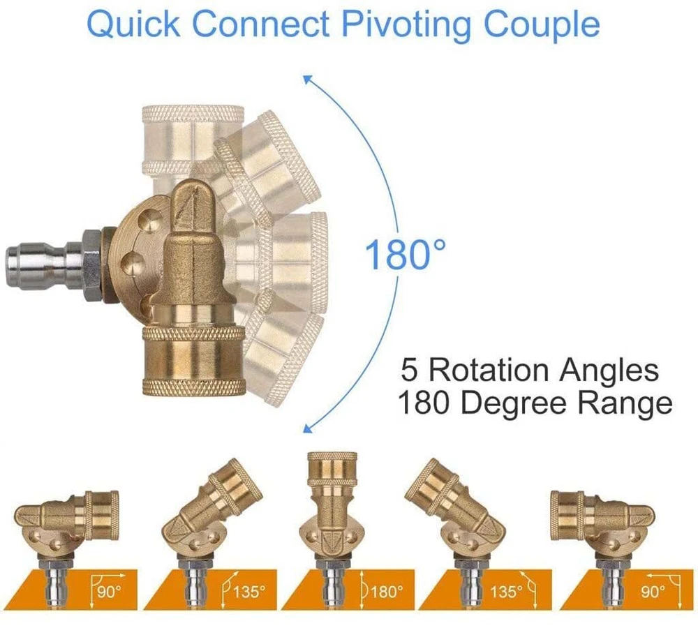 Universal pressure washer accessories fit most leading brands. Ideal for cleaning gutters, the underside of motor vehicles, watering plants, and cleaning hard-to-reach areas etc. 1.The universal pressure washer accessories have 7 Spray Nozzle Tips and 180 Degree Quick Connect Pivoting Coupler (Pivot Coupler), fit most leading brands of high pressure washer wands up to 4,500 PSI. 2.Including 1 pc Quick Connecting Pivoting Coupler to connect between the wand and nozzle tips. Pivot Coupler can adjust 180 degree for 5 different cleaning angles to get hard to reach areas, such as the bottom of your car, cars rims and gutter Nozzle Specifications: 1. Reddish orange pressure washer tip offer soap mode and blue offer rinse mode; 2. The other 5 tips have different angle degrees, 0, 15, 25, 40, 65. 3. Material: PA66 nozzle cover, stainless steel tips; 4. 1/4 Quick connection design; 5. High pressure: up to 4,500 PSI ; 6. Attached to a quick-connect wand or coupler. Reddish orange pressure washer tip offer soap mode and blue offer rinse mode; The other 5 tips have different angle degrees, 0, 15, 25, 40, 65. Material: PA66 nozzle cover, stainless steel tips; 1/4 Quick connection design; High pressure: up to 4,500 PSI Attached to a quick-connect wand or coupler.