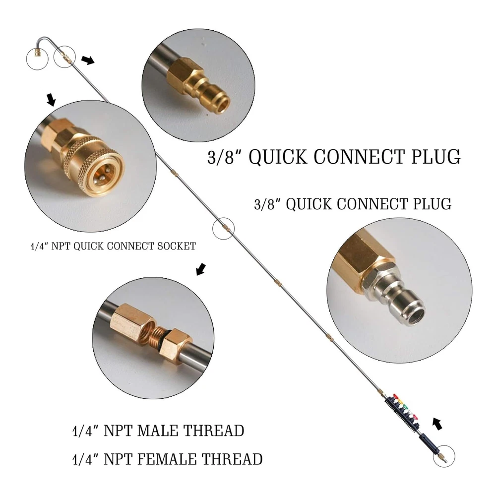 Package: Include 7 pack 15" high quality pressure washer wands, 5.9" 30°, 90° and U shape curved wands, 6 different sizes nozzle tips and 10 replacement rings. Material: pressure washer extension wand are made of solid brass and stainless steel. Maximum Working pressure: 4000 PSI. Maximum Working temperature: 140 ℉. 6 spray nozzle tips: 1/4" quick connector spray nozzle tips are for different use: 0, 15, 25, 40, 60 degree and soap nozzles. The various sizes can be used for most cleaning jobs. Connector: the size of the end of the extension wand is 1/4" quick conncetor, fit for all pressure washers with 1/4" quick conncetor. 4 types of extension wand: Come with 4 types of pressure washer extension wand, including 30°, 90°, U shape and straight wand, suit for cleaning, roof, wall, gutter, floor, corner, etc.