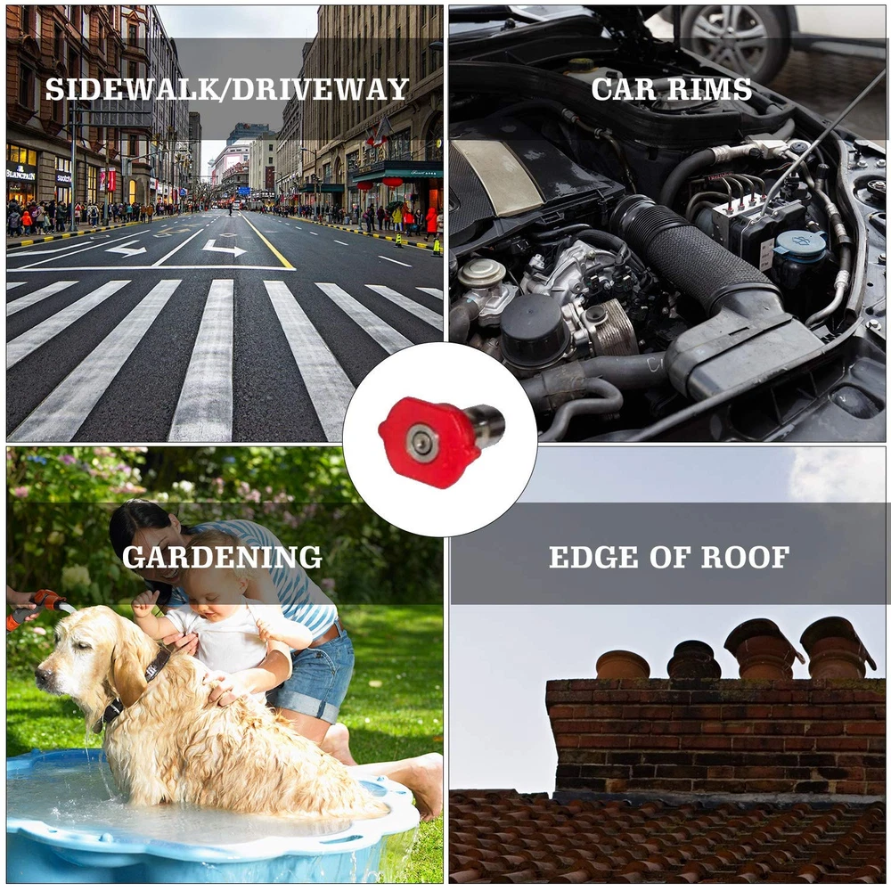 Package: Include 7 pack 15" high quality pressure washer wands, 5.9" 30°, 90° and U shape curved wands, 6 different sizes nozzle tips and 10 rings. Material: pressure washer extension wand are made of solid brass and stainless steel. Maximum Working pressure: 4000 PSI. Maximum Working temperature: 140 ℉. 6 spray nozzle tips: 1/4" quick connector spray nozzle tips are for different use: 0, 15, 25, 40, 60 degree and soap nozzles. The various sizes can be used for most cleaning jobs. Connector: the size of the end of the extension wand is 1/4" quick conncetor, fit for all pressure washers with 1/4" quick conncetor. 4 types of extension wand: Come with 4 types of pressure washer extension wand, including 30°, 90°, U shape and straight wand, suit for cleaning, roof, wall, gutter, floor, corner, etc.