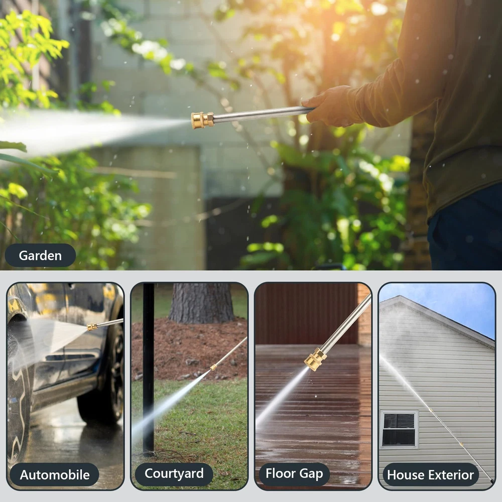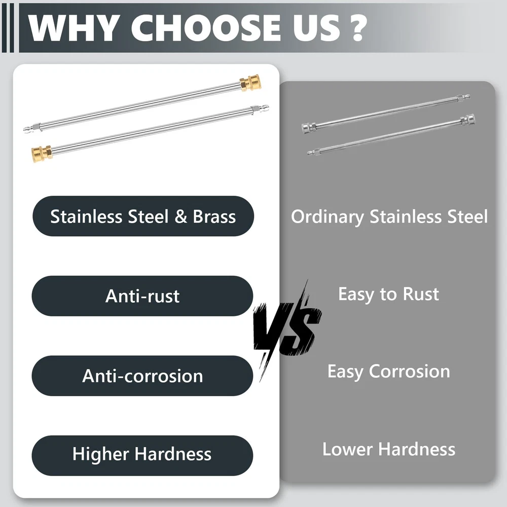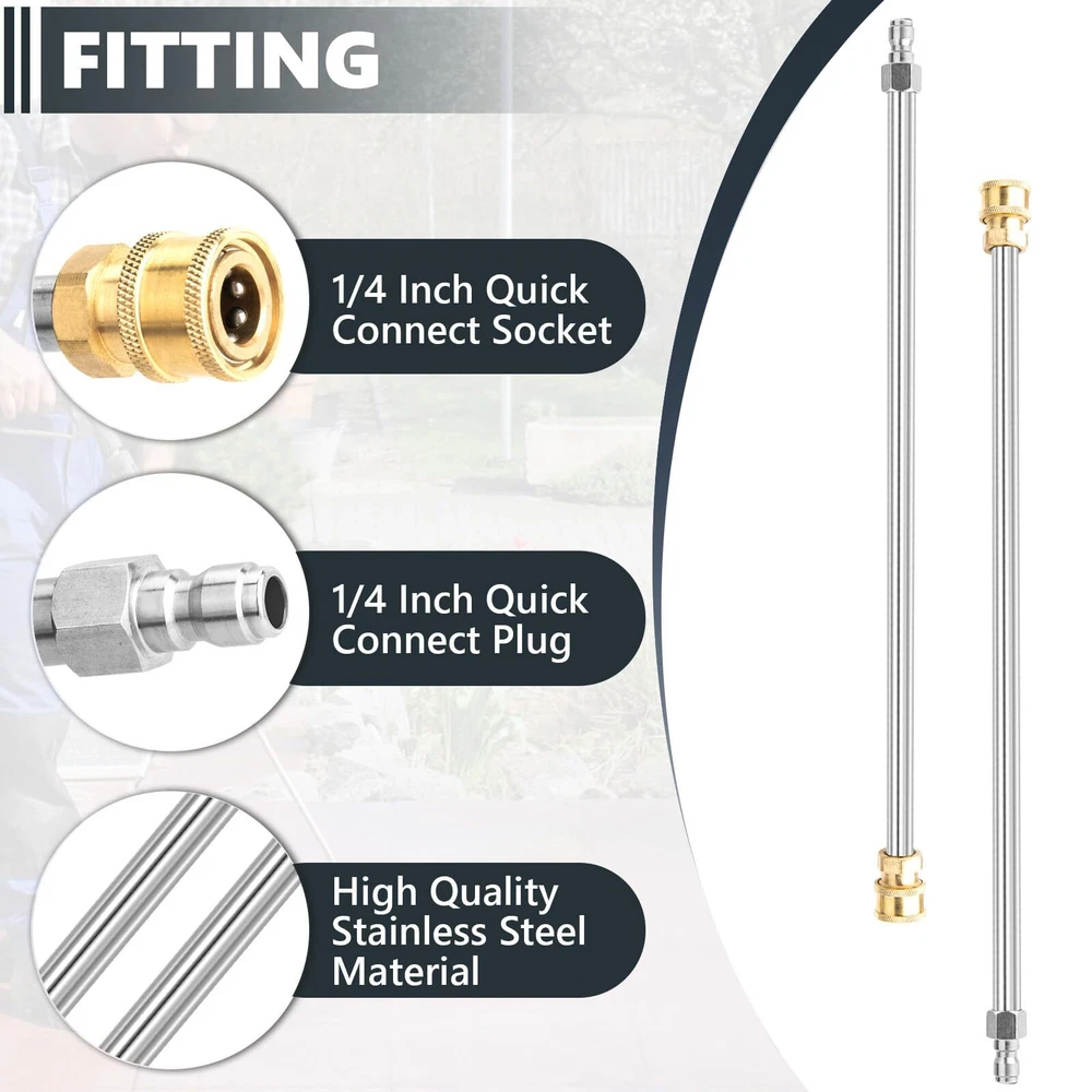 Universal Fit: Our pressure washer extension wand is compatible with a wide range of pressure washer accessories, including pressure washer guns, surface cleaners, water brooms, and undercarriage washers. High-Quality Materials: Made from stainless steel with brass fittings, the 17-inch spray lance ensures durability and longevity, even in demanding applications. Each pack includes two extension wands. Excellent Compatibility: Featuring a 1/4-inch quick connect and 1/4-inch quick plug, our extension wand is compatible with most pressure washer guns and spray nozzles. Easy installation saves you time and effort.Orifice size/dimensions: 0.25 Inches, Barb fitting. High Pressure: Designed to withstand up to 4000 PSI, our pressure washer wand fits most brands of pressure washers, providing powerful cleaning capabilities to make your cleaning tasks more efficient. Get Pro Results at DIY Prices: Premium build quality and universal compatibility deliver professional cleaning power at a fraction of service costs. Transform your pressure washer into a commercial-grade cleaning tool - without breaking the bank.