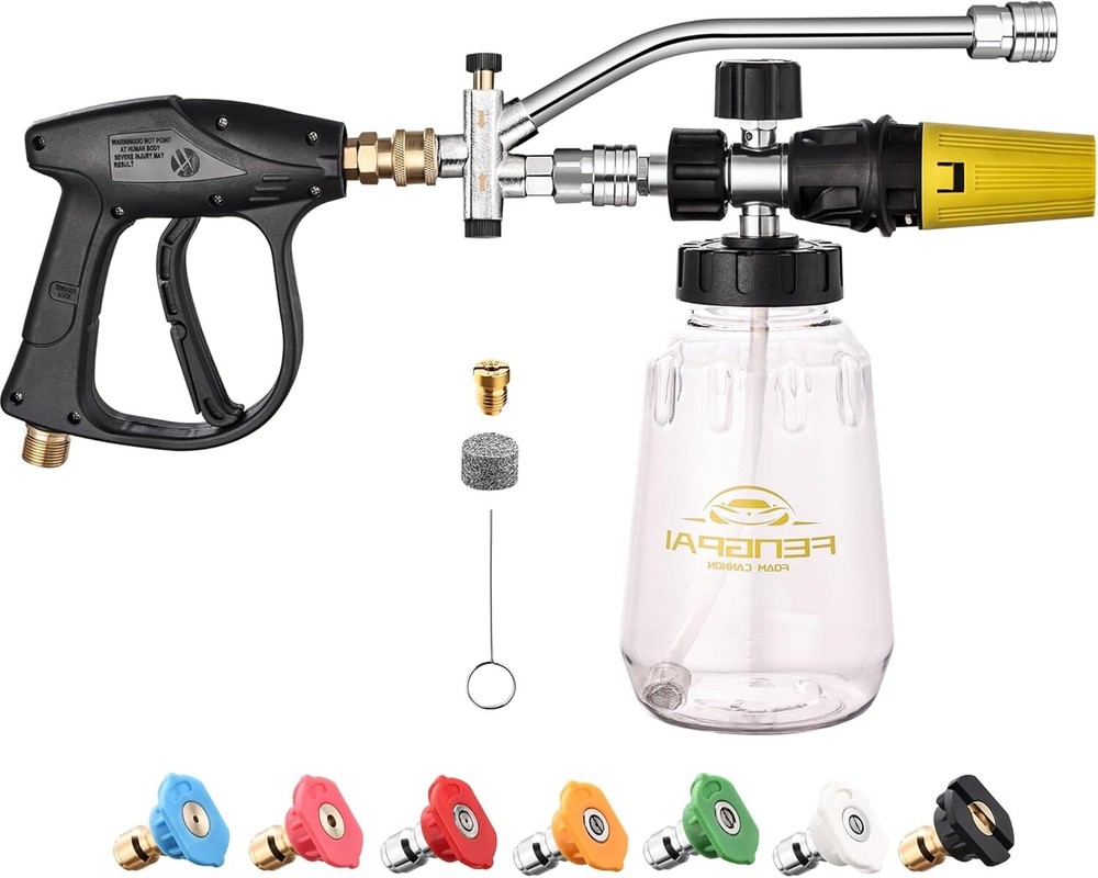 Pressure Washer Foam Cannon Gun Kit with Dual Connector Accessory, Car Wash Foam Gun for Car Washing and Cleaning, 1/4" Quick Connect with 7pcs Nozzles, Dual Adjustable Snow Foam Lance Dual Connector Foam Cannon: Our pressure washer foam cannon features a unique design with two different connector ends - a longer one for the power washer nozzle to water washing and a shorter one for the snow foam cannon to foam washing. This design simplifies the use process, easily switch between water and foam modes, improves efficiency Snow Foam Cannon with Short Gun: 1 Liter / gallon snow foam cannon with a detachable 1/4'' quick connector and a pressure washer short gun, you can choice the connector according to your pressure washer gun. Turn the top knob right (-) and the top knob left (+) to adjust to the desired foam level, adjust nozzle to control the spray area and horizontal/vertical 7 Spray Nozzles: Each nozzle orifice size is , different nozzles have different spray angle (0, 15, 25, 40, 65 degree, Risen and Soap). According to your cleaning purpose, choose different nozzle, washing car, garden, roof or more, universal 1/4’’quick connector. Tips: Please make sure that the nozzle is clean; If there is no enough water, release the gas after you add water, it will not work normally Widely Use: Constructed from premium-grade materials, our power washer foam cannon connector promises exceptional durability and reliability for prolonged use. Which is widely used for various cleaning applications, such as motorcycle, car, roofs, driveways, floors, windows washing. And more helpful for detailing Trucks or SUVs What You Get: Our snow foam cannon working pressure is 1000 psi to 3600 psi. Additional orifice nozzle is included for improved performance. Package contains a dual-purpose switch spray gun, a spray bottle for easy detergent mixing, a pressure washer gun for precise control, and 7 power washer sprayer nozzles