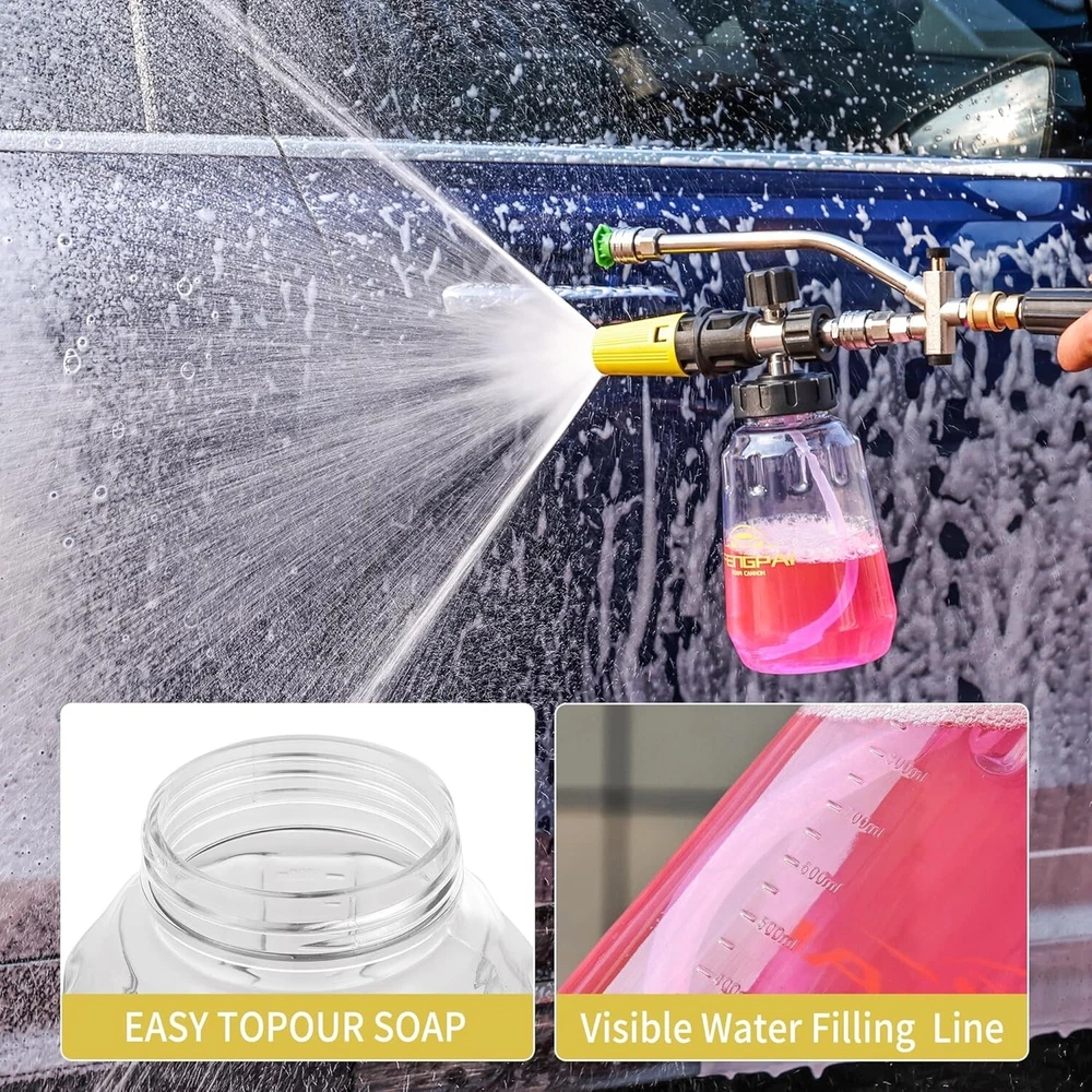 Pressure Washer Foam Cannon Gun Kit with Dual Connector Accessory, Car Wash Foam Gun for Car Washing and Cleaning, 1/4" Quick Connect with 7pcs Nozzles, Dual Adjustable Snow Foam Lance Dual Connector Foam Cannon: Our pressure washer foam cannon features a unique design with two different connector ends - a longer one for the power washer nozzle to water washing and a shorter one for the snow foam cannon to foam washing. This design simplifies the use process, easily switch between water and foam modes, improves efficiency Snow Foam Cannon with Short Gun: 1 Liter / gallon snow foam cannon with a detachable 1/4'' quick connector and a pressure washer short gun, you can choice the connector according to your pressure washer gun. Turn the top knob right (-) and the top knob left (+) to adjust to the desired foam level, adjust nozzle to control the spray area and horizontal/vertical 7 Spray Nozzles: Each nozzle orifice size is , different nozzles have different spray angle (0, 15, 25, 40, 65 degree, Risen and Soap). According to your cleaning purpose, choose different nozzle, washing car, garden, roof or more, universal 1/4’’quick connector. Tips: Please make sure that the nozzle is clean; If there is no enough water, release the gas after you add water, it will not work normally Widely Use: Constructed from premium-grade materials, our power washer foam cannon connector promises exceptional durability and reliability for prolonged use. Which is widely used for various cleaning applications, such as motorcycle, car, roofs, driveways, floors, windows washing. And more helpful for detailing Trucks or SUVs What You Get: Our snow foam cannon working pressure is 1000 psi to 3600 psi. Additional orifice nozzle is included for improved performance. Package contains a dual-purpose switch spray gun, a spray bottle for easy detergent mixing, a pressure washer gun for precise control, and 7 power washer sprayer nozzles