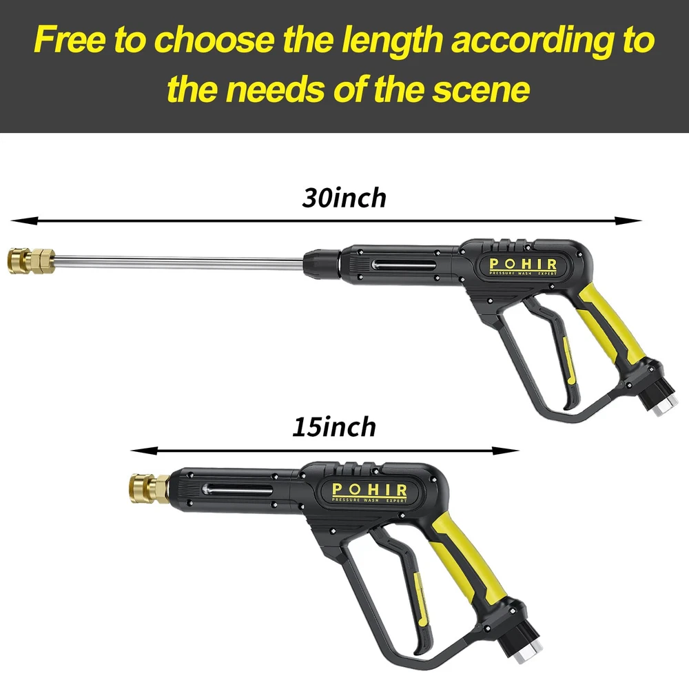 【Premium pressure washer gun】3600 PSI Max pressure, 8GPM Max Flow. Max temperature of water is rated to 60℃ / 140 F. With M22-14 and M22-15 fittings and 3/8'' connector for direct connection to 14mm or 15mm or 3/8'' inner diameter pressure hose fittings 【Compatible pressure washer】With different fittings like M22 14mm fitting,is compatible with Simpson, CraftsmanBriggs Stratton,Karcher, Ryobi pressure washer. M22 15mm fitting is compatible with Sun Joe, Campbell, MI-T-M, AR Blue, Stanley, Cleanforce, Simoniz power washer.Replacement short pressure washer gun fits gas and electric pressure washer with M22 fitting. 【16 inch Extension Wand】This wand make the total length of the gun 30 inches(If you need to connect the extension wand, please use a wrench to remove the 1/4 quick connector on the gun head). 【1/4''standard quick connector】Can be used with any accessory with a 1/4'' plug. Such as nozzles tips, foam cannon, water broom, pivoting coupler, undercarriage cleaner, surface cleaner. Comfortable handle design for easy handling. 【Package include】 1 x 3600psi pressure washer gun,1 x Extension wand,1 x M22 14mm conver fitting, 1 x M22 15mm conver fitting,1 x 3/8" quick connect fitting, 1 x pressure washer nozzle holder, 7 x pressure washer nozzles with different spray angle,Choose different nozzle according to your needs.