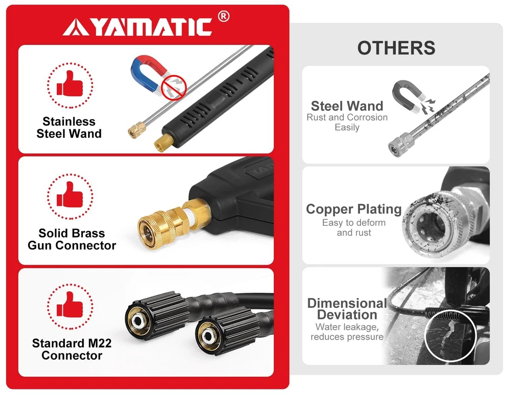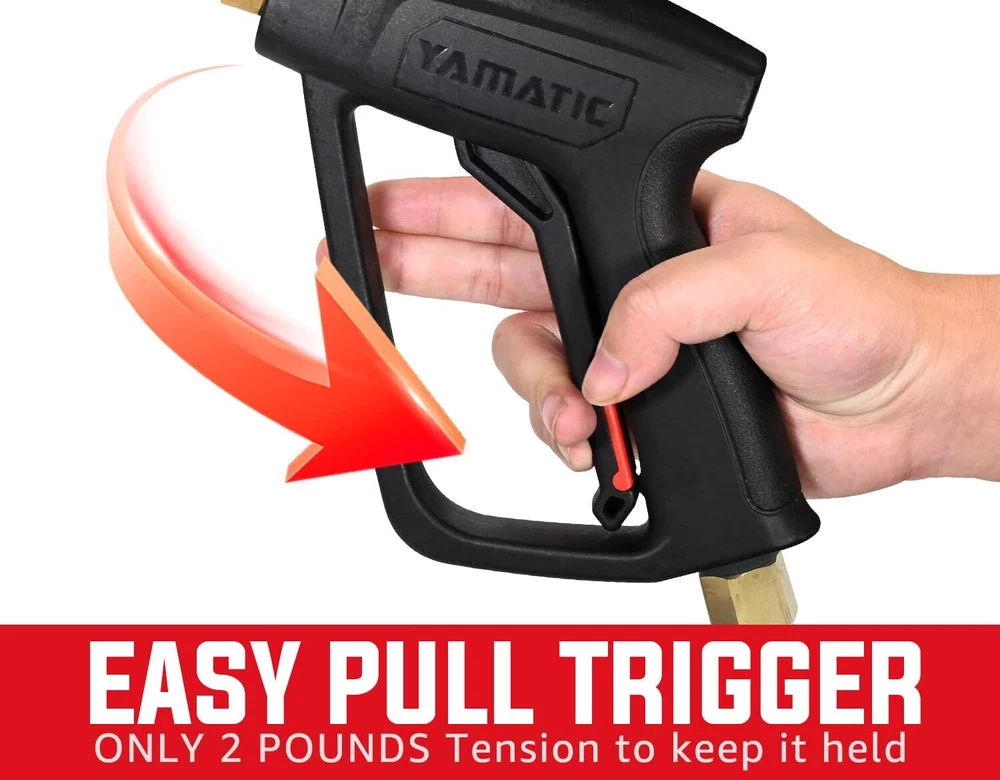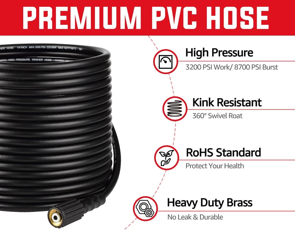 [Pressure Washer Gun Hose Kit] 4000PSI / 8GPM /140℉ High Pressure washer gun and wand kit, comes with the most popular 3200 PSI power washer hose, easy to reach places that hard to get. Meet your outdoor cleaning and business washing job requirements. Compatible with Simpson, Briggs & Stratton, CRAFTSMAN, Champion, Honda, Excell, Ryobi and other high pressure washers. PLEASE NOTE: NOT FIT FOR GARDEN HOSE OR WATER HOSE. [Commercial Power Washer Swivel Gun] This trigger gun is manufactured with shockproof reinforced material, high-quality solid brass components for maximum strength to ensure built to last. New Swivel 3/8" quick connector inlet allows the pressure washer hose to spin with your move while under pressure, avoids hose kink, and delivers water flow rates as expected, providing great flexibility and maneuverability. [3200 PSI Kink Resistant Pressure Washer Hose] Premium high-quality material hose merges with a unique high-tech manufacturing process, to provide you with an EASY carry, drag, and roll-up. With innovative high technology material and process management, new upgraded strength and wear resistance, this is perfect replacement pressure washer hose for a longer lifetime and safe use. [Universal Adaptability] High-pressure washer trigger gun comes with 2 extension lances, could be removed or extended to 3 lengths as you wish. Universal 1/4" quick connector outlet is compatible with multi high-pressure spray nozzle tips, foam cannon, turbo nozzle, surface cleaner. Suitable for cleaning cars, pool, windows, roofs, sidewalks, auto detailing business, garden tractor, etc. [Value Service] If you have any issues with this pressure washer hose and wand kit, please feel free to message at any time, we're online 7x24 ready for warranty & support. Welcome to check other pressure washer accessories at Power Center Store.