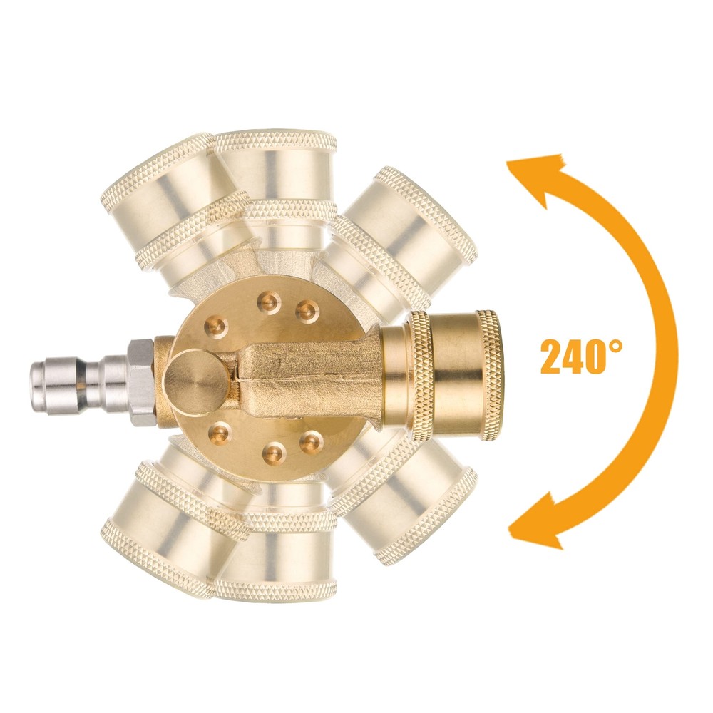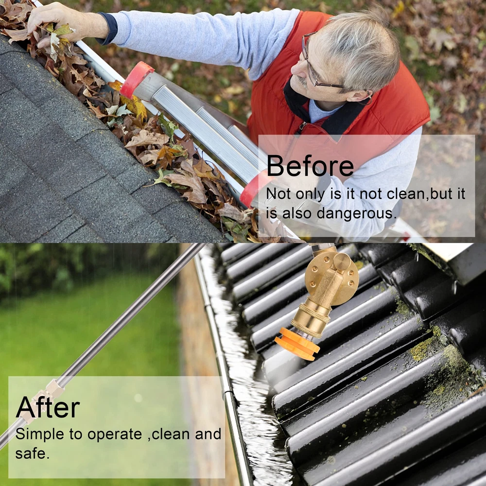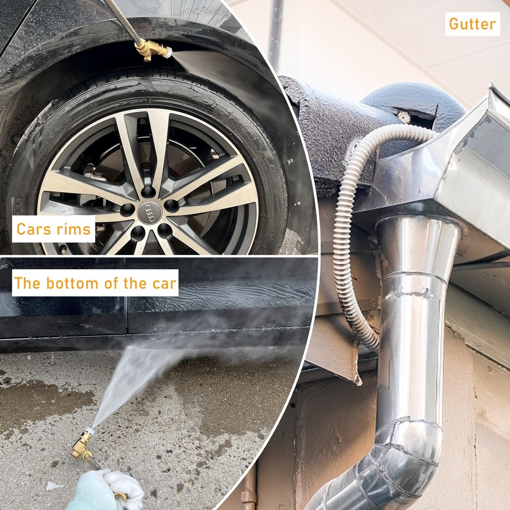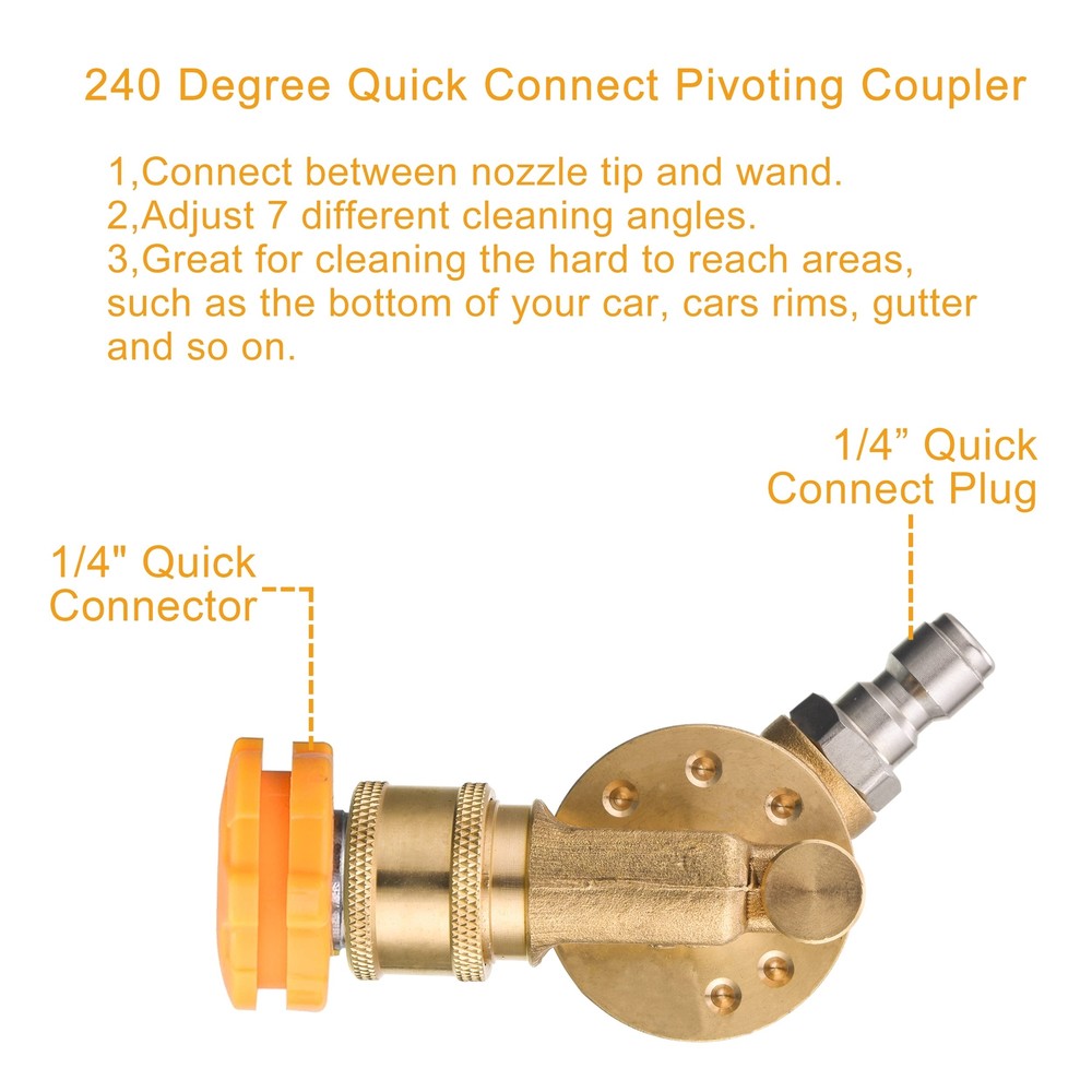 7 Rotation Angles Connecting Pivoting Coupler: The pivoting pressure washer nozzle connects between wand and nozzle tip, and it can adjust 240 degree for 7 different cleaning angles. Great for cleaning the hard to reach areas, such as the bottom of your car, cars rims and gutter. It will save a lot of time and effort. Universal Accessories, High Compatibility: 1/4” female quick connector and 1/4” quick connect plug, the pivoting coupler for pressure washer fits most brands of high pressure washer wands and nozzles. Wear-resistant & Durable: Pivoting pressure washer quick connect coupler is made of brass and stainless steel for greater wear resistance and longer life. Small Size, Big Energy: Angle nozzle for pressure washer working pressure is up to 4500 PSI, can meet your different needs. 1/4” Quick Connect Gutter Cleaner Attachment is used to get the hard-to-reach areas. Easy to carry and store, greatly enhancing work efficiency.