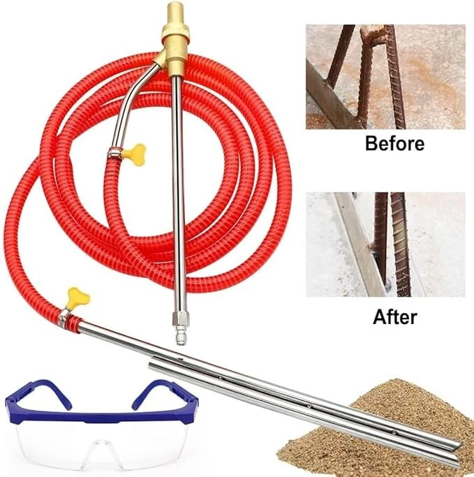 SANDBLASTING PACKAGING KITS: Our pressure washer sandblasting includes 3 m hose, 16 inch pressure washer wand (water input), 15 3/4 inch sand wand (sand input), a goggle, 4 hose clamps, 4 ceramic nozzles, and 2 rubber bands WORKING PRINCIPLE: The pressure sandblasting kit is used to inject sand into the water system for cleaning; Use dry silica sand, baking soda or washed river sand for better results APPLICATION: The pressure washer sandblaster kit is mainly used to remove rust, graffiti, paint and grease baking, and is ideal for household and factory abrasive cleaning UNIQUE PERFORMANCE: Sandblasting kits are made of materials, brass and stainless steel, which are resistant to corrosion, abrasion, and stable performance; It's working pressure can reach 5000PSI and the temperature can reach 60 ℃ / 140 ° F EASY to USE: 1/4 inch quick connector on the end of a gun, suitable for most pressure washer