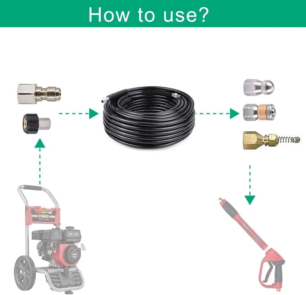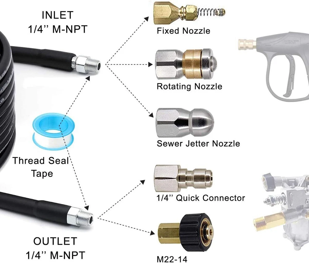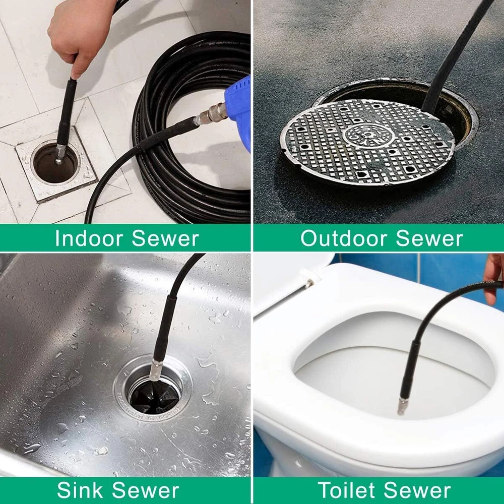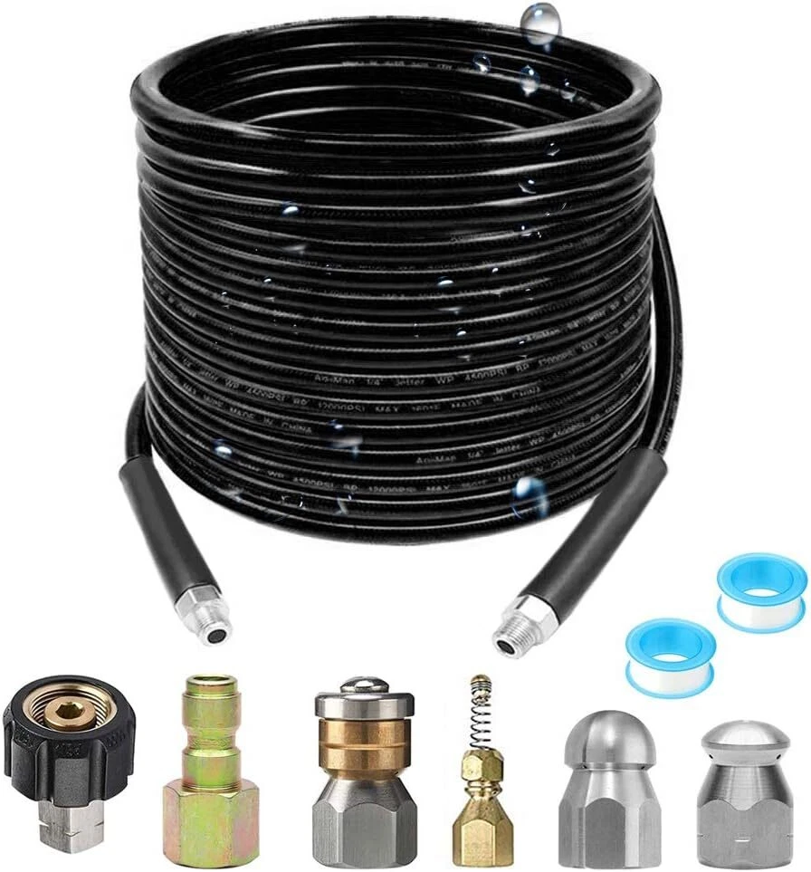 Product Description Pressure Washer Sewer Jetter Kit - 100Ft X1/4" Hydro Drain Jetter Cleaner Hose, Corner, Rotating and Button Nose Sewer Jetting Nozzle Waterproof Tape,Orifice 4.0 4.5,1/4 Inch NPT,5800 PSI SELKIE PRESSURE WASHER SEWER JETTER KIT INCLUDE: Sewer jet hose 100FT X1/4" ,button nose sewer jetter nozzle(front),button nose sewer jetter nozzle(corner),fixed nozzle,rotating sewer jet nozzle,1/4" quick coupler plug,coupler (female M22 to female 1/4" NPT) and waterproof tape.Sewer Jetter parts for Pressure Washer can help you unblock More types of indoor and outdoor drainage devices,combined with any brand of pressure washer,can easily flush obstructions.Working pressure is rated to 5800 PSI. DURABLE DRAIN JETTER HOSE: Sewer spray hose (Max 5800 PSI )has an inner tube, cover and reinforcement. The inner tube of the hose is made of thermoplastic polyester.Cover layer is made of thermoplastic polyurethane, which can resist oil, weather, ozone and abrasion. Reinforcement layer is 1/4" high tenacity polyester textile braid, which is chemically bonded. 6PCS SEWER JETTER NOZZLES: Ideal for general water pipe flushing and cleaning, provides excellent cleaning effect, clean soft sewer blocke. EASY TO USE: Both ends of the hose is 1/4“M-NPT, Sewer Jetter Kit equipped with M22-14 adapter and 1/4" quick connect plug, it can be easily applied to most pressure washer and gun. Nozzles are made of stainless steel or brass, not easy to break or rust. WIDELY APPLICATION: This pressure hose widely used to clean cars, motorcycles, floors, windows, driveways,roofs,siding, sink, toilet, outdoor, indoor and etc. Contact seller directly if any issues, Service Team will respond you within 24 hours during working days. always stand behind our products and customers. About Us We are a reputable seller with many years of experience selling on eBay. Our goal is to provide high-quality products and excellent customer service. Shipping Items will be shipped within 1-3 business days when we received payment. (Orders are not processed on weekends & holidays) Tracking information will be sent once item is shipped. Delivery time depends on destination and other factors Item is shipped to ebay address. Leaving correct address can minimize delay. For international shipping and shipping to Guam, Hawaii and Alaska, Please contact us before placing the order. International buyers please note: Import duties, taxes and charges are not included in the item price or shipping charges. These charges are buyer’s responsibility. We will try our best to reduce the risk of the custom duties. Local pick-up is unavailable at the moment. Contact Us We reply any email messages within 1 business / working days(off-duty at weekend). If you do not get a response from us, then please check your junk or spam mailbox. Our Business hours: Mon-Fri 9:00-18:00, UTC/GMT +8 hours. Please contact us either by clicking "contact seller" in the "purchase history" section or simply click "ask a question" at the bottom of this page. If you are unsatisfied with our item or service, please contact us before leaving any feedback. We are committed to resolve all issues in a friendly and satisfactory manner.