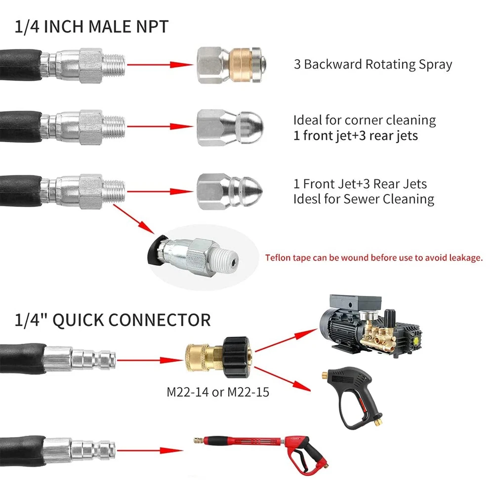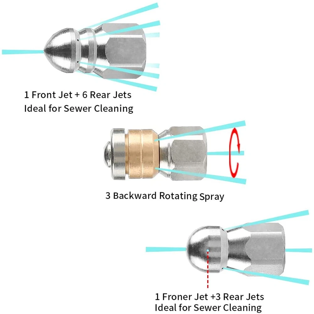 ★【Package List】The sewer jetter kit include 50 FT sewer jet hose, two orifice 4.5 rotating sewer jet nozzle, orifice 4.0 button nose sewer jetter nozzle, M22 female to 1/4 inch female NPT coupler, Teflon tape and nozzle cleaner. ★【Premium Quality】The inner pipe of the water pipe is a high-quality thermoplastic polyester pipe, the reinforcement layer is composed of chemically bonded 1/4 inch high-strength polyester textile braid, and The Non marking and Never kink permanentlylay cover layer is also a thermoplastic polyester pipe, which can effectively deal with wear, ozone, exposure, oil Impact, thereby extending the life of the product. ★【Excellent Design】The sewer cleaning kit includes three different types of nozzles: the button nozzle has one front nozzle at 0° to remove blockages, and three rear nozzles at 33° to wash away loose debris from the front nozzle. The rotating nozzle rotates the three rear nozzles at 33° for shot peening, sprays water into the blocked pipe, rinses and removes debris. Corner sewer jetter nozzle water sideways to clear blockages at the corner, and six rear nozzles for more powerful cleaning. ★【Special Improvement】We provide you with a Teflon tape that can be wrapped around the water pipe to prevent leakage during use. A nozzle cleaning needle can effectively deal with the problem of nozzle clogging. ★【Quality Assurance】 If you encounter any problems during use, please contect with us in any time. We will provide you with the best service.