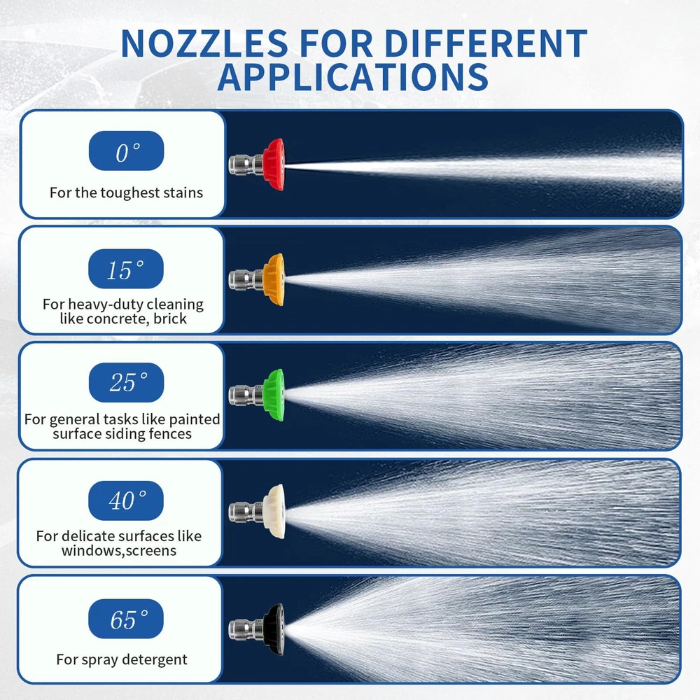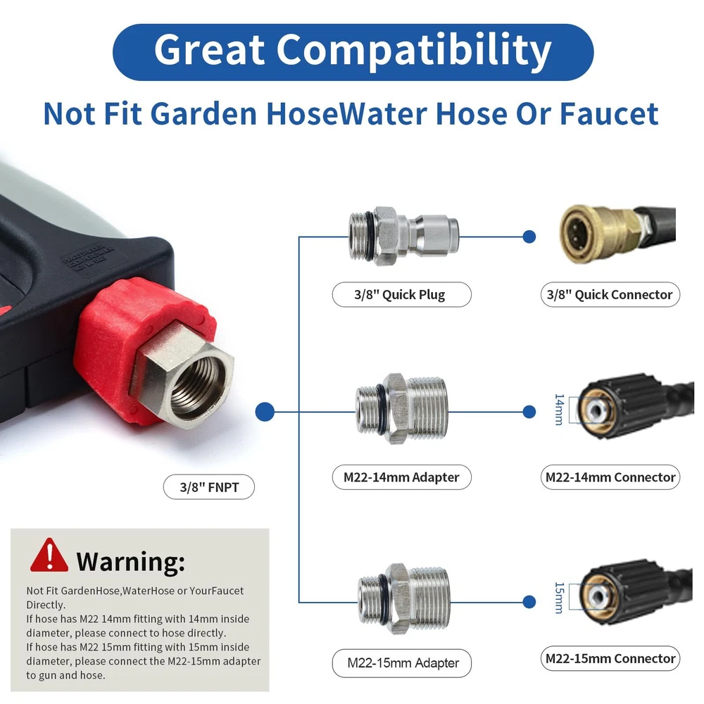 SPECIFICATION: Universal 1/4" female quick connector outlet to with pressure foam cannon, nozzle tips and extension wands .Maximum 5000 PSI and 10.5 GPM. Max temperature for water is up to 150℃ ( 300°F ). HIGH QUALITY MATERIAL:The internal trigger of the power washer is a combination of solid brass and metal poles connector and spool. the exterior is made of high quality plastic, durable in use and rust-proof. ERGONOMIC DESIGN:Hold the pressure washer for long durations without getting tired. The snub nose design makes it easy to maneuver with just hand. Flexible red safe lock key, avoid pulling trigger unexpected, provide safe clean work. 360 DEGREE SWIVEL :Equipped with a 3/8" swivel quick connector,Unique 360° swivel inlet design, able to rotate flexibly, clean your goals from top to bottom without hose tangle, make your pressure washing easier and efficient. SPRAY NOZZLES: 5pcs Pressure washer nozzles with 5 different angle: 0°,15°,25°,40°,65°. They meet your different needs, such as Cleaning Windows, wooden doors, cars, roofs, etc. PACKAGE INCLUDE:Pressure Washer Short ,3/8'' Quick Connector, M22-14mm Fitting ,M22-15mm Fitting,5 Pressure Washer Nozzle Tips. Pressure Washer Not Fit Garden Hose Water Hose or Your Faucet Directly!!! ATTENTION: If hose has M22 14mm fitting with 14mm insidediameter, please connect the M22-14mm adapter to and hose. If hose has M22 15mm fitting with 15mm inside diameter, please connect the M22-15mm adapter to and hose.