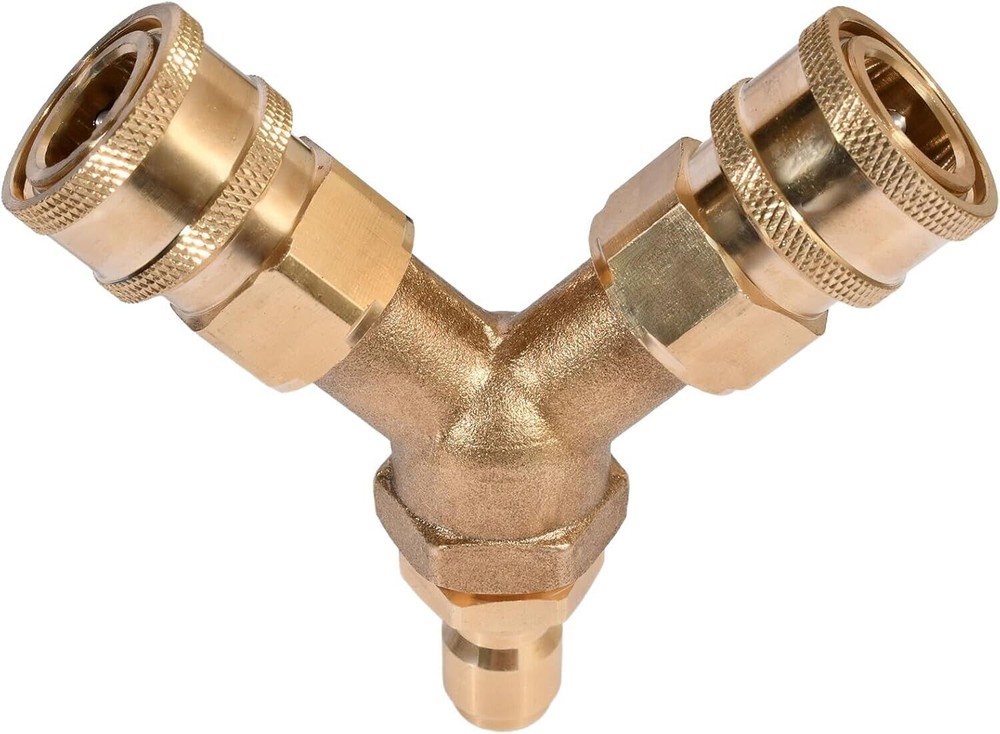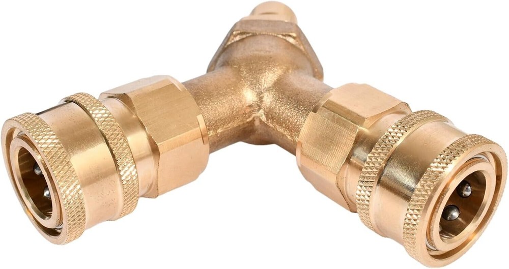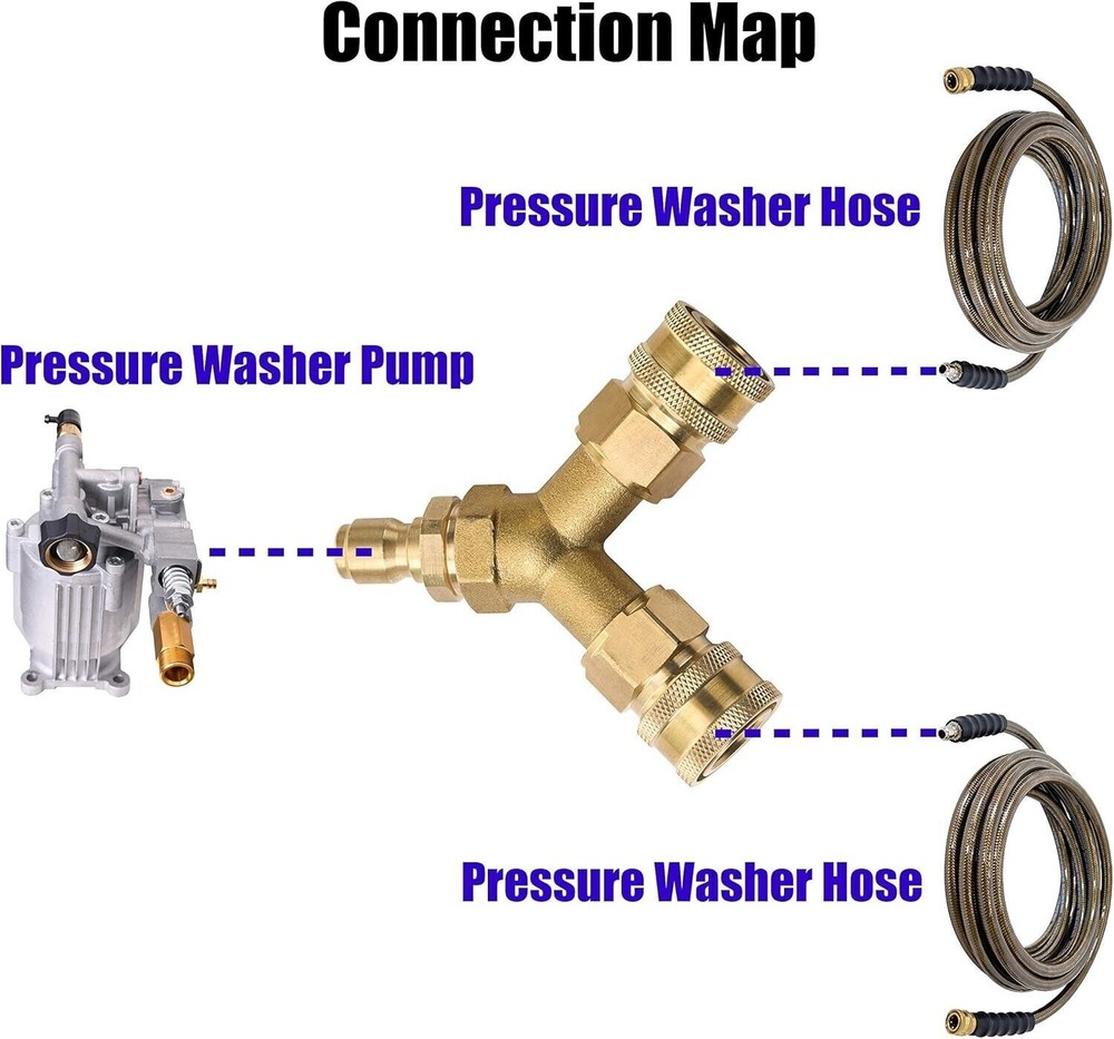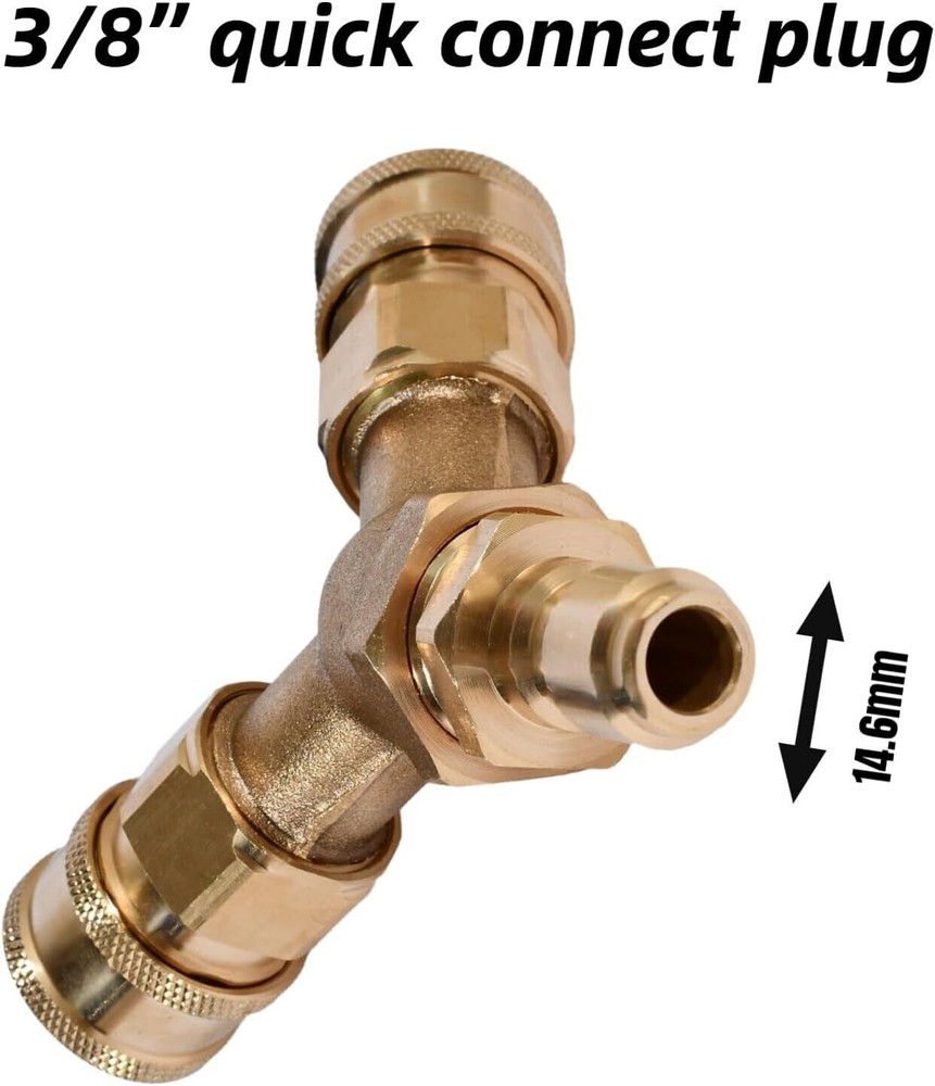 【Specification:】: Y shaped, made of brass,fitting: 3/8’’ quick coupler plug + 3/8’’ quick coupler socket. Working pressure is up to 5000 PSI. 【Quick Connect】: Quick connect this Branch Tee onto the pressure washer outlet, then connect two pressure washer hoses to either end of the 2-gun splitter. Allows for 2 pressure washer users simultaneously. 【Connect Helper】This Two-Gun Tee Coupler converts a one-gun pressure washer into a two-gun system. This is a good way to power wash on a big job if you don't have 2 machines. 【Warm tips】: Ideal for pressure washers higher than 4.0 GPM. When running two guns simultaneously, this coupler splits the GPM between the two guns and it is necessary to change the pressure washer nozzle to achieve desired results. On Mar 10, 2025 at 00:23:11 PDT, seller added the following information: