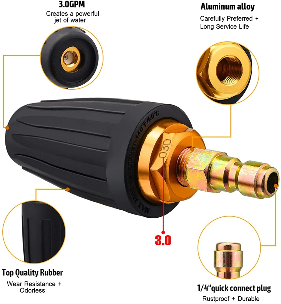 Store New Arrivals Add to Favorite View Feedback Contact Pressure Washer Turbo Tip 3000PSI Turbo Nozzle Kit 360° Rotating Presure Washer Turbo Nozzles 1/4'' Quick Connect with 5 Nozzle Tips Kit Multiple Degrees(0, 15, 25, 40,Soap) 3.0 GPM 3.0 Orifice Description Valve Type turbo valve Inlet Connection Type National Pipe Tapered Outlet Connection Size 0.25 Inches Exterior Finish Aluminum,Rubber,Stainless Steel Material Stainless Steel Maximum Operating Pressure 3.6E+3 Pound per Square Inch Item Weight 6.3 ounces Number of Ports 2 Outlet Connection Type National Pipe Tapered Inlet Connection Size 0.25 Inches Specification Met ASME B16.34 Package Dimensions 5.67 x 4.8 x 1.46 inches Size 1- Turbo Nozzles 【Turbo Spray Nozzle Kit】- The pressure washer turbo nozzle is made of aluminum alloy and a brass 1/4" quick connect plug with a sharp ceramic nozzle and rubber exterior resistant to oxidation and corrosion for better cleaning your garden. 【Powerful Jet of Water】- 1/4" quick connect design, for use with pressure washers up to 3,600 PSI, gallons per minute: 3.0(3 GPM), nozzle orifice size: 3.0, maximum operating temperature: 114°F. Creates 360° powerful jet of water! 【5 Pressure Washer Tip】- 1 Red 0 Degree Nozzle Tip (Stainless Steel), 1 Yellow 15 Degree Nozzle Tip (Stainless Steel), 1 Green 25 Degree Nozzle Tip (Stainless Steel), 1 White 40 Degree Nozzle Tip (Stainless Steel), 1 Black Soap Nozzle (Brass). 【200% Rotate Speed】- Turbo Tip spin in a circular motion (0-degree nozzle is a straight line)at high speeds to increase both the intensity and cleaning area of the nozzle. There is a ceramic ball inside that spins under pressure and the pattern is circular regardless of nozzle position. Turbo nozzles clean up to 40% faster than. 【Clean Any Area】- The Spray Nozzle is ideal for removing a large amount of dirt.Cleaning of soiled bricks, concrete, vinyl, or any other large amount of dirt or heavily soiled areas. It can also strip paint, and it has the ability to damage whatever it comes in contact with. Product Description ABOUT US We offer the best prices around on high quality products. Our E-store includes media such as books, movies, music and games while offering electronics, toys, sporting apparel, clothing, tools, general home, garden items and more. SHIPPING We are always working hard to ensure your package arrives as soon as possible. Please understand that some factors like weather, high postal traffic, and the performance of shipping companies are outside of our control. We offer free shipping to the lower 48 states and ship within 2 business days of payment, usually sooner. We do not accept P.O. Boxes. Please provide a physical address. For shipping outside of the continental USA, we only use eBay's Global Shipping Program.The item is shipped to KY and then sent to the rest of the world. International customers are responsible for all duties and taxes. Continue to check out in order to calculate costs for shipping the item to your country. Messages regarding eBay's Global Shipping Program MUST be directed at eBay EXCLUSIVELY. RETURNS We offer a 30-Day Return Policy on items which you are not completely satisfied with. You have the option for a full-refund or an exchange of the item. No returns are available on items shipped outside of the USA. PAYMENT We accept PayPal. CONTACT US This page content is yet to come Please ad us to your favorite seller and visit again later Thank You CUSTOMER SATISFACTION We try our very best to make sure every customer is completely satisfied. If there's a problem, message us! We're happy to help. WE ACCEPT Copyright © 2021 AutoDS. | All Rights Reserved