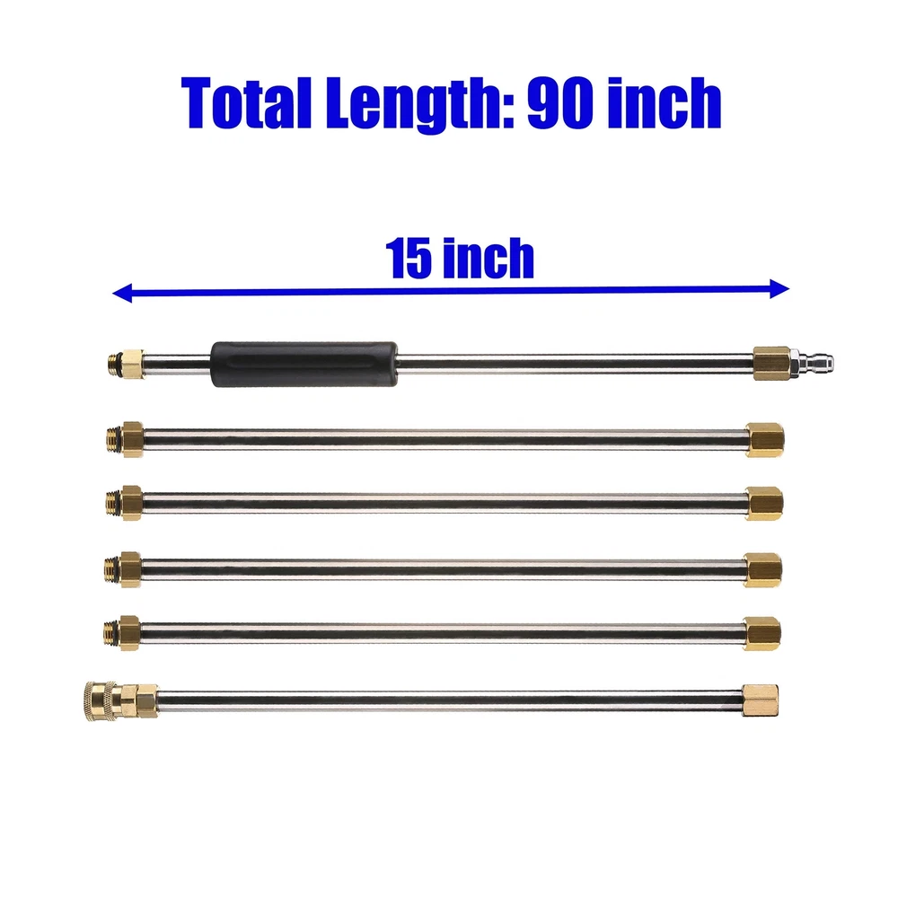 Universal adjustable 7.5 feet Extension Lance for power washer. Adjust the total length of wand freely according to your needs. 6 pcs wands extends to 90 inch of reach. The length of every wand part is 15 inch. Ideal for nozzle, undercarriage cleaner, water broom, surface cleaner and cleaning brushes. Also can used to get the out-of-reach areas such as siding, shutters, windows and more. 1/4’’ female socket connects to these pressure washer parts. 1/4’’ male quick disconnector connects to pressure washer spray . Made of durable stainless steel. The working pressure is up to 4000 PSI.