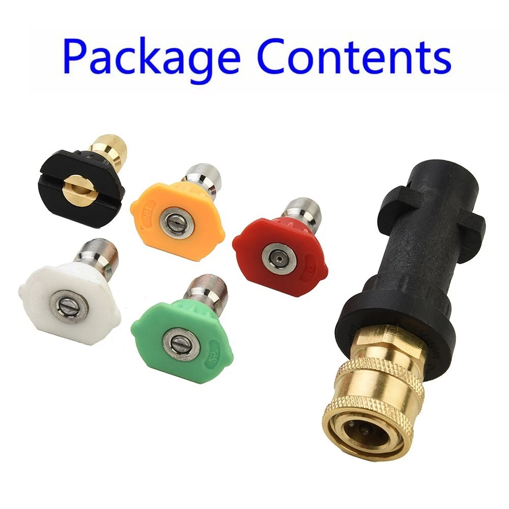 Pressure-Washer Spray Nozzles+ Adapter For K Series 1/4 Quick Connect DESCRIPTION Description: * brand new and high quality. *Made of high quality material, and practical to use. *Pressure Washer Spray Nozzles+ Adapter For for for K Series 1/4 Quick Connect *1 Adapter for for , 1 Black Brass soap nozzle, 1 Red Stainless Steel Nozzle Tip (0 Degree), 1 Yellow Stainless Steel Nozzle Tip (15 Degree), 1 Green Stainless Steel Nozzle Tip (25 Degree), 1 White Stainless Steel Nozzle Tip (40 Degree). *5 Nozzle Tips have different angle (0, 15, 25, 40, soap). You can choose to use different nozzles according to actual needs. Such as cleaning the house, washing the car. They also can be attached to a Quick-Connect Wand for swifter application and more. Nozzles allow you to quickly and easily clean hard-to-reach areas without a ladder. for reaching the bottom of the car, car rims, inaccessible corners, sink cleaning, etc. *5 high pressure washer nozzles are made of high-quality brass and stainless steel with 1/4 '' quick-connect design, pressure up to 4000 PSI. Nozzle orifice size is 3.0, It can be used in combination with a foam. All of our nozzles are high quality, long-term work, environmentally friendly, . *1/4 inch internal thread quick connector is made of brass, which can prevent rust and . 1/4 inch quick link design can realize faster application, easy to connect and disassemble. *Watering equipment is for quick cleaning of large vehicles such as RVs, watering equipment, agricultural equipment, spraying on plants such as trees, and cleaning a wide range of ground. Package includes: 1*Adapter+5*Nozzle Note: 1. The real color of the item may be slightly different from the pictures shown on website caused by many factors such as brightness of your monitor and light brightness. 2. Please allow slight manual measurement deviation for the data. POLICES Shipping Payment WARRANTY We only ship to confirmed ebay Order addresses. Please comfirm that your Order address is in line with your shipping address. Please kindly note that the c ombined shipping is not provided because the shipping fee is calculated by weight. Also, the each additional item means exactly the the same color and size. It takes about 7 -15 working days to US; about 10-30 working days to other countries. Transit time may be a little delayed because of the bad weather and customs inspection . If you do not receive your item within 30 working days since payment finished, please contact us immediately for further assistance. Payment must be completed within 5 days. If you have any problems about payment, please contact us via ebay message. We strive for 100% customer satisfaction! Positive Feedback is very important to us. If you have any questions, p lease feel free to contact us via "Ask seller a question" . We will reply your email within 24 working hours.