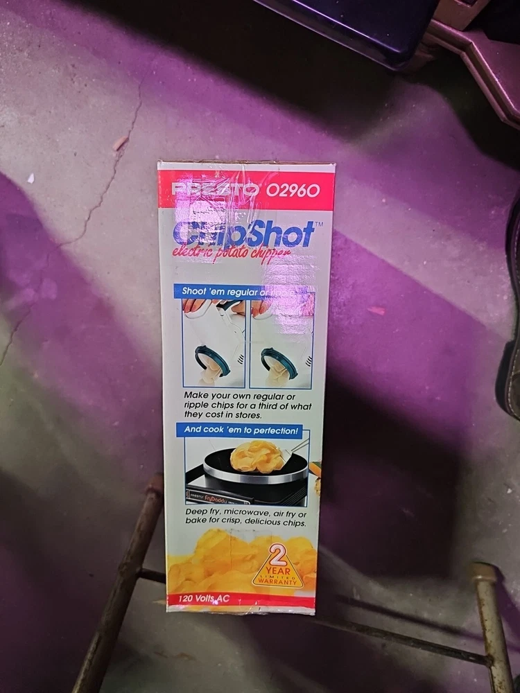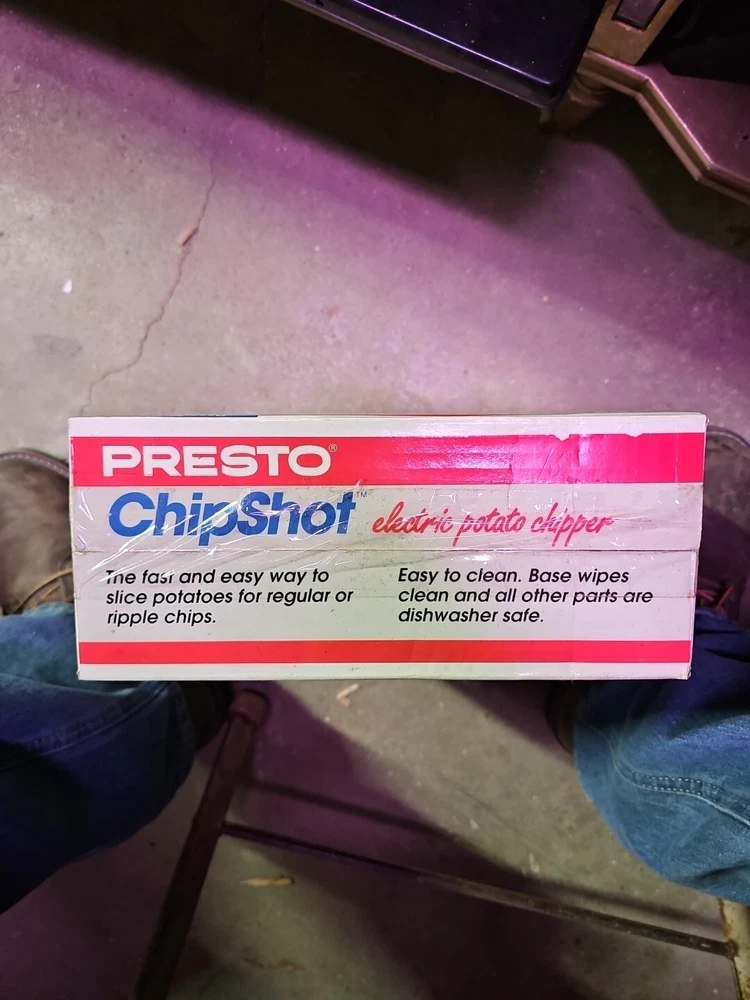Introducing the Vintage Presto Chipshot Electric Potato Chipper, a versatile kitchen tool that peels, slices, and dices potatoes with ease. This machine comes in a sleek white color and is made of durable stainless steel and plastic. It features interchangeable blades/discs that allow you to create your favorite potato shapes and sizes. The Presto Chipshot is perfect for those who love to make their own potato chips at home. With this electric potato peeler and slicer, you can create thin or thick chips, and even create other snacks like French fries and potato sticks. The machine is easy to use and comes with a base, potato peeler, slicer, and interchangeable blades/discs.
