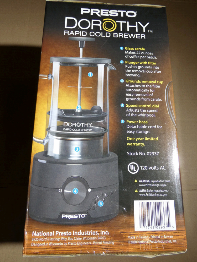 Color:BlackWater Tank Capacity:22 ozCapacity:22 ozMPN:02937Type of Coffee Made:Cold BrewFeatures:Dishwasher Safe PartsPower Source:Wall Plug-inType:Cold BrewModel:02937Coffee Type:Ground Coffeegtin13:075741029375UPC:075741029375Brand:PrestoVoltage:120 V ACNumber of Cups:2.75
