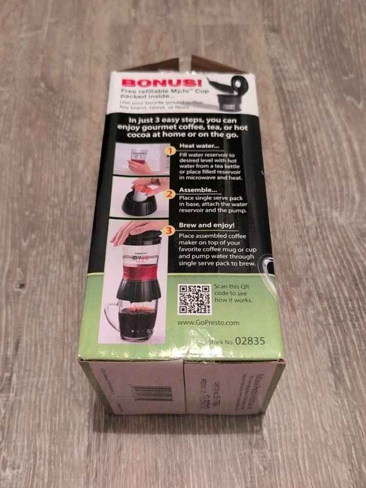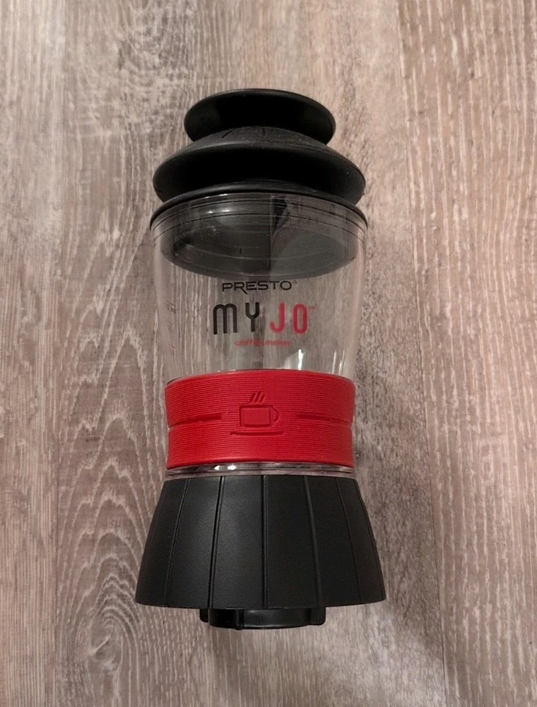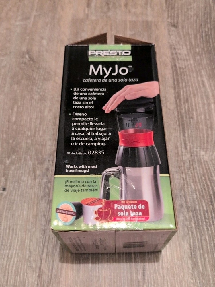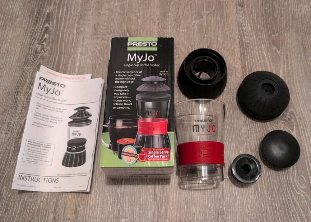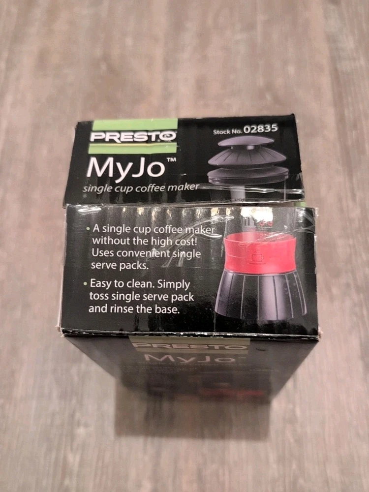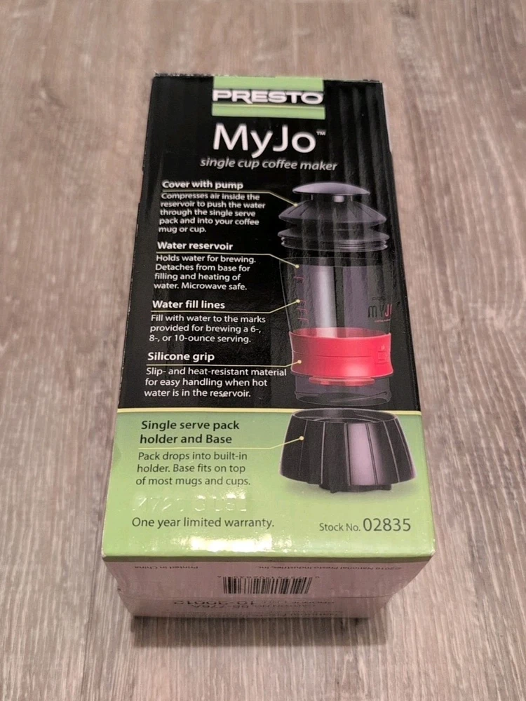 Lightly used. In excellent condition. The Presto MyJo Single Cup Coffee Maker 02835 is a compact and convenient coffee maker that can brew a single cup of coffee using pod technology. With a sleek clear, black, or red design, this manual coffee maker is easy to clean and made from durable plastic and rubber materials. The Presto brand is known for quality and reliability, making this single-cup coffee maker a practical choice for any home kitchen.
