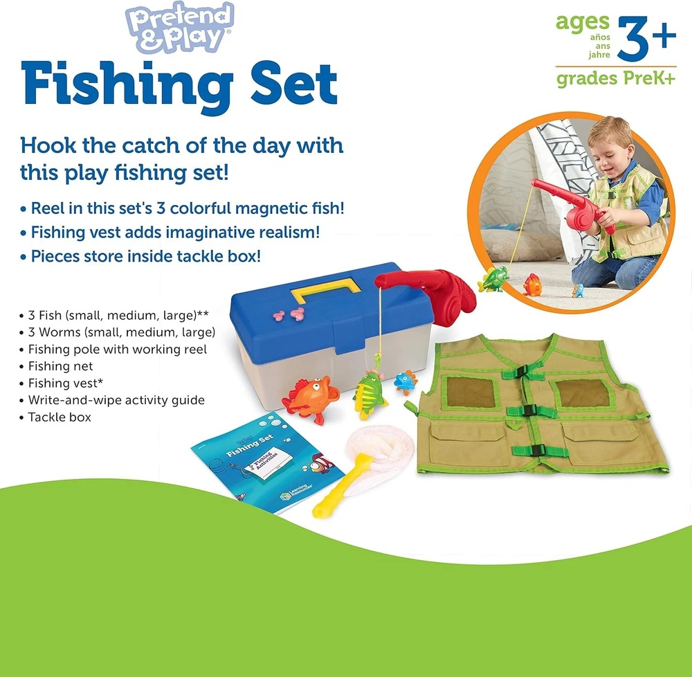 Pretend & Play Fishing Set - 11 Pieces, Ages 3+ Toddler Pretend Play Toys, Preschool Learning Toys, Fishing Pole for Kids, Fisherman Costume FINE MOTOR SKILLS: Encourage imaginative play, fine motor skill growth, hand-eye coordination and social skills FISHING TODDLERS: With an embedded magnet, kids can play hooking the catch of the day – all day FISHING POLES FOR KIDS: The 11 piece set includes tackle box, vest, fishing pole, 3 fish, 3 worms, fishing net and activity guide Tackle box measures 13”L x 7”W x 6”H GIVE THE GIFT OF LEARNING: Whether you’re shopping for holidays, birthdays, or just because, toys from help you discover new learning fun every time you give a gift! Ideal gift for Halloween, Christmas, Stocking Stuffers or even for Homeschool. Your child can wear the adjustable vest while using a fishing pole with magnetic hooks or a net to catch 3 sizes of fish. Magnets that are embedded for safety. 11 pieces store in the sturdy plastic tackle box. Includes a handy activity guide that features 6 pages of fishing themed activities. From the Manufacturer Reel in the big one. Little anglers can hook the catch of the day. Adjustable vest makes play even more realistic. Perfect for outdoor vacations and more. Play a size matching game with worms and fish. Features 6 pages of write and wipe, fishing-themed activities. Plastic pieces include pole with magnetic hook, 3 magnetic fish, 3 worms, net and vest (plastic, nylon and canvas). All magnets are embedded for safety. Plastic tackle box stores all pieces and measures 13"L x 7"W x 6"H. Ages 3 and above.