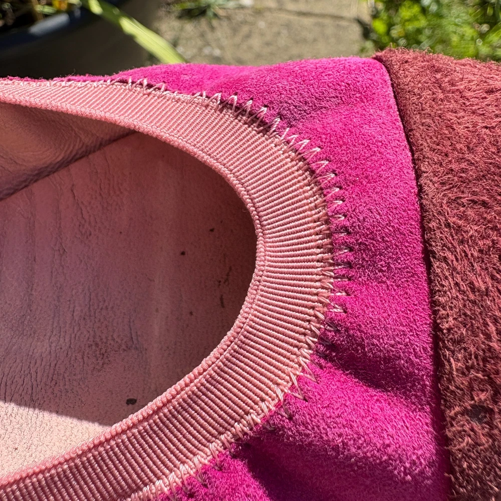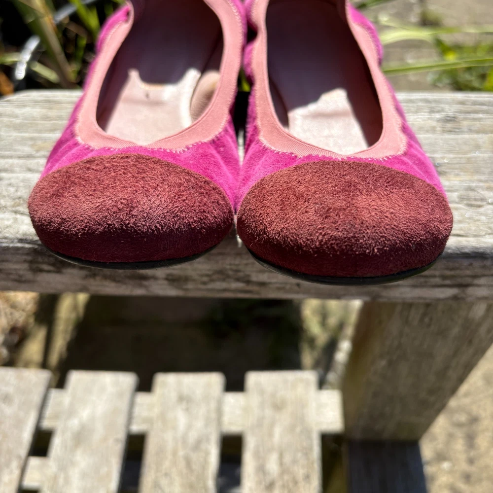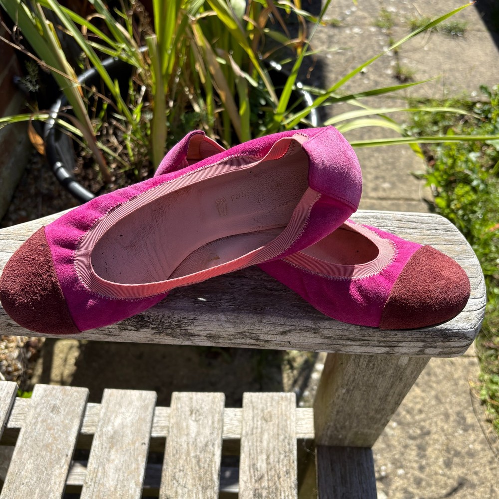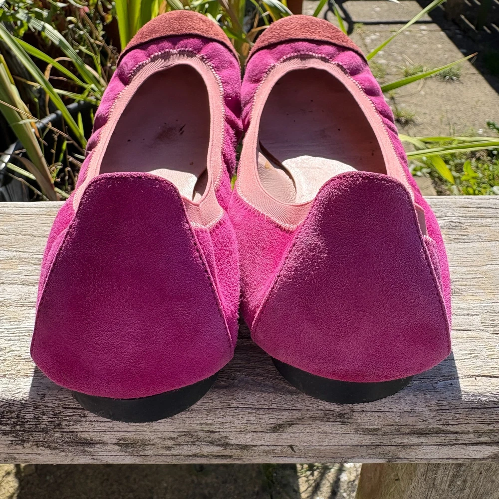 Shocking pink suede with maroon suede toecaps. Pink elastic around the edges, Very comfortable can be folded and carried in a handbag.