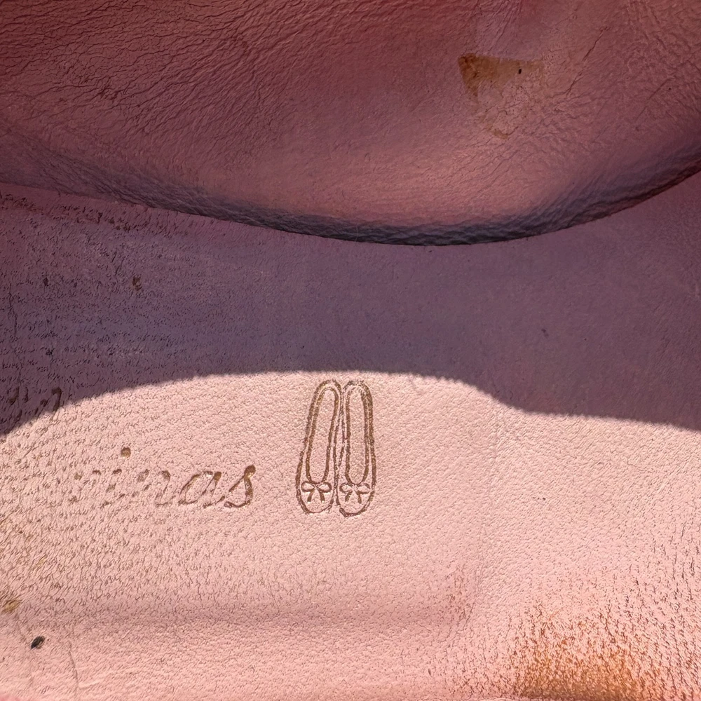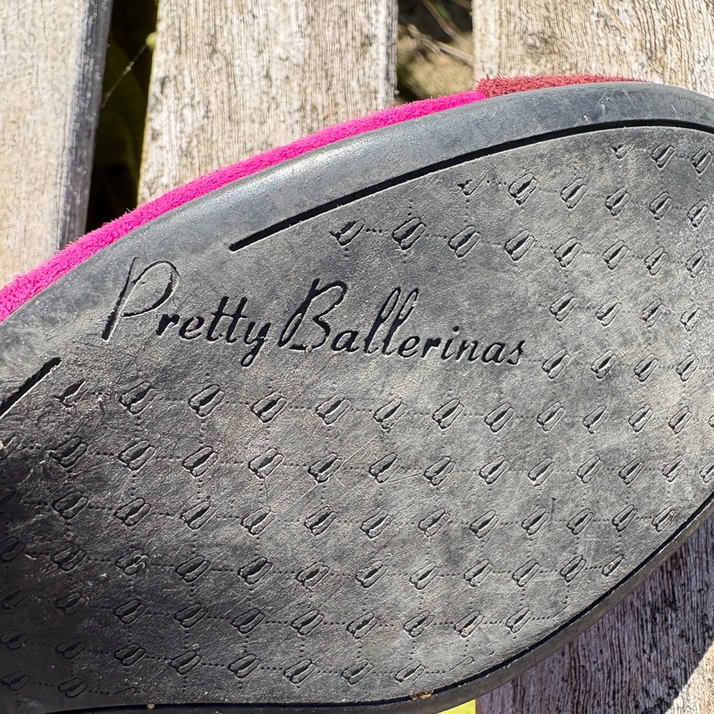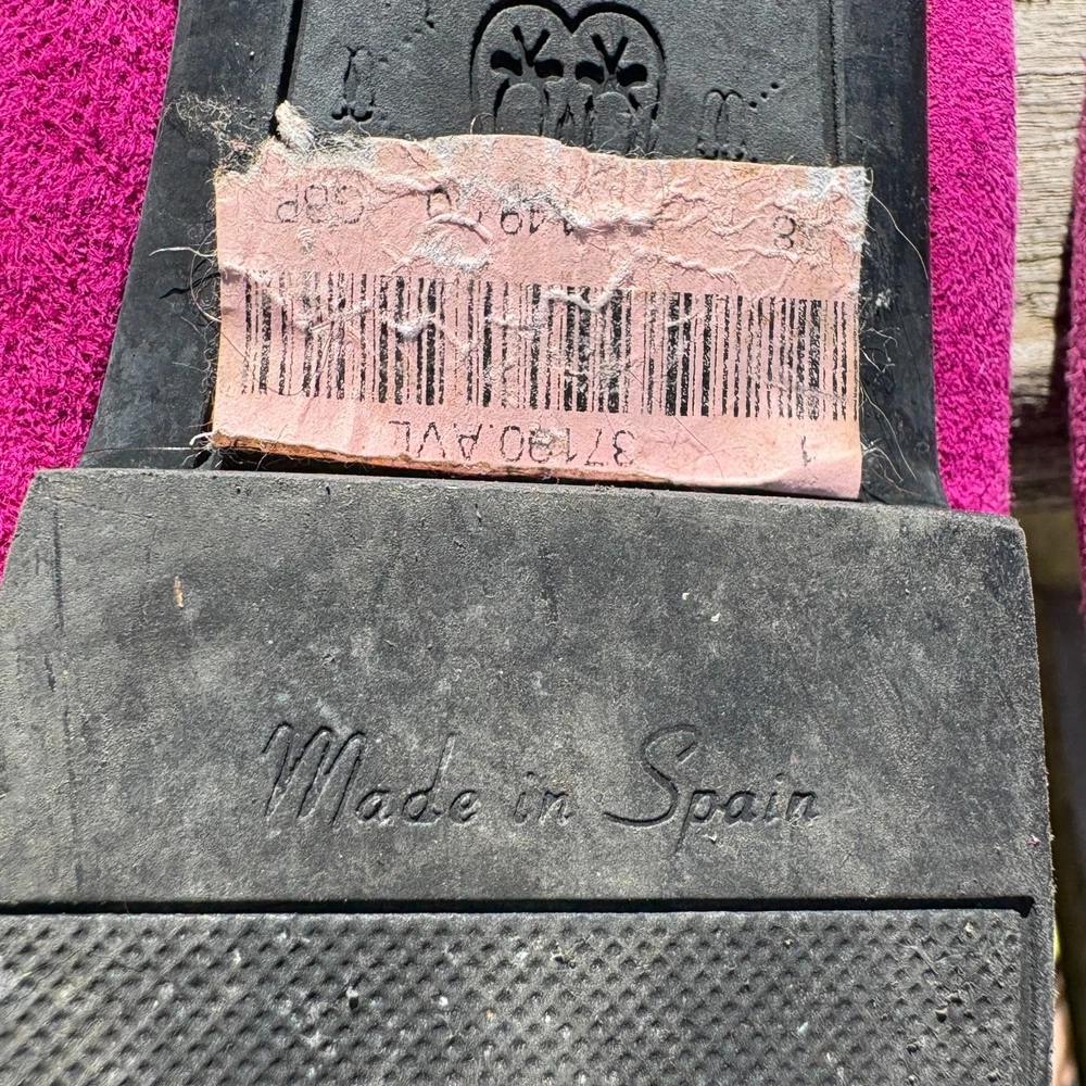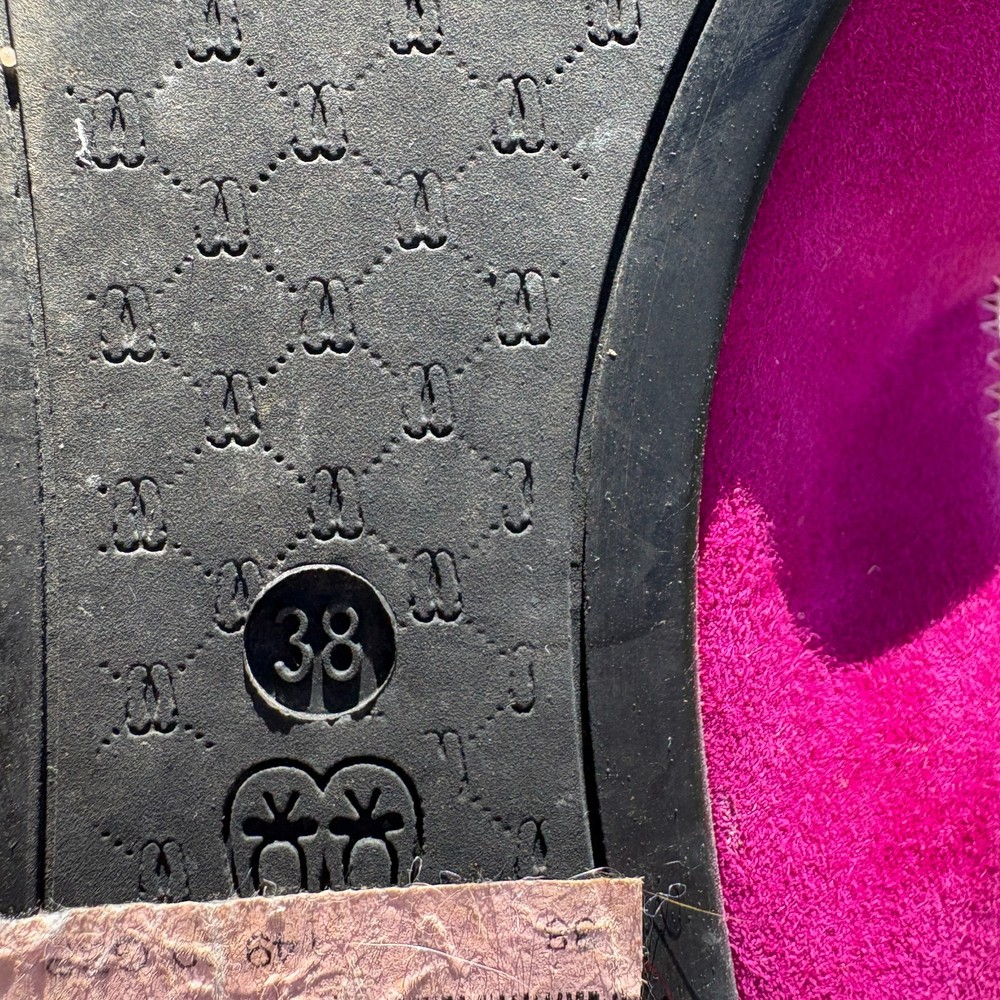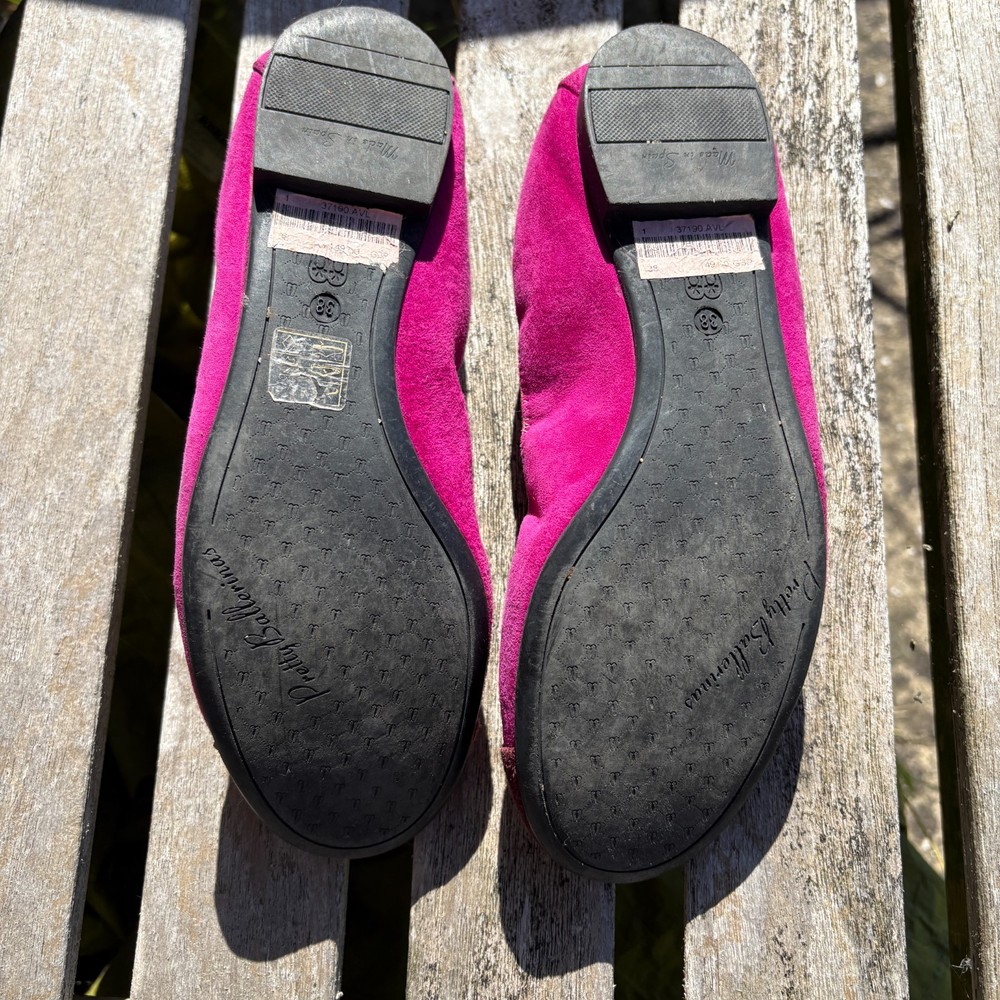 Shocking pink suede with maroon suede toecaps. Pink elastic around the edges, Very comfortable can be folded and carried in a handbag.