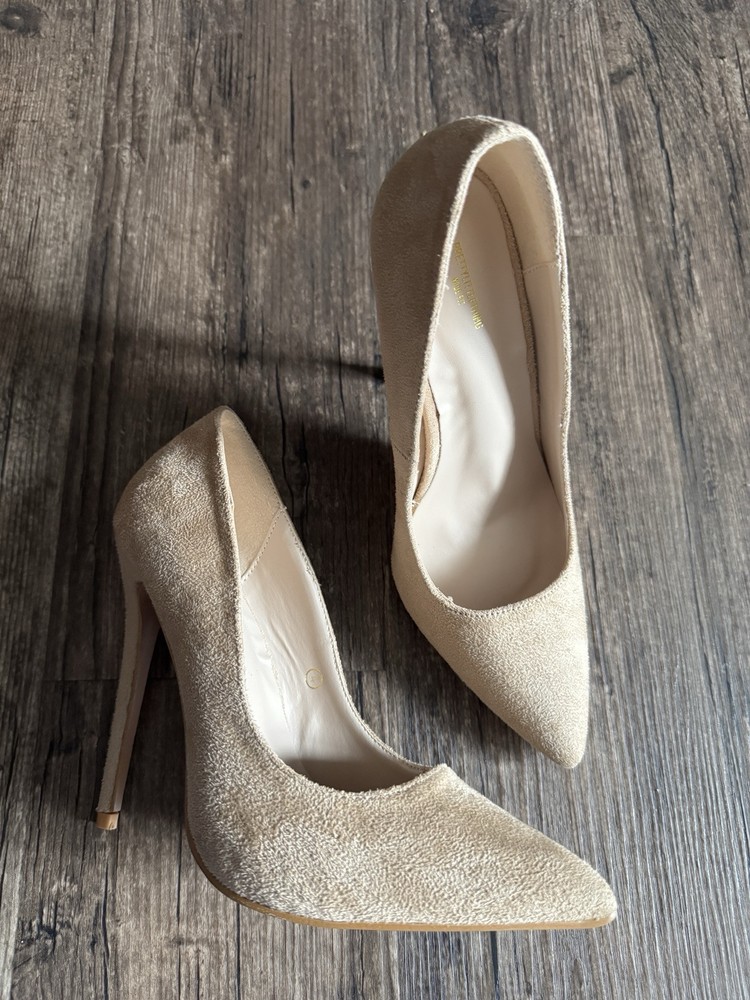 Nude wide fit court pump stiletto from Pretty Little Things. Brand new without box- not worn at all. Material is suede velvet.