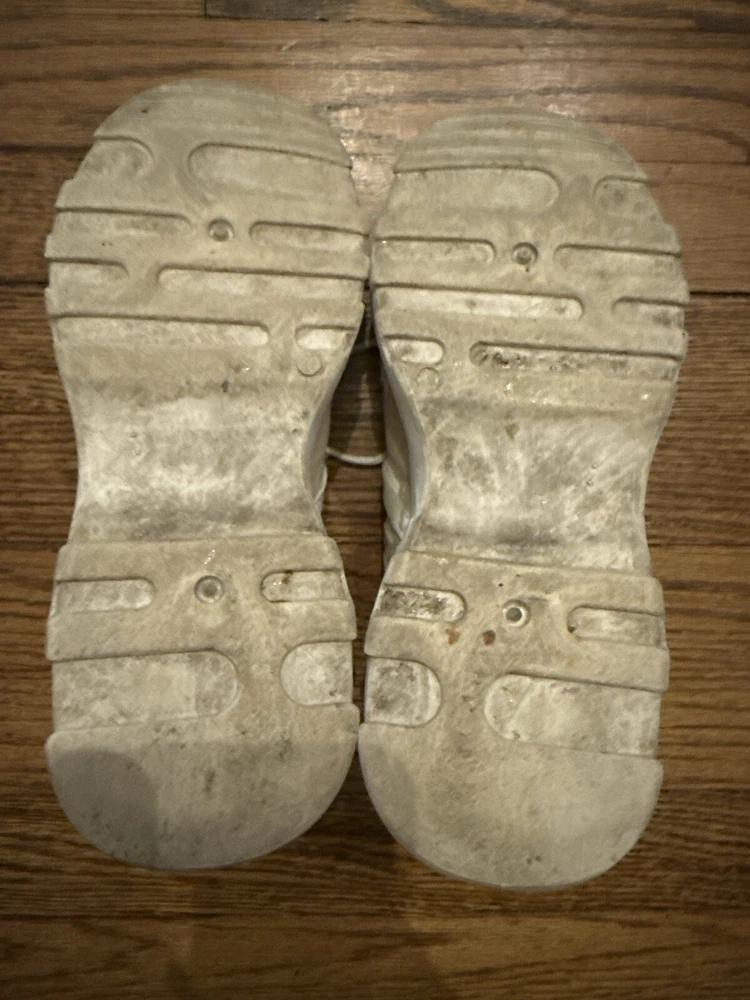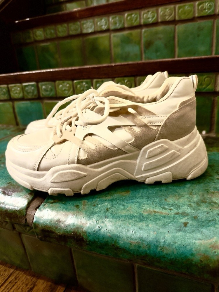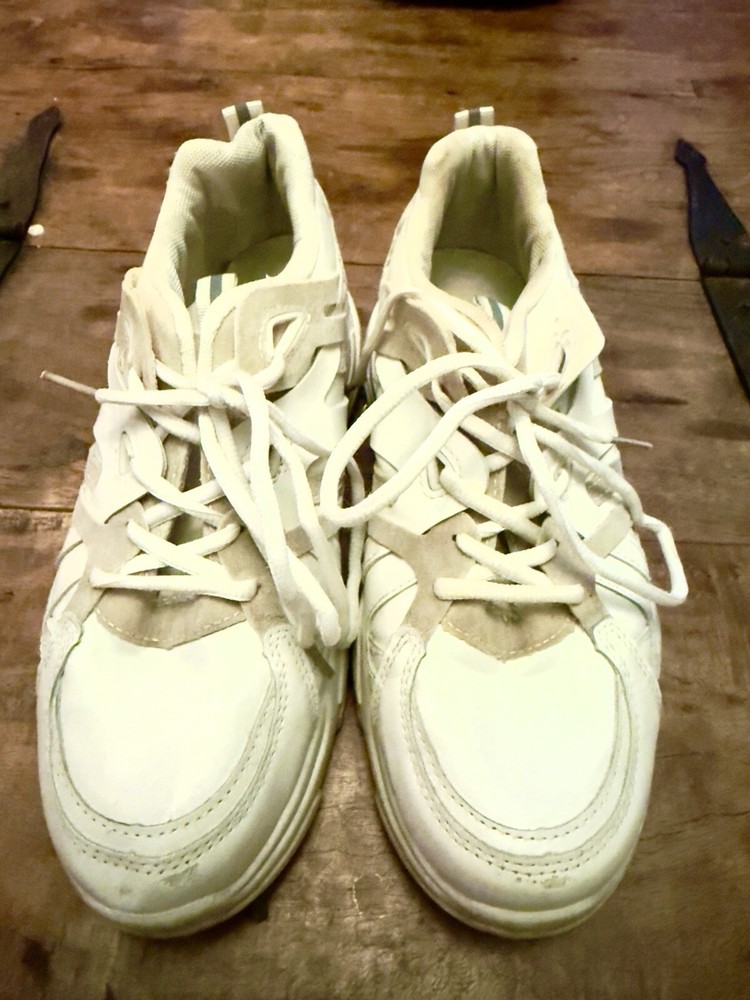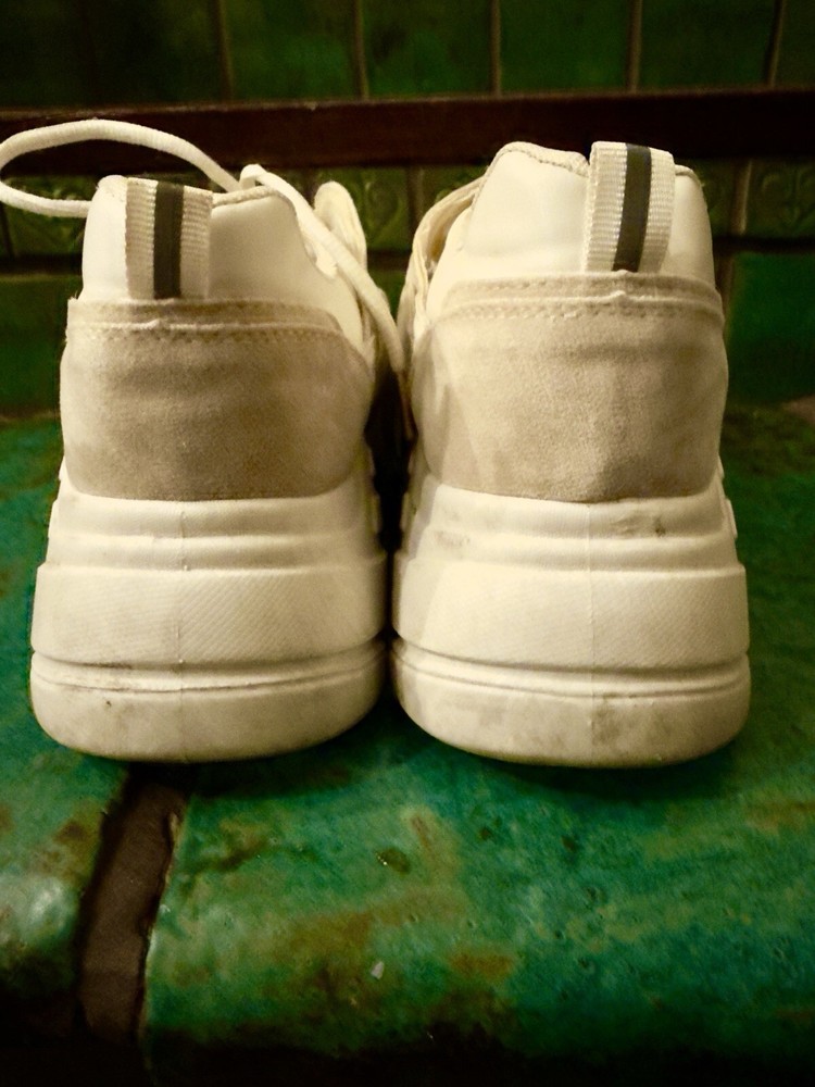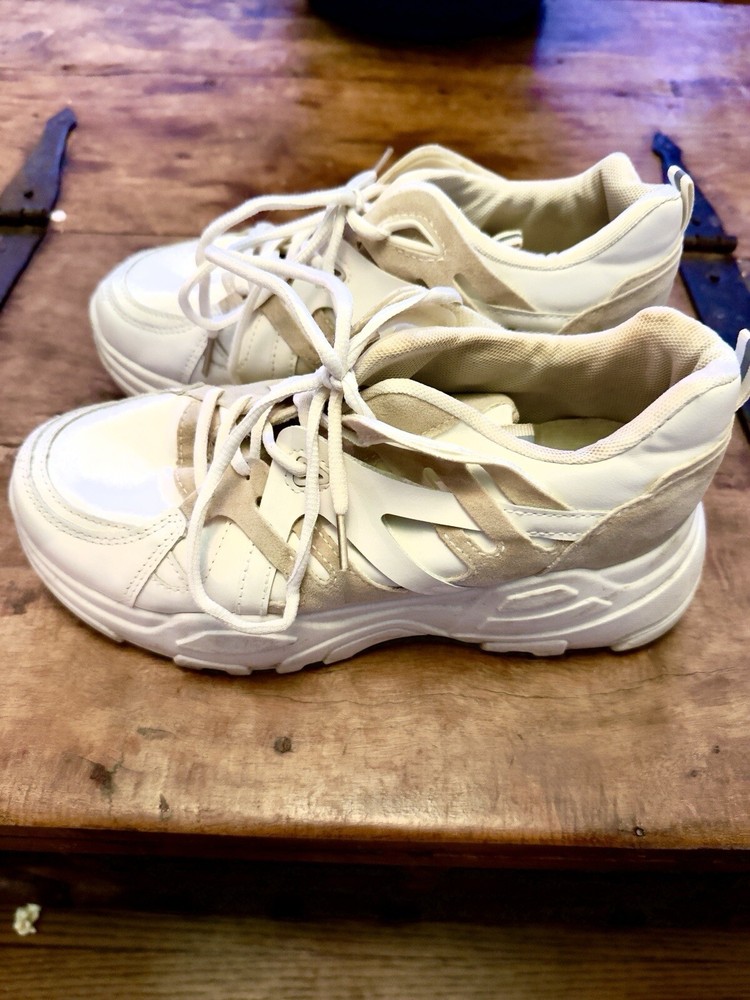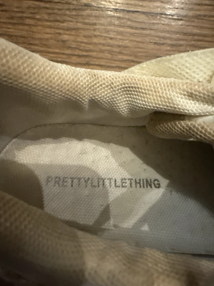 Pretty Little Thing Tennis Shoes Women/Teen Size 8 Crème with beige trim See pics for minor marks, scuffs. Shows signs of wear. Bottom of shoes darkened. Not washed but can be put in washer for a cleaner look. Good condition.
