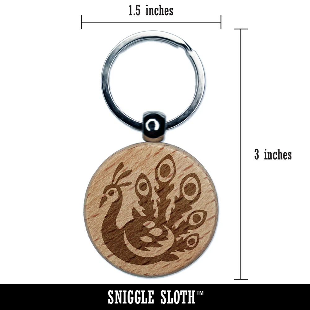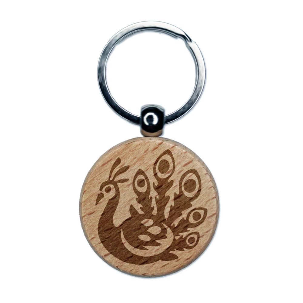Pretty Peacock Engraved Wood Round Keychain Tag Charm