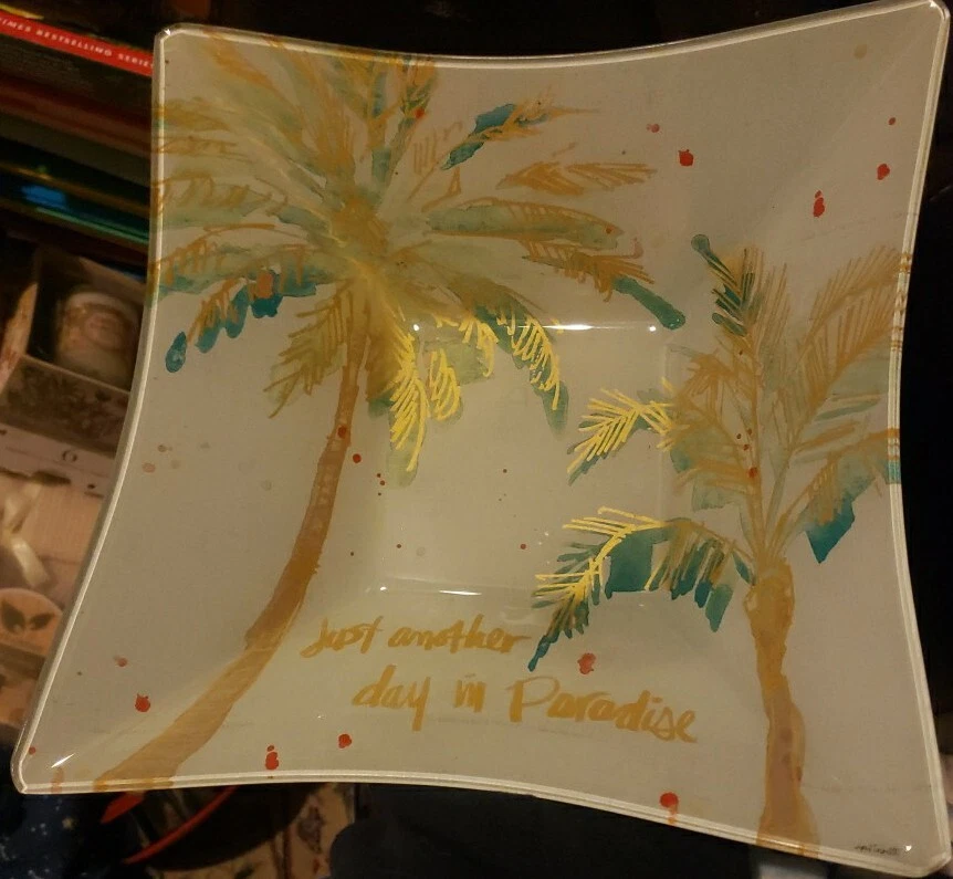 Add a touch of paradise to your dining table with this stunning Prima Design glass square bowl. The colorful multi-color theme and whimsical "Just Another Day In Paradise" message make this bowl a unique and eye-catching addition to your serveware collection. Made of high-quality glass and measuring 10.75 inches in width, this bowl is perfect for serving salads, snacks, or desserts. It is handmade and signed, adding a personal touch and making it a great gift option. The square shape and 3.5 inch depth of the bowl add to its functionality, making it perfect for both casual and formal occasions.